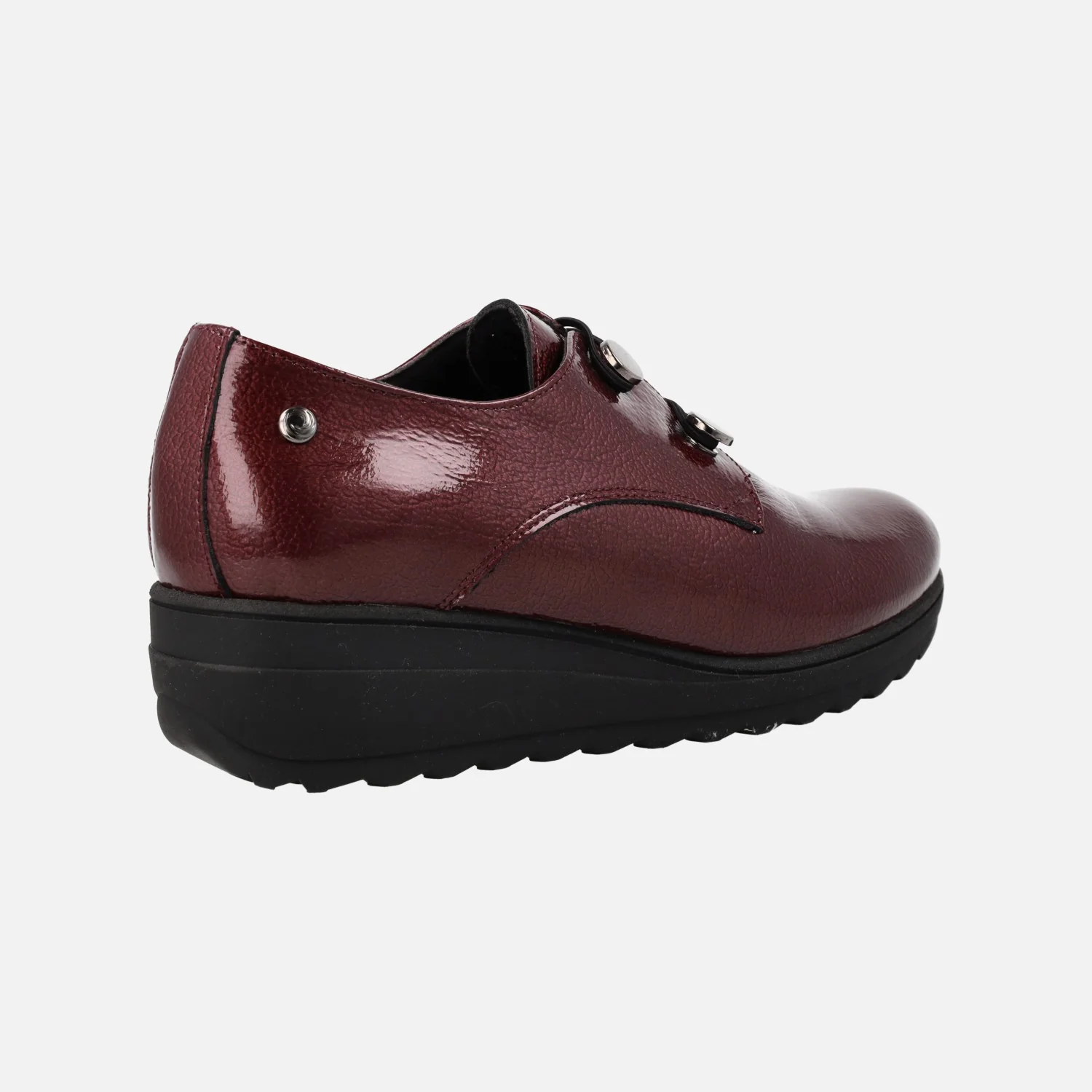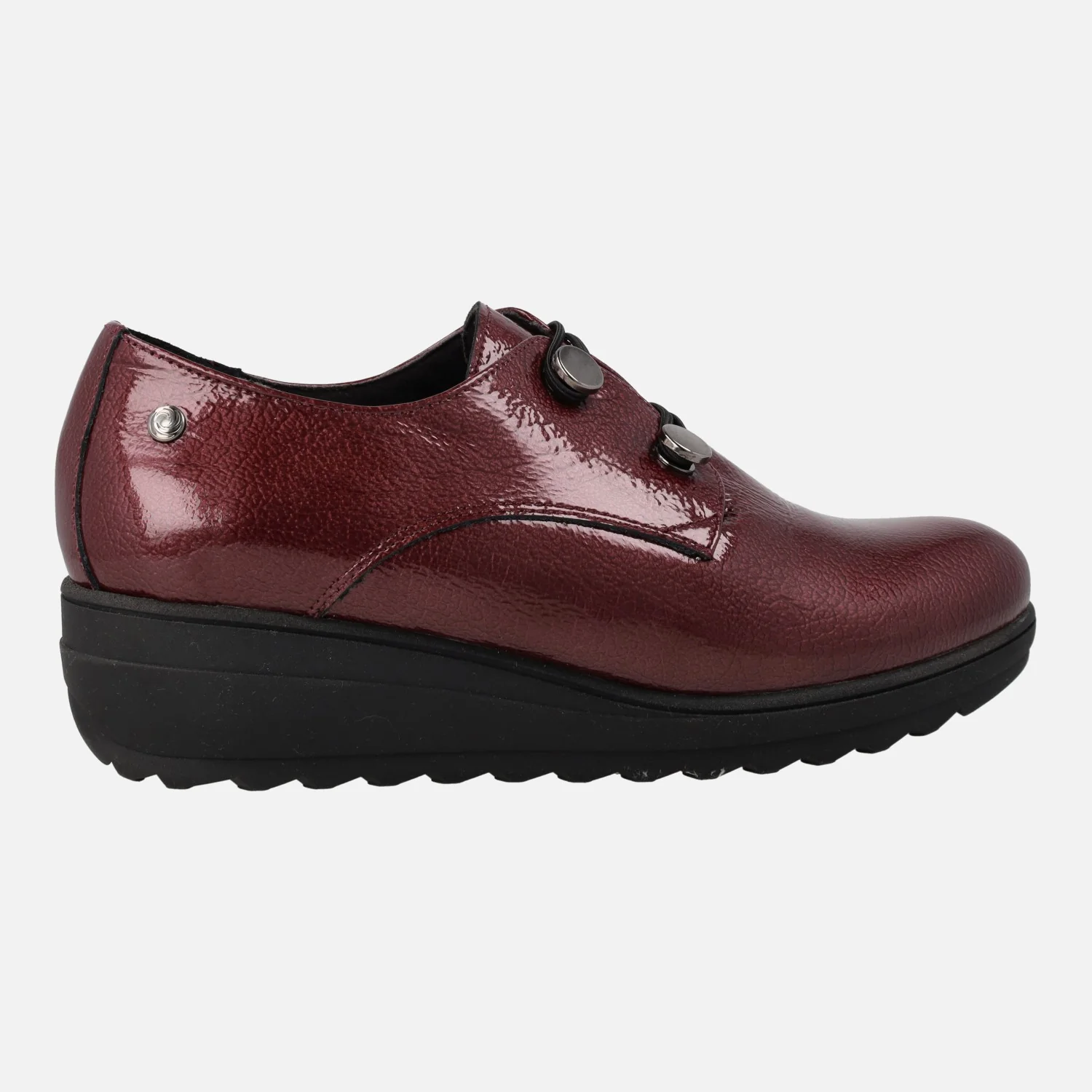 Zapatos confort para mujer de la marca Kaola, modelo 5053, disponibles en burdeos y en gris antracita. Zapatos de piel charol, con cierre de gomas elásticas que van a dos botones metálicos. Interiores de piel, con plantillas extraíbles. Piso de goma, con cuña de 4,5 cms de altura (2 cms parte delantera).