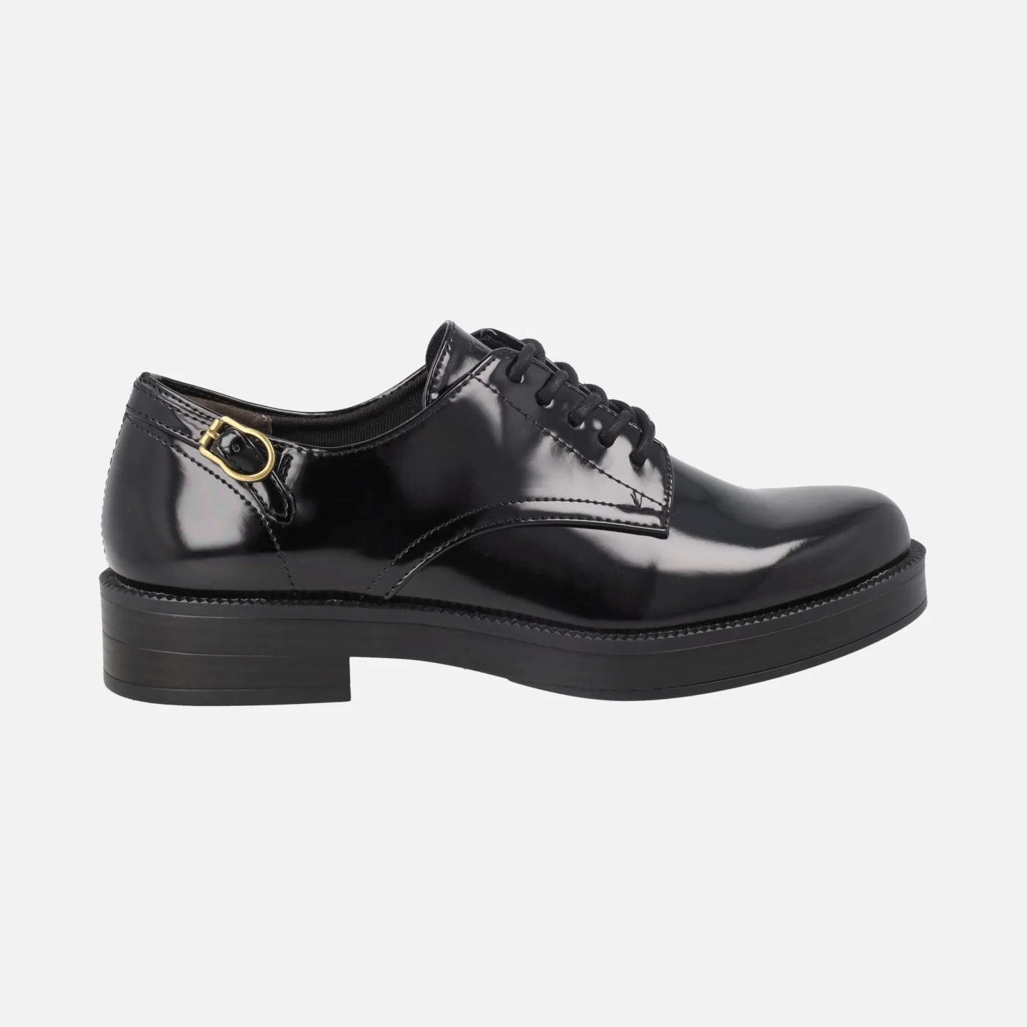 Zapatos de cordones estilo blucher, para mujer, marca Tamaris, modelo 1-23348-45 001 Black. Zapatos elaborados en materiales sintéticos, acabado florentik brillo. Cierre de cordones. Adorno de hebilla dorada en el lateral exterior. Interior mixto en tejido y otros materiales. Piso sintético, con tacones de 3 cm y 2 cm de plataforma delantera.
