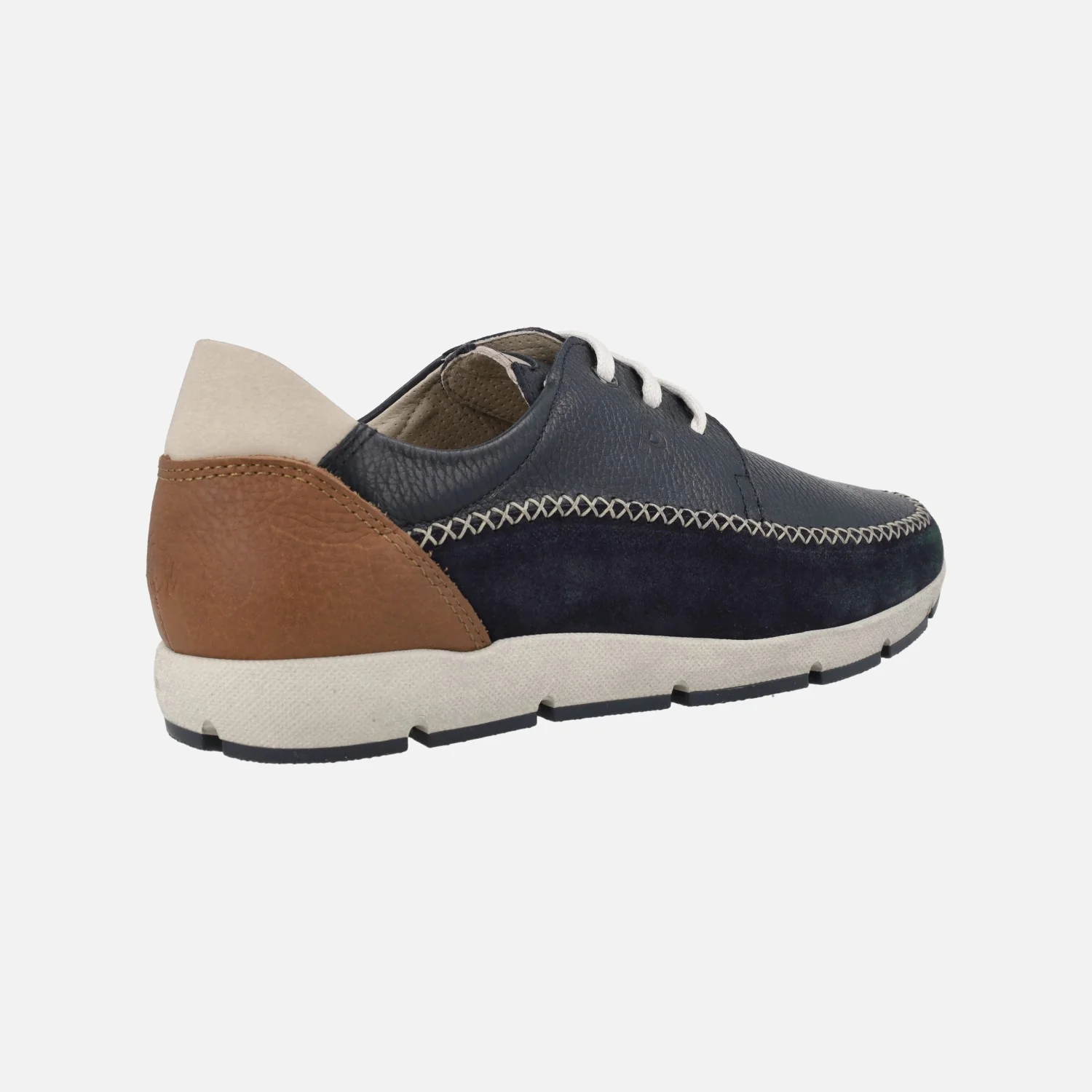 Zapatos de cordones para hombre de la marca Pitillos, línea Ricardo Hernandez, modelo 40121 Marino. Zapatos confort, elaborados en piel azul marino, combinada con piezas en serraje azul y piel cuero. Detalle de pespunteado a la vista. Cierre de cordones textiles. Interior textil. Piso de goma.