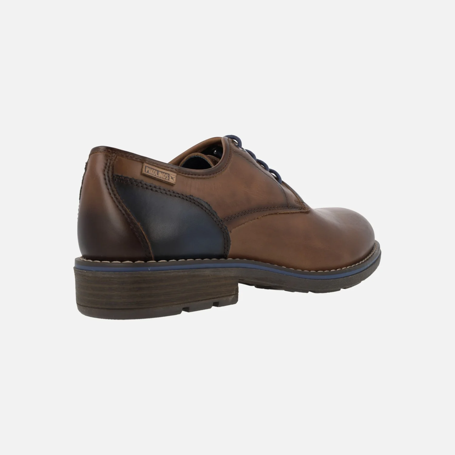 Zapatos de cordones para hombre estilo blucher de la marca Pikolinos, modelo YORK M2M-4178 Cuero. Zapatos elaborados en piel cuero con pieza de talonera, cordones y detalles en el piso en color azul marino. Interior mixto de piel y tejido. Plantillas acolchadas extraíbles. Piso de goma.