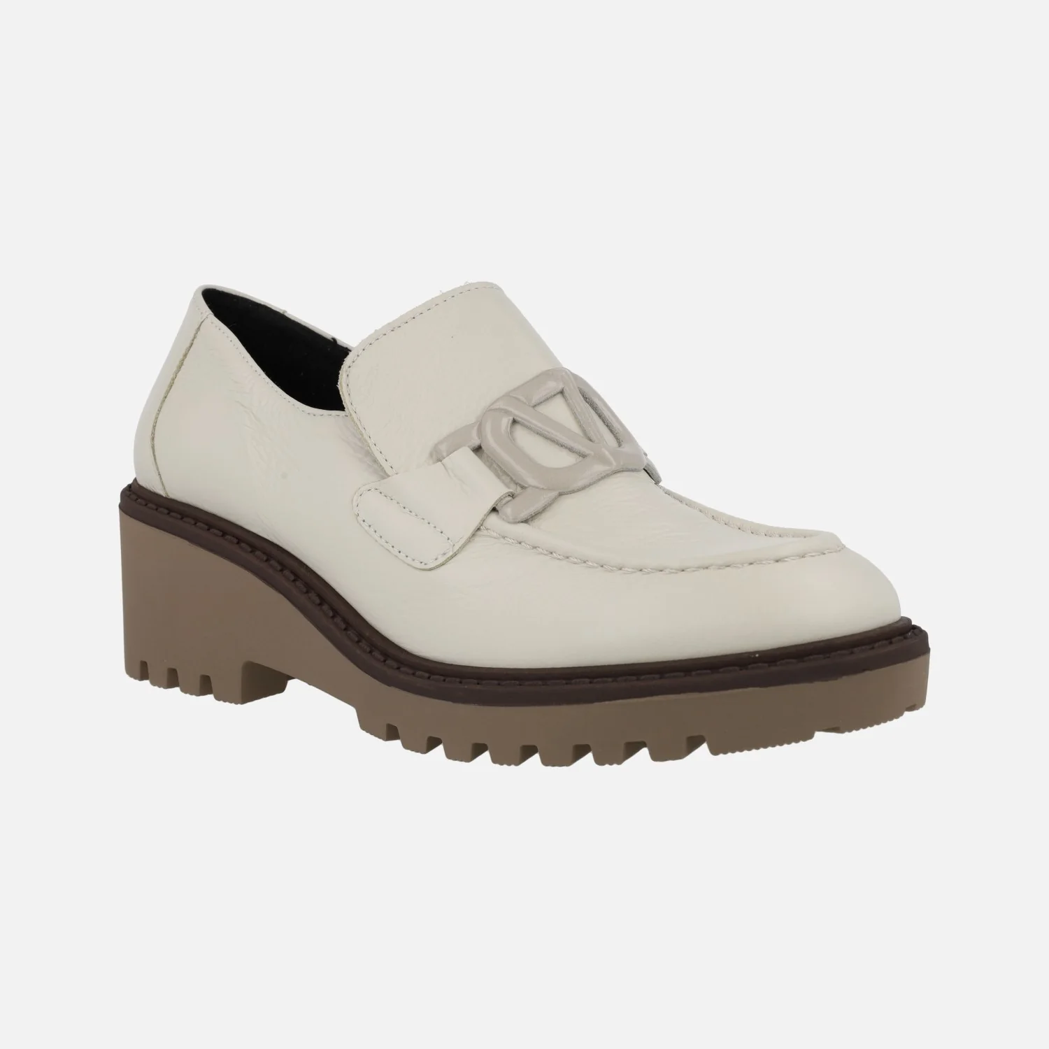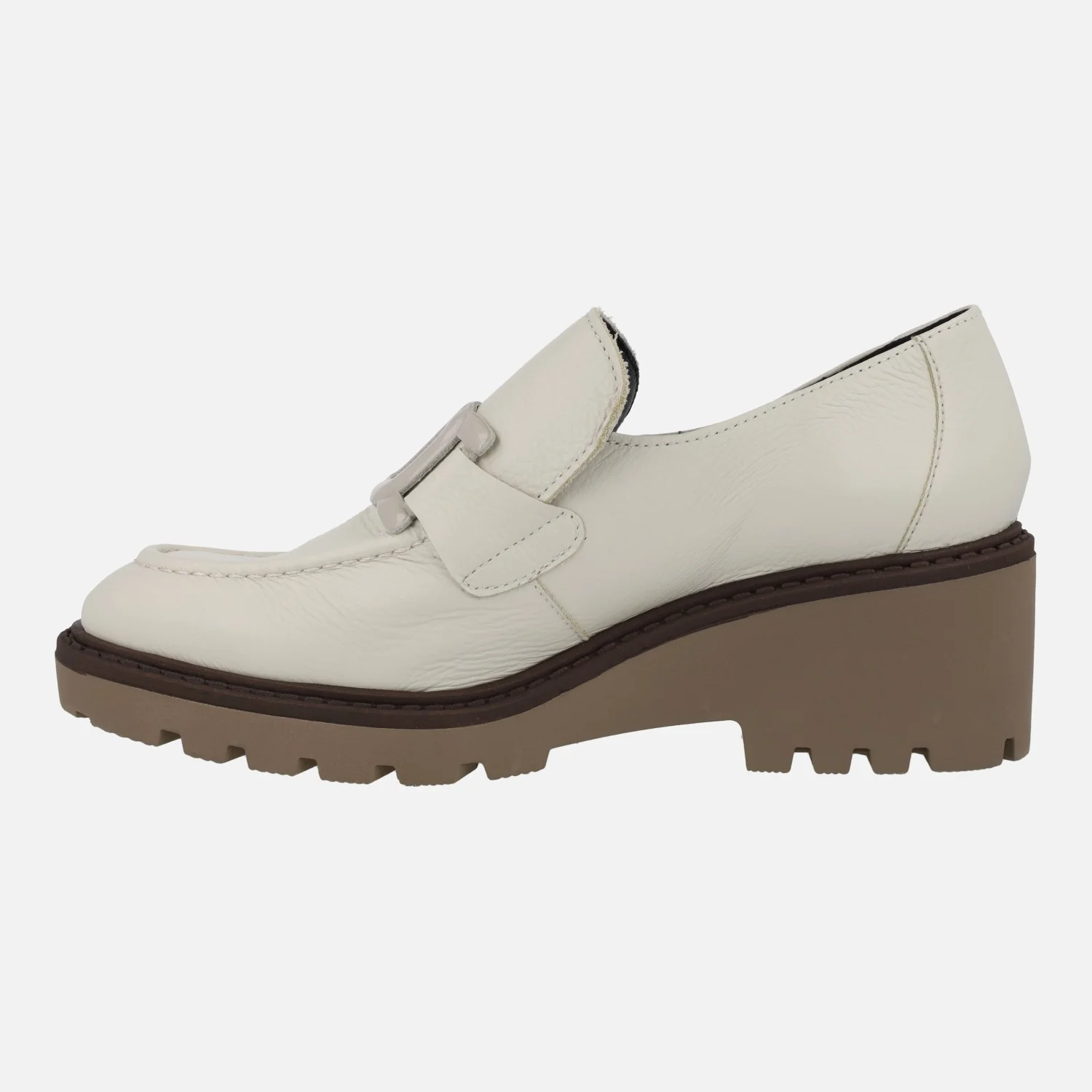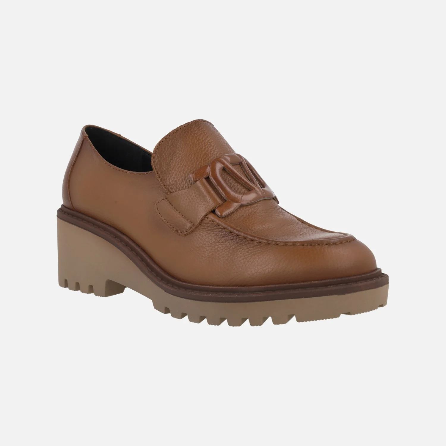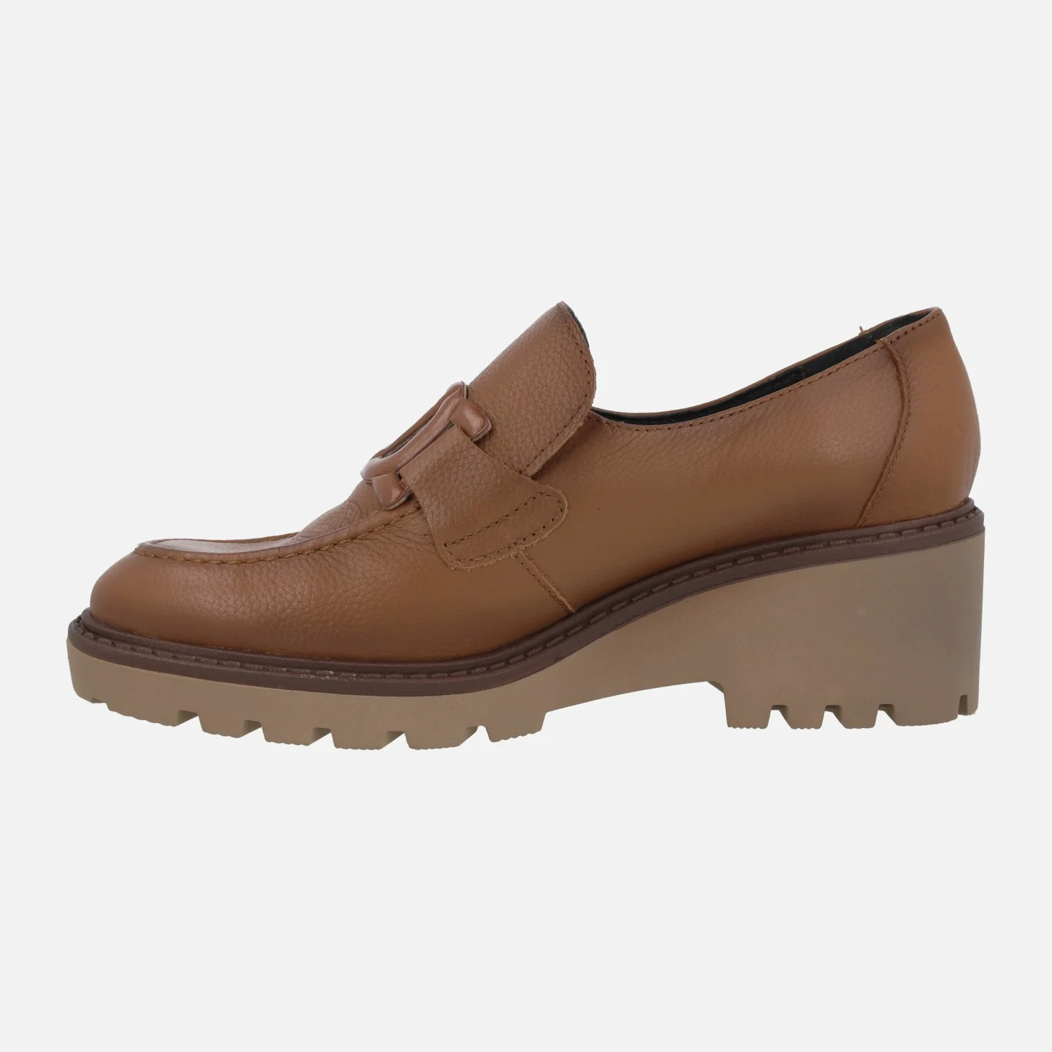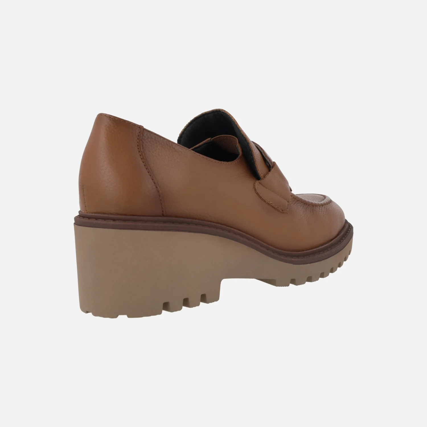Zapatos mocasines para mujer de la marca Viguera modelo 8281, en cuero y en polar. Mocasines de piel con adorno en el empeine. Pieza elástica en la parte interior del empeine para mejor calce y ajuste. Forro y planta textiles. Cuña de goma, de 6 cms de altura trasera (2,5 cms parte delantera).