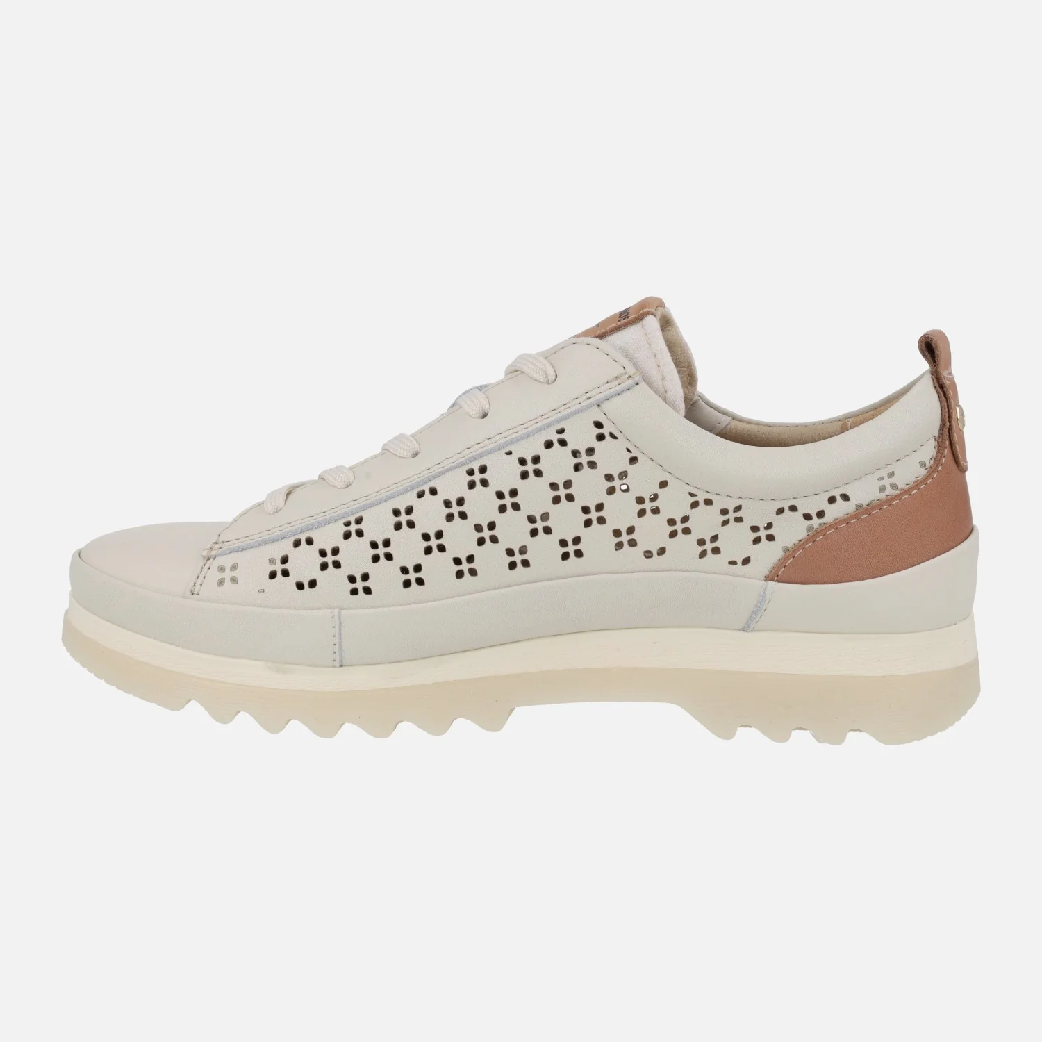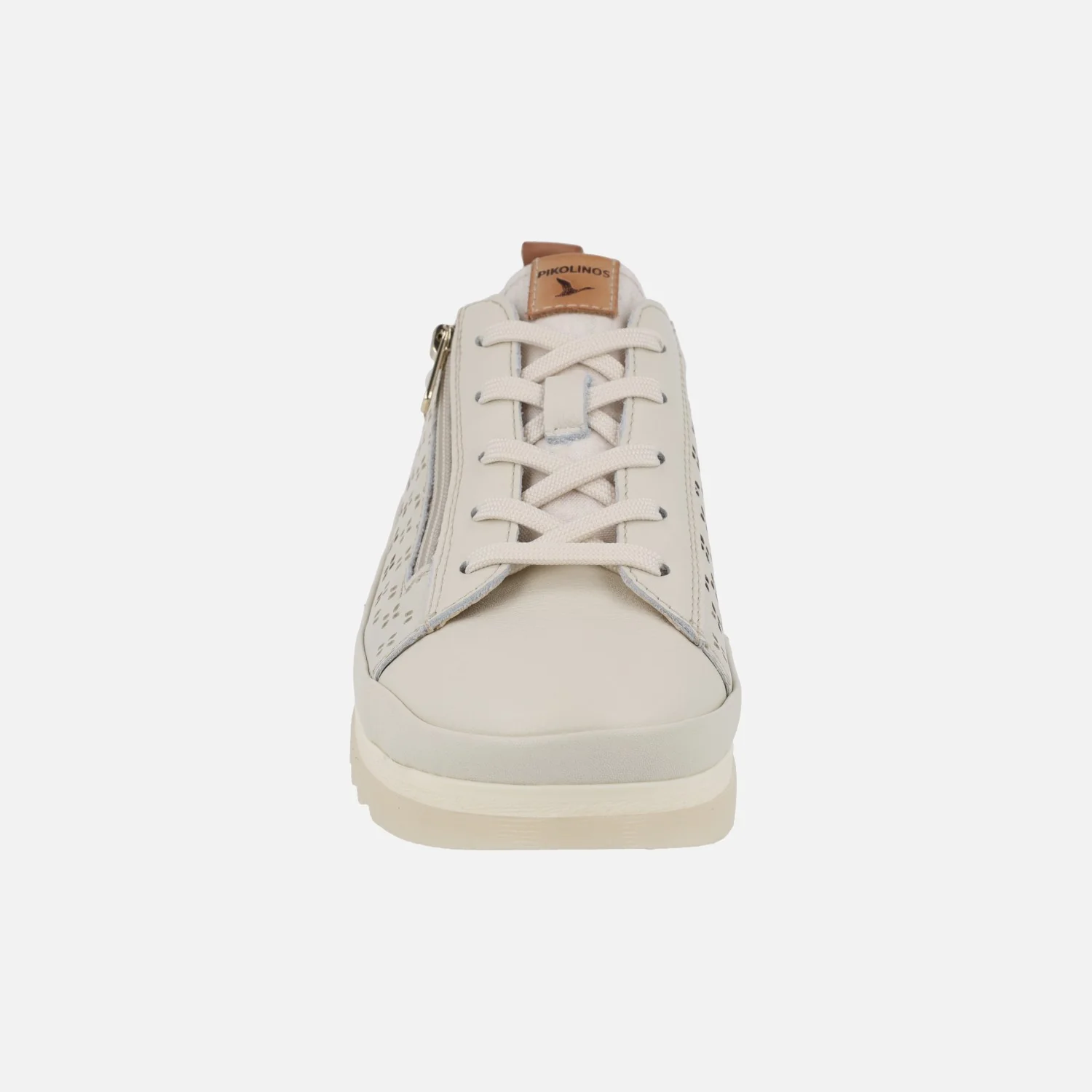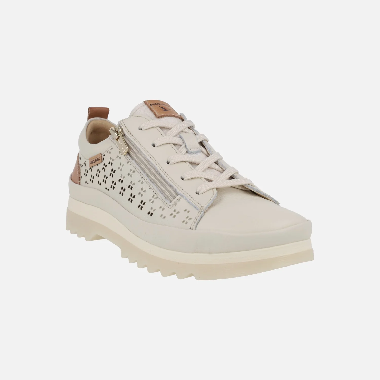 Zapatos de estilo deportivo para mujer de la marca Pikolinos modelo Vigo W3W-6841C1 Nata. Zapatos de piel en color blanco roto, con detalle de picados. Cordones textiles y además cremallera lateral. Lengüeta textil. Interior textil con plantillas extraíbles. Memory foam. Suela sintética, dentada, de 3 cm de altura en la parte trasera (2 cm en la parte delantera).