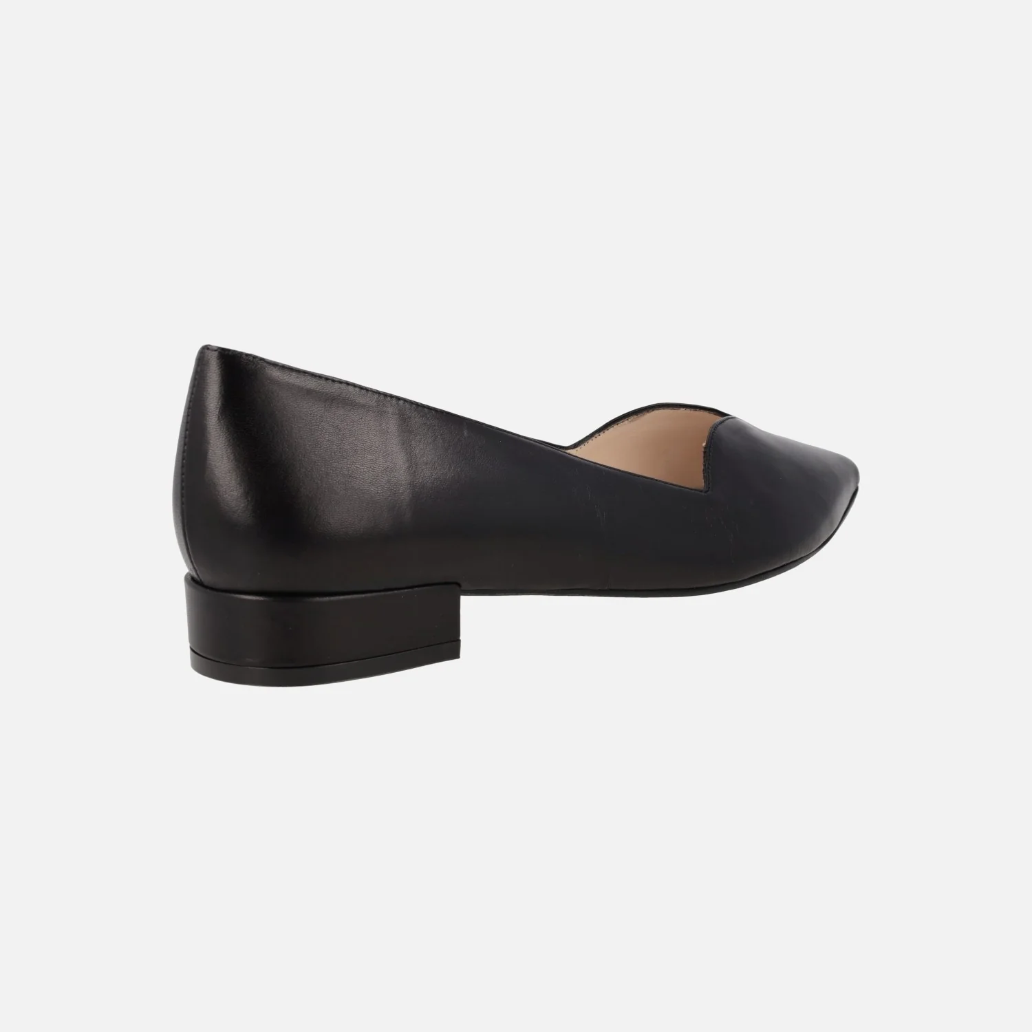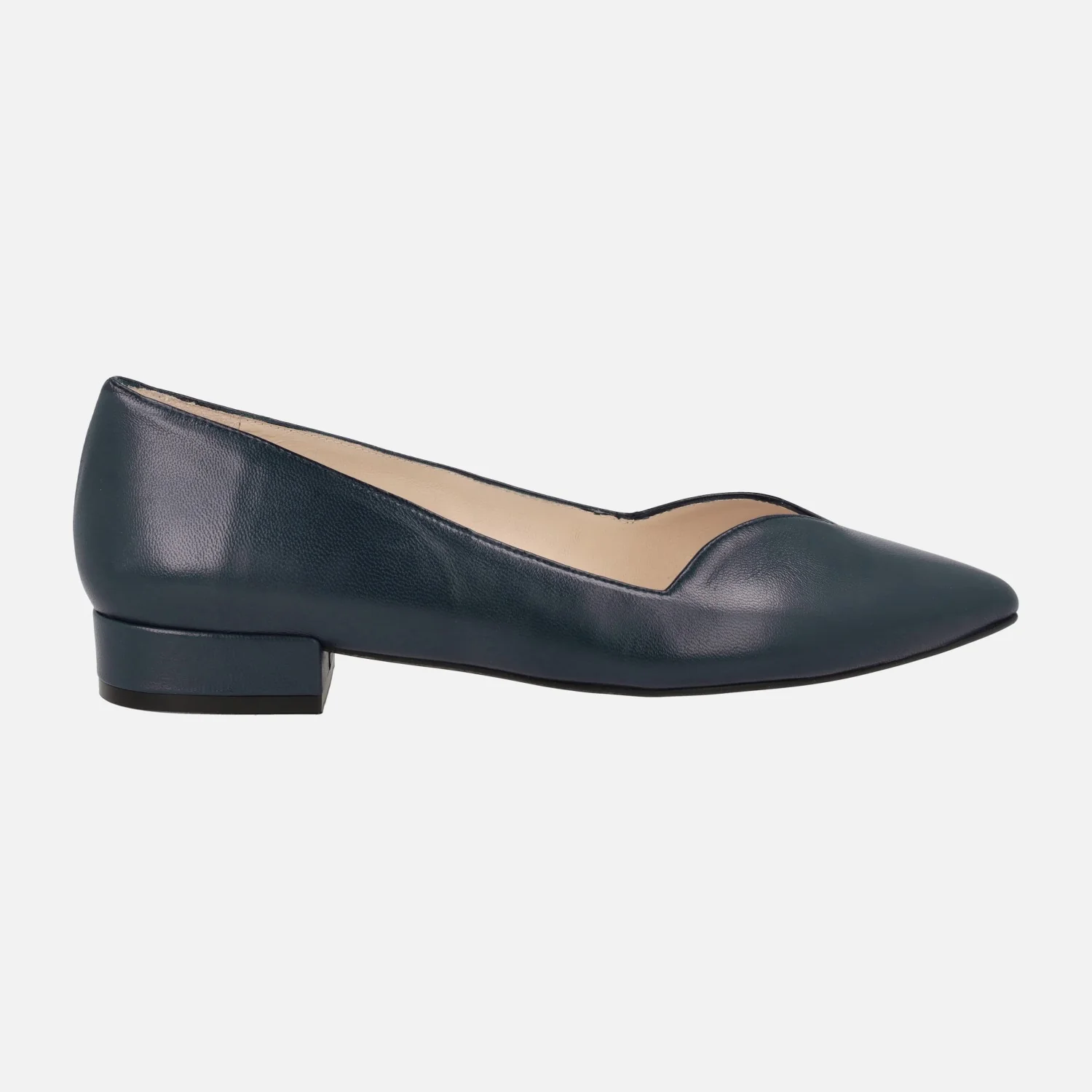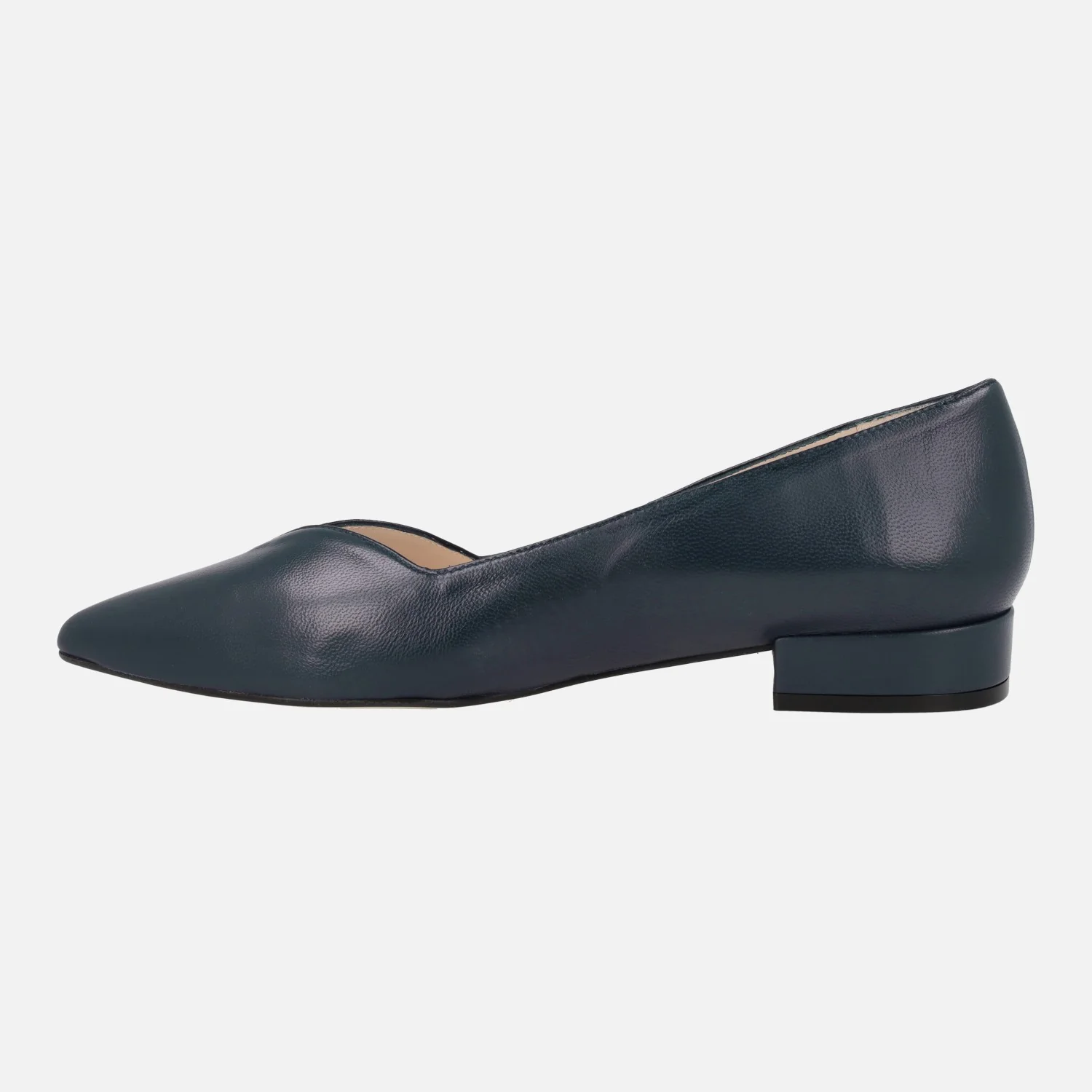 Zapatos bajos de piel para mujer de la marca Escalzia, modelo Breda. Zapatos estilo bailarinas, con puntera ligeramente afilada y escote en pico. Elaborados en piel negra o azul marino, con forro y planta de piel. Tacones bajos, forrados, de 2,5 cms de altura.