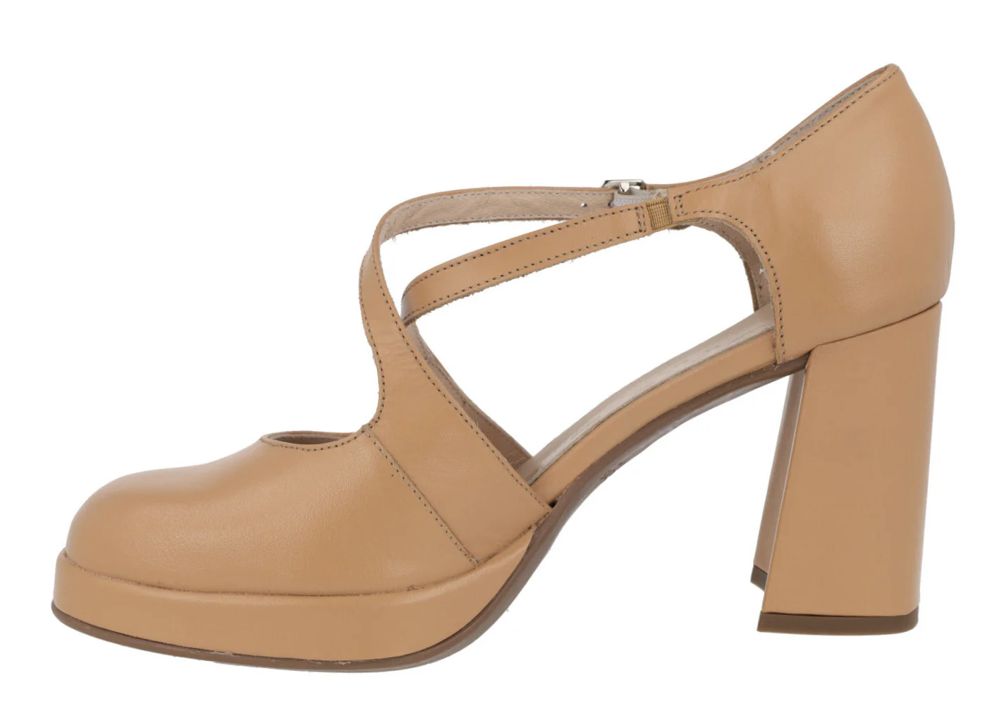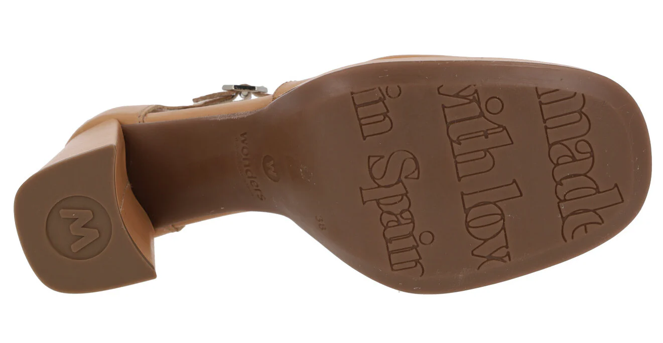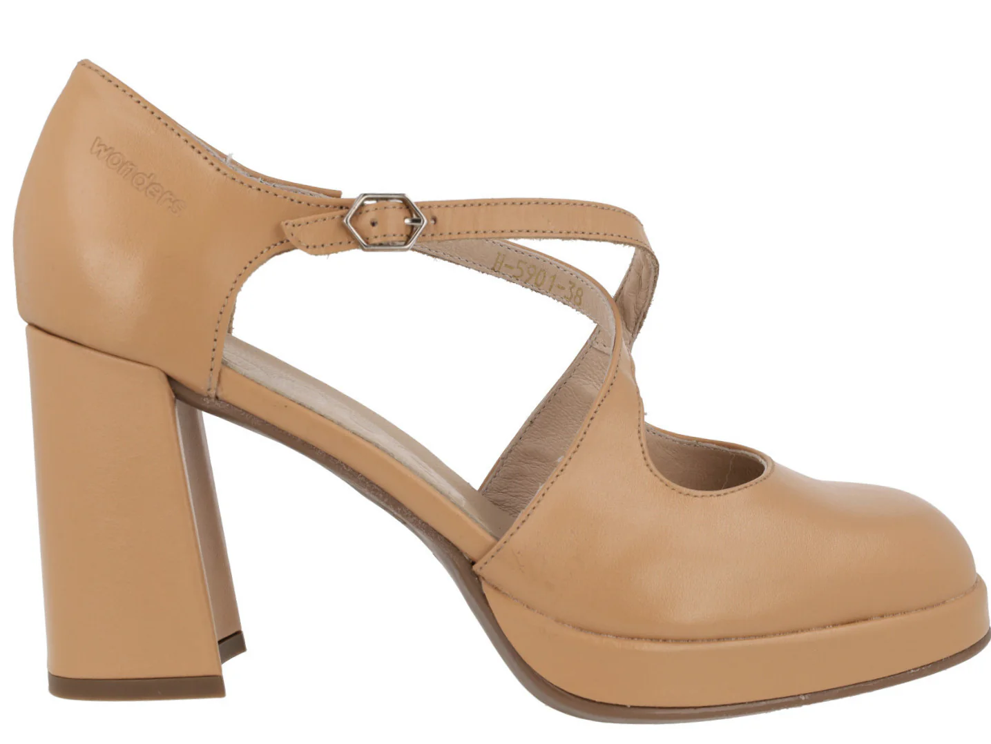 Zapatos de piel con aberturas laterales Wonders modelo H-5901 Sand. Zapatos corte salón con tiras cruzadas al empeine y cierre de hebilla hexagonal al tobillo. Forro y planta de piel. Tacón alto, ancho y plataforma delantera. Altura de tacones 8,5 cms, plataforma delantera de 1 cm. Made in Spain.