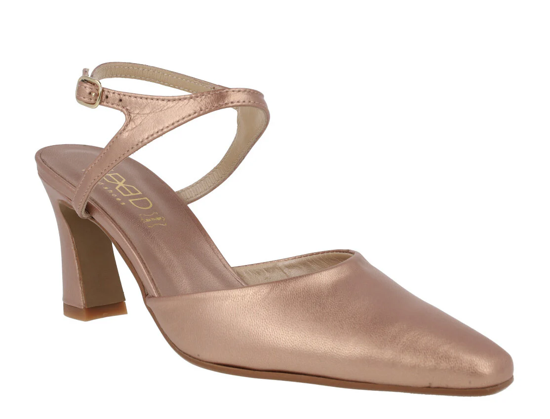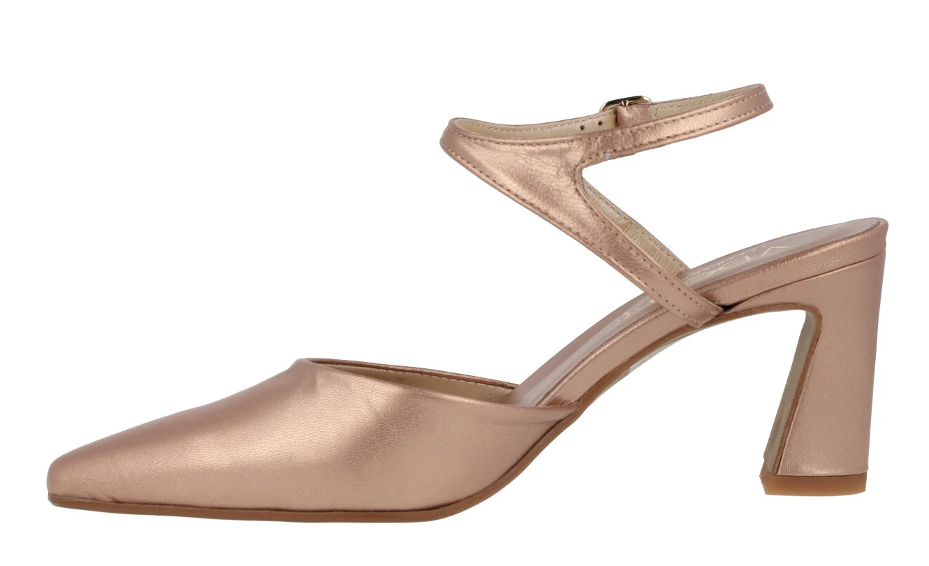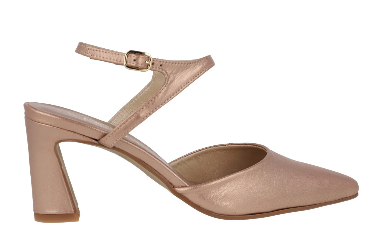 Elegantes zapatos corte salón de la marca Vexed, modelo Lonel 22225. Elaborados en piel nacarada beige nude, en metalizado oro rosa o plomo, con una pulsera al tobillo y cierre de hebilla. Interiores de piel. Tacones forrados, de 8,5 cms de altura.