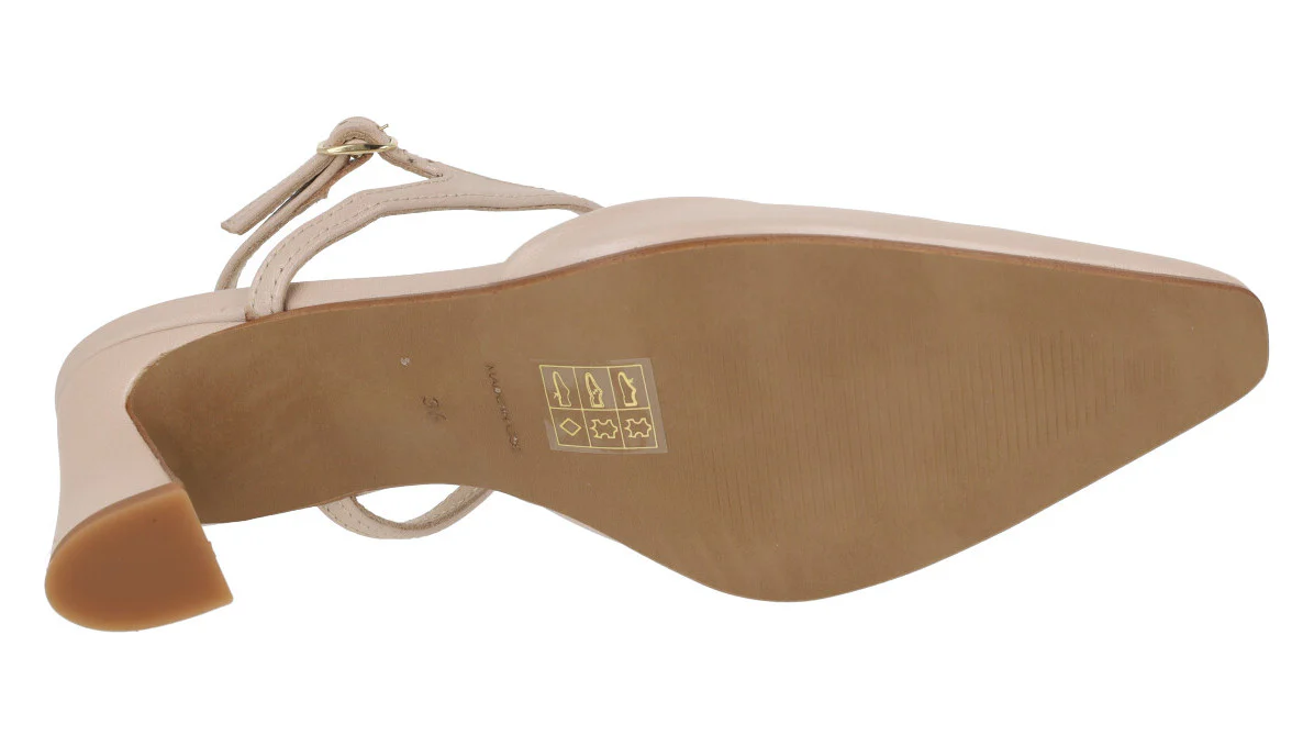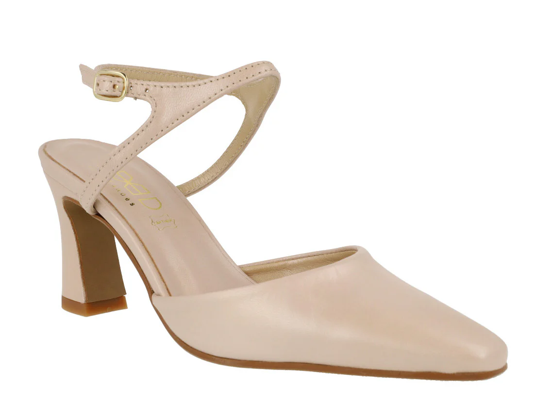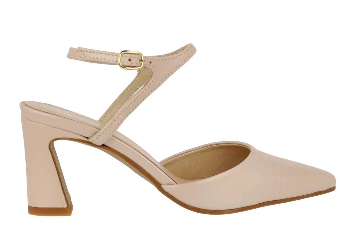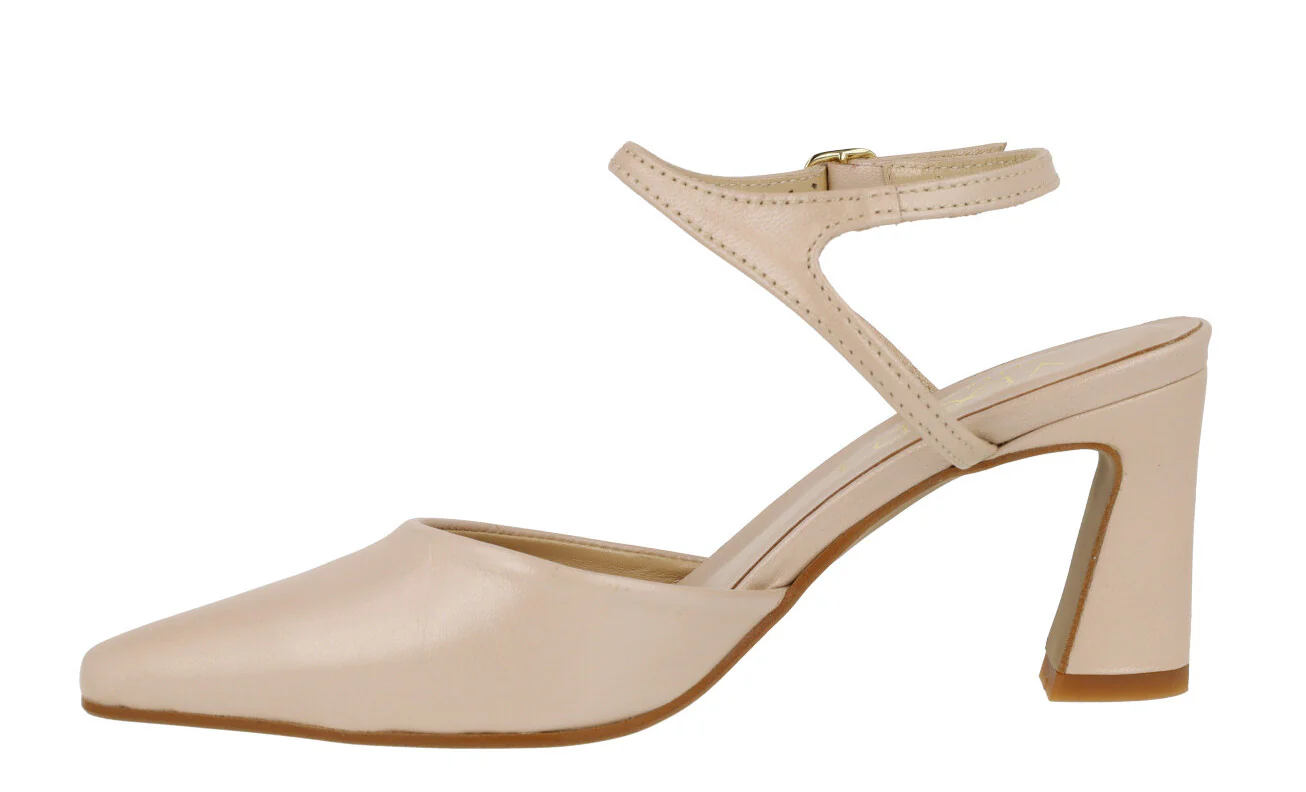 Elegantes zapatos corte salón de la marca Vexed, modelo Lonel 22225. Elaborados en piel nacarada beige nude, en metalizado oro rosa o plomo, con una pulsera al tobillo y cierre de hebilla. Interiores de piel. Tacones forrados, de 8,5 cms de altura.