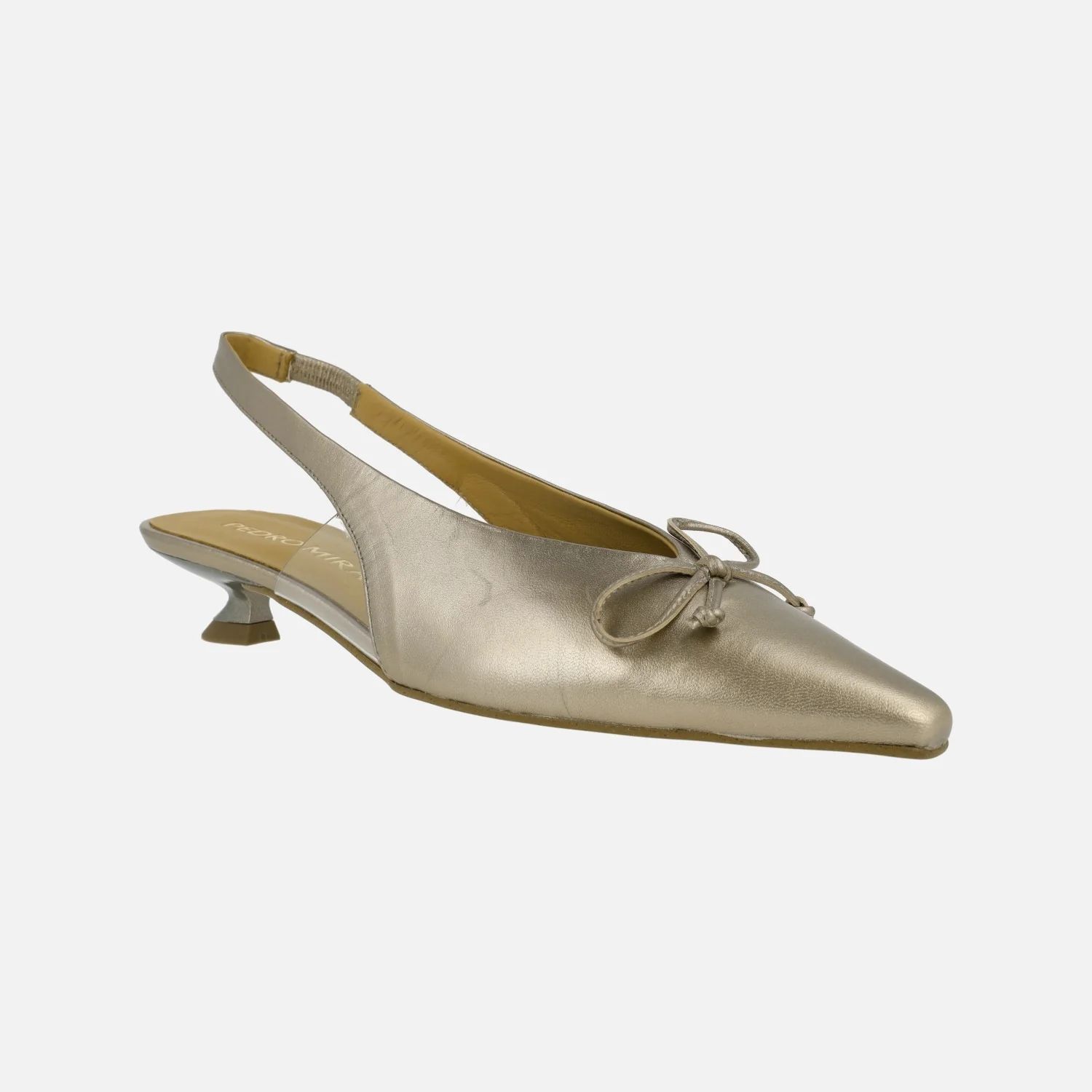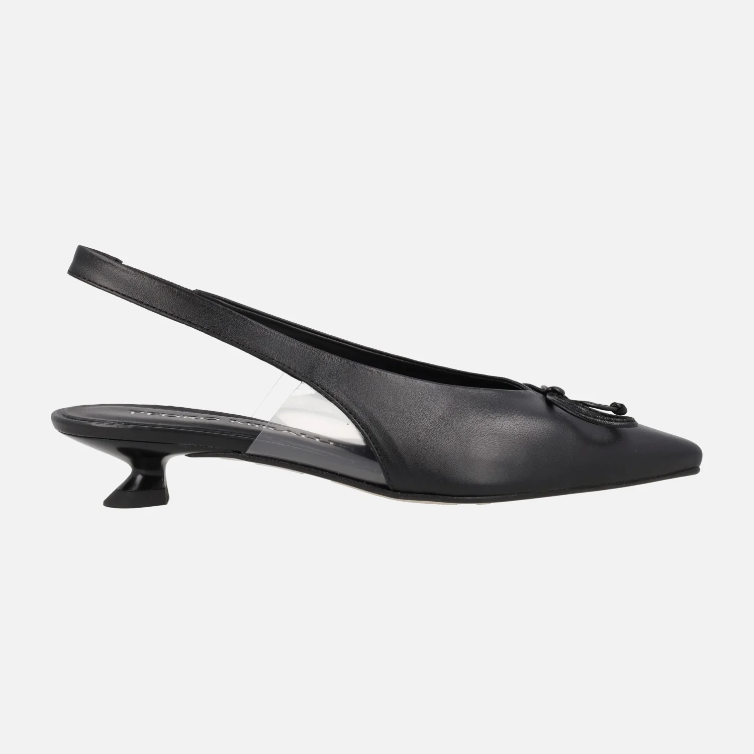 Zapatos destalonados para mujer de la marca Pedro Miralles, modelo 17752, disponibles en napa metal humo y en natur negro. Zapatos de horma afilada, con adorno de lazo en la parte delantera, elaborados en piel negra o en piel metalizada. Piezas vinílicas en los laterales, para una mejor sujeción. Forro y planta de piel. Tacones bajitos, estilo chupete, de 4 cms de altura. Made in Spain.