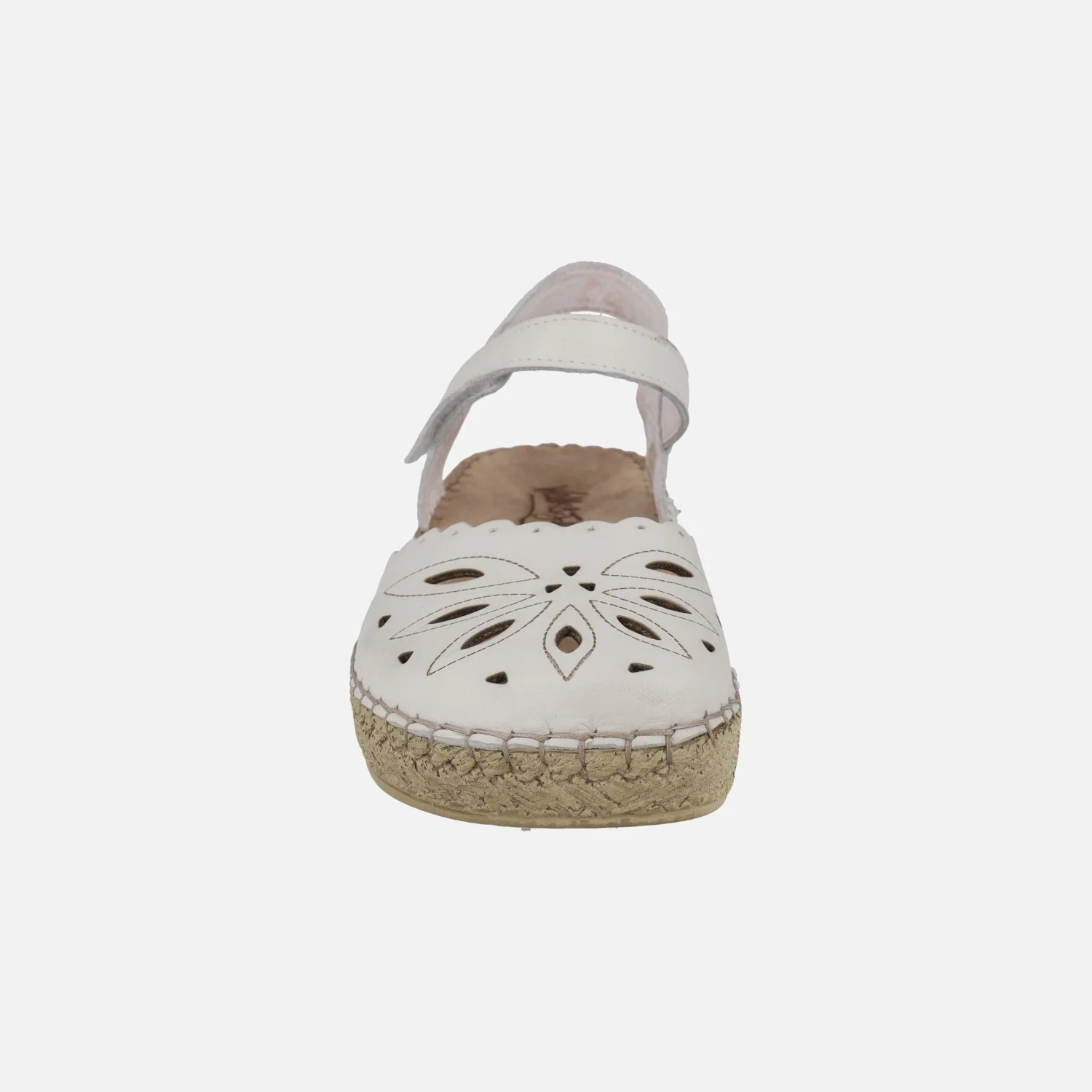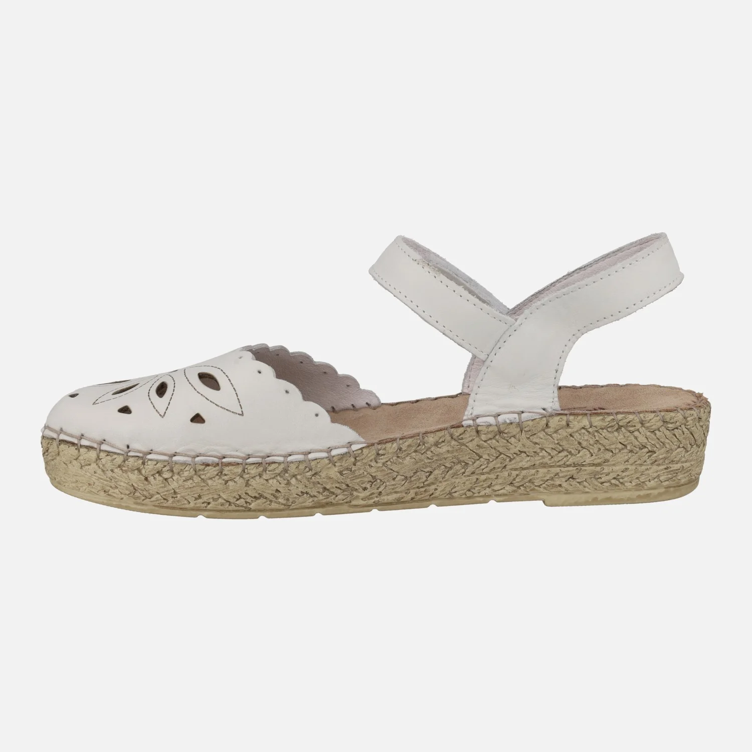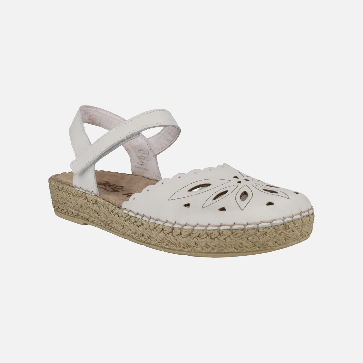 Zapatos semi abiertos de piel para mujer marca Walk & fly modelo 7665 504 Bianco. Zapatos blancos de piel con dibujos troquelados. Cierre de velcro al tobillo. Interiores forrados de piel. Piso sintético, con 3 cm de altura trasera (2 cm parte delantera).