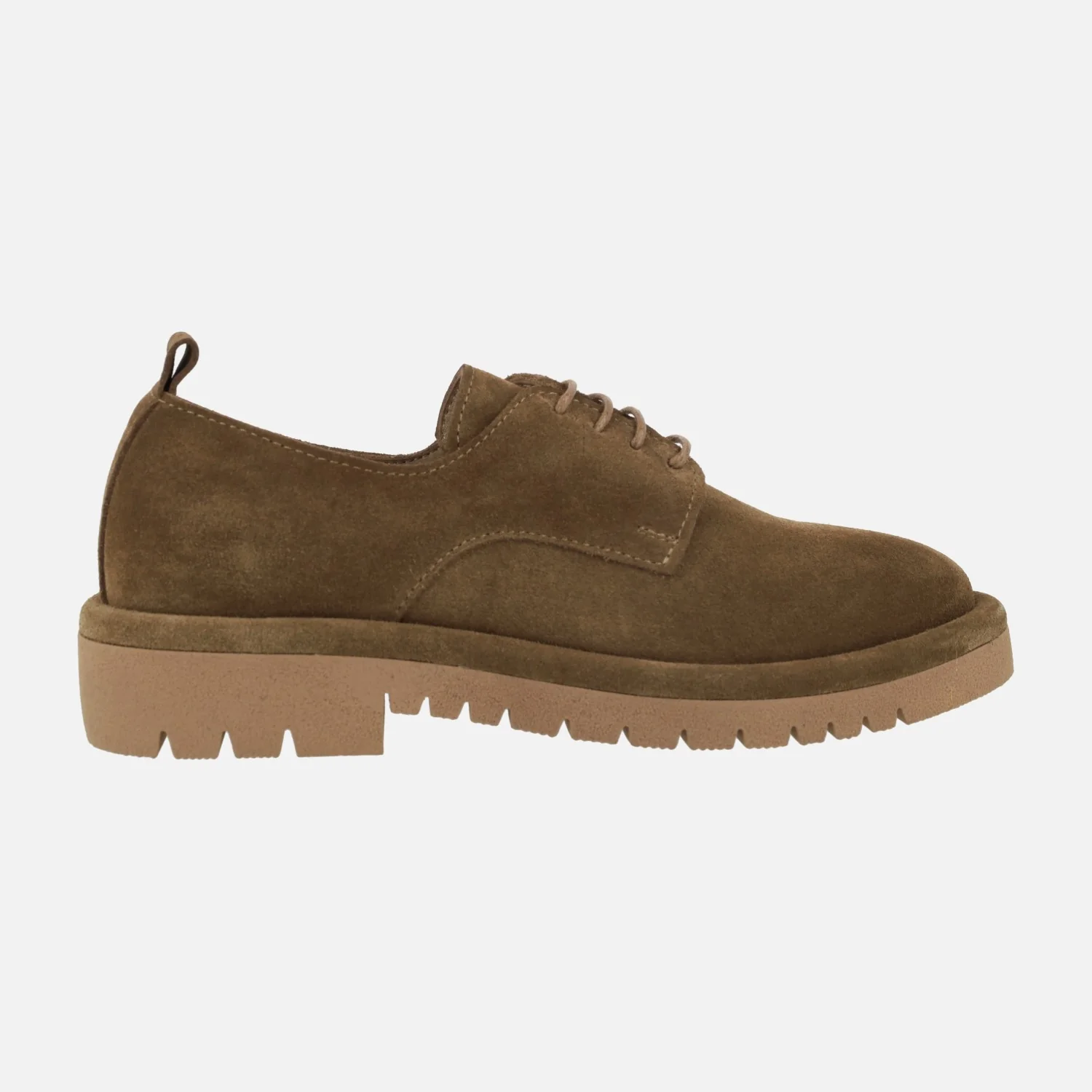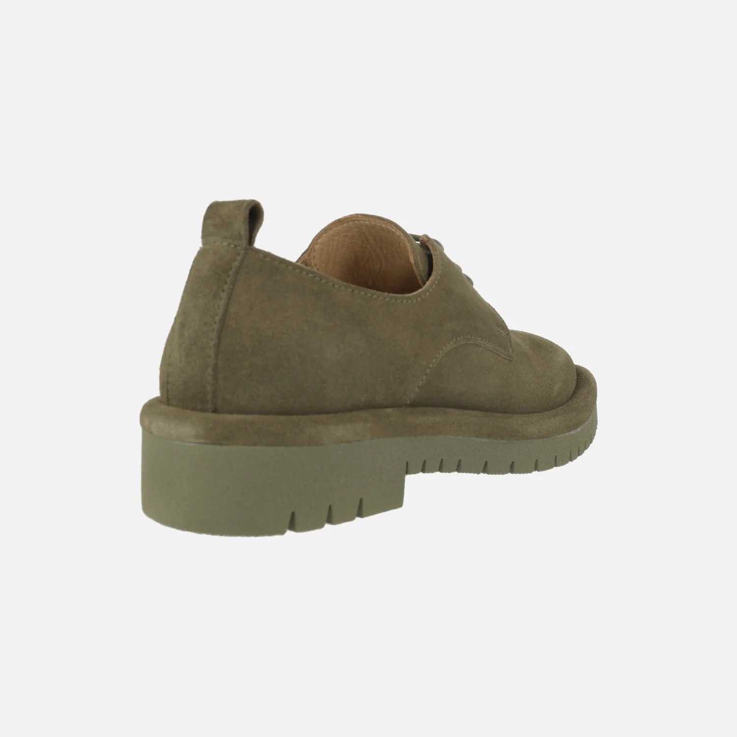 Zapatos de cordones estilo blucher para mujer de la marca Bueno shoes, modelo WZ6704, disponibles en Bosco (verde kaki), Sigaro (marrón) y Lion (color miel, entre mostaza y camel). Zapatos elaborados en piel serraje, con cordones y detalle de tirador trasero para un calce más sencillo. Forro y planta de piel. Piso de goma, con 4 cms de altura trasera de piso (2,5 cms en la parte delantera).