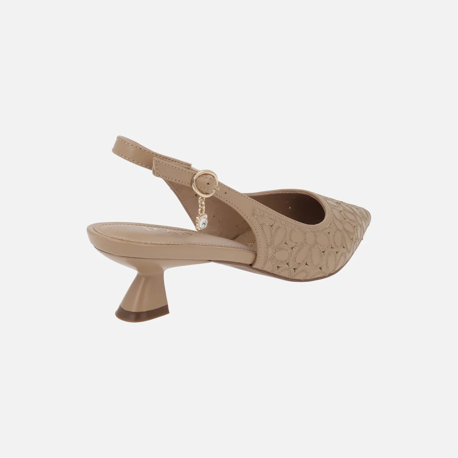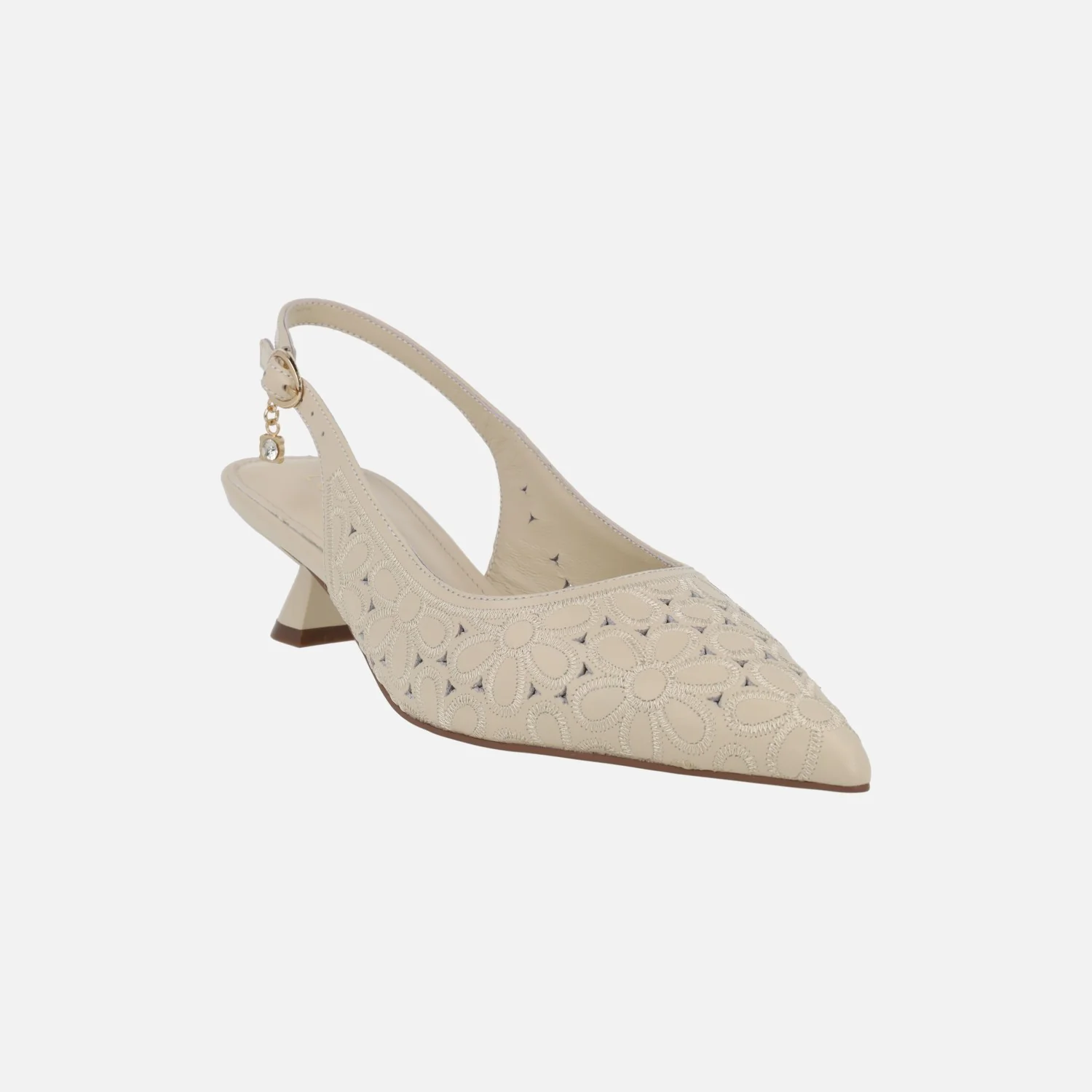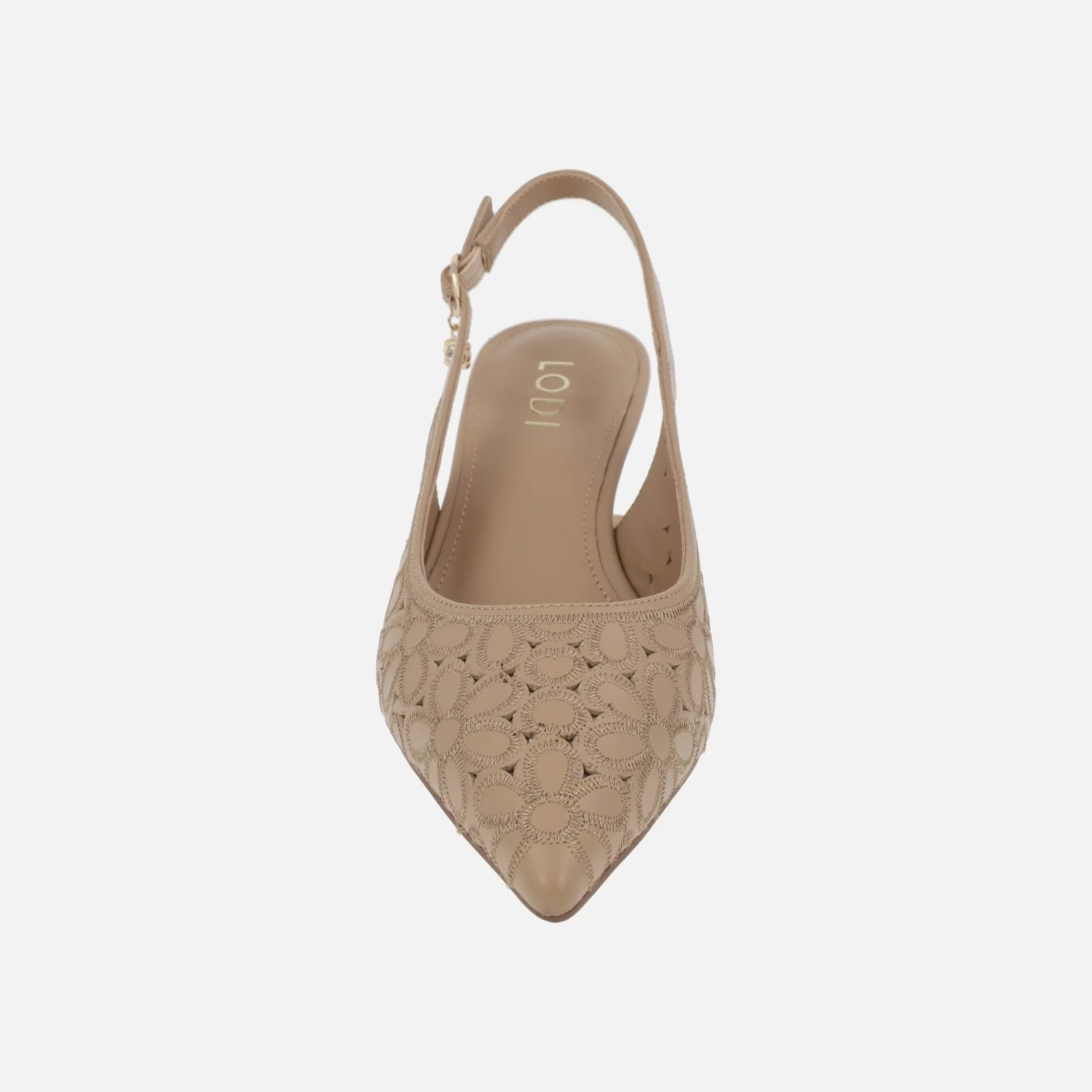 Preciosos zapatos corte salón destalonados de la marca Lodi, modelo A-Vina, disponibles en napa flores sand (camel) y off white (beige). Salones destalonados, elaborados en piel con detalle de picados y bordados de flores. Tira al talón con cierre de hebilla ajustable. Interiores en piel, planta new gel. Suela sintética con tacones de aproximadamente 4,5 cm de altura.