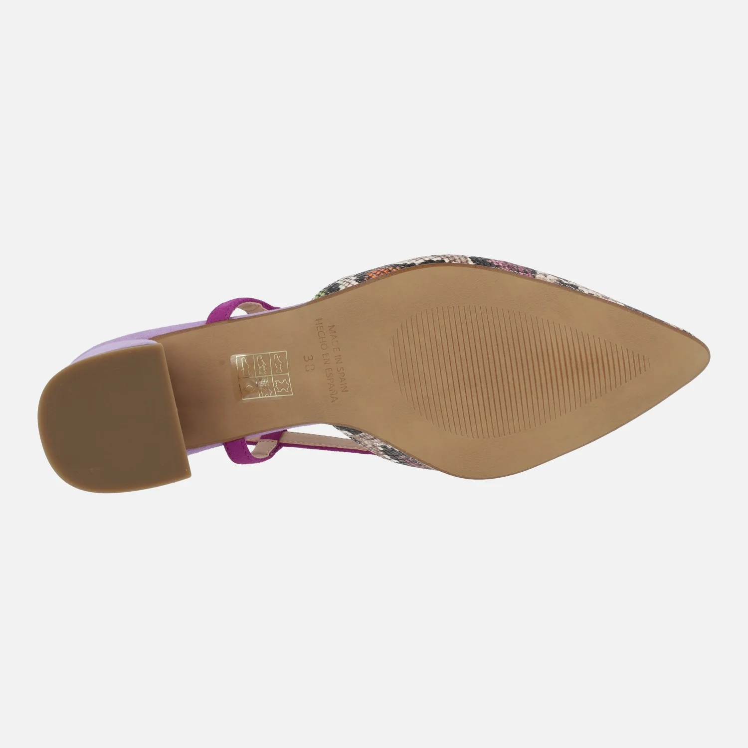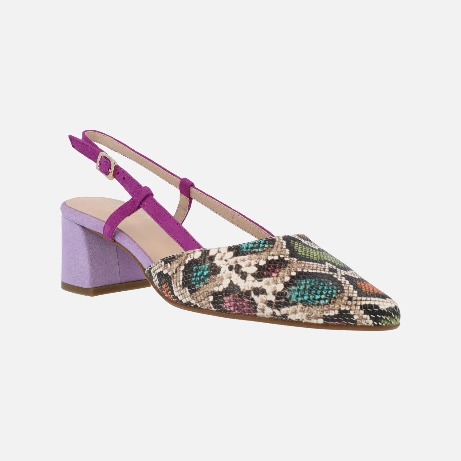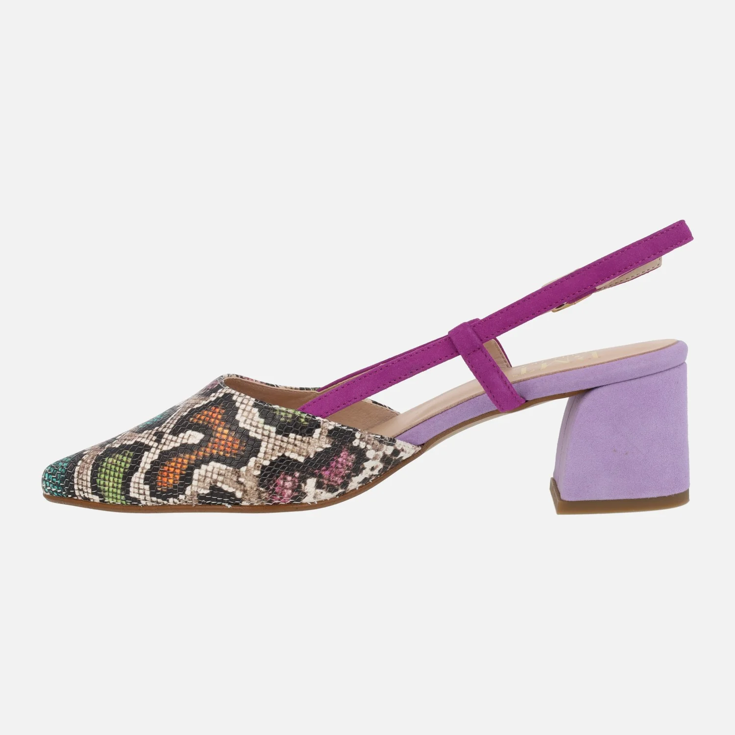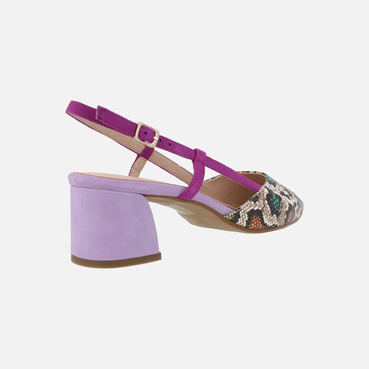 Zapatos de salón destalonados de la marca Barminton, modelo 12010 Colores. Zapatos de piel, con parte delantera en animal print. Tira al talón en ante, con cierre de hebilla. Tacones forrados de 6 cms de altura. Combina malva, fucsia y animal print con estampado de colores. Made in Spain.