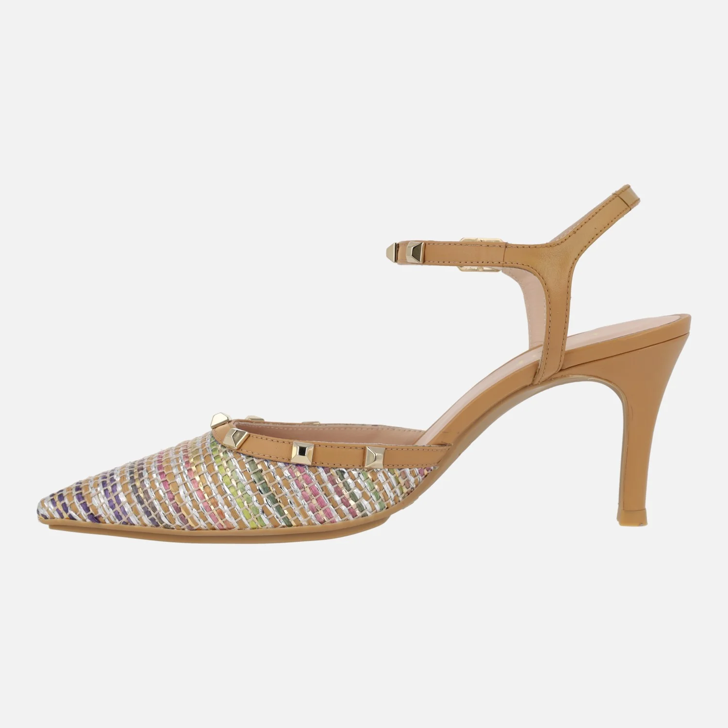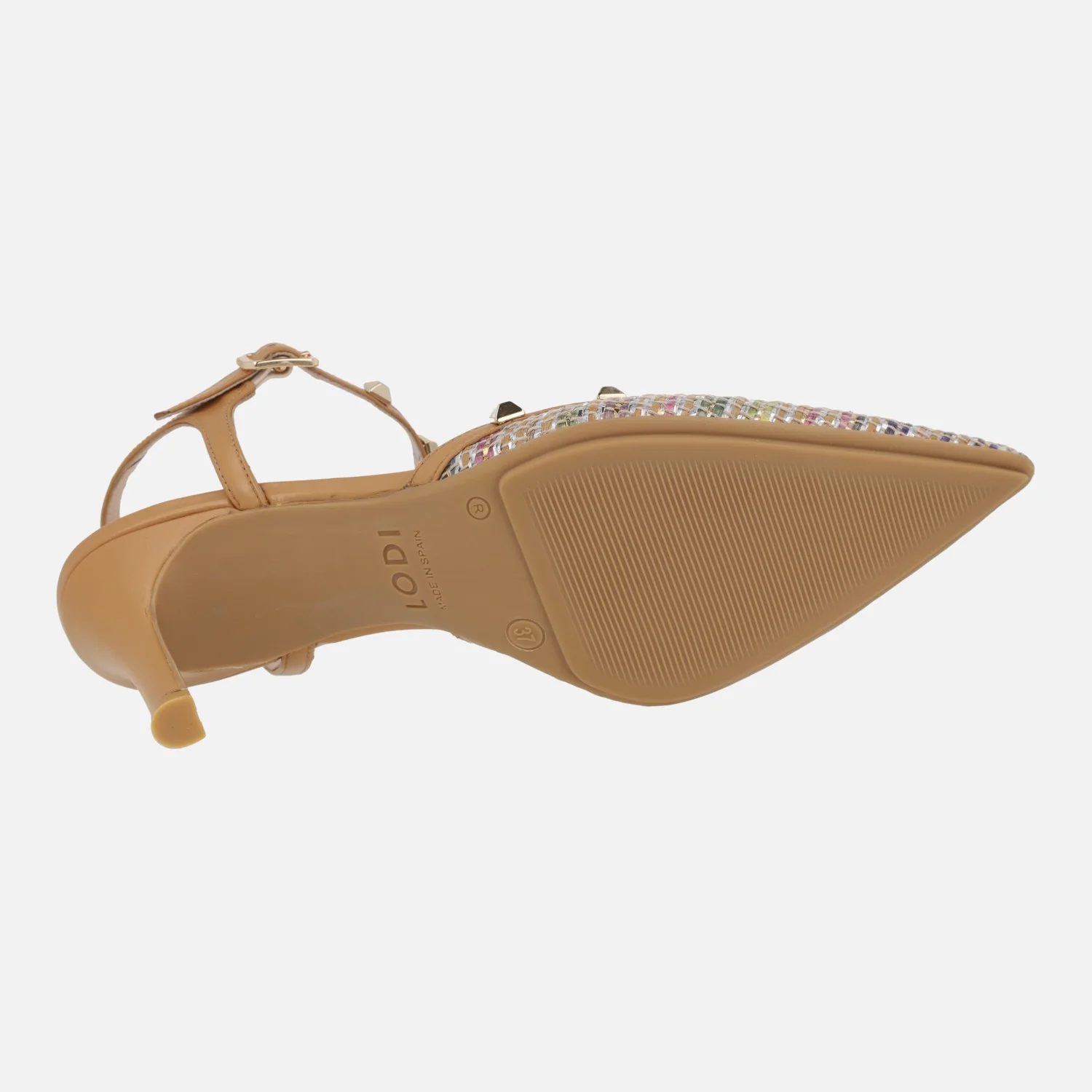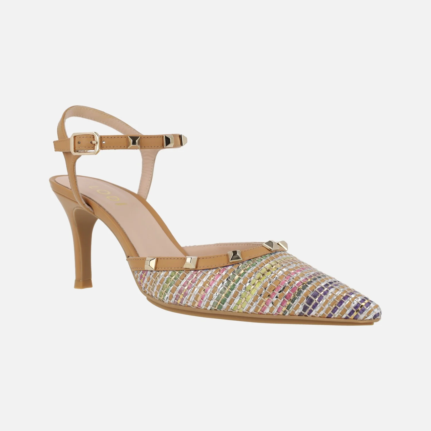 Preciosos y elegantes zapatos corte salón de la marca Lodi modelo Emari Roma multi camel. Salones con pala en tejido efecto rafia multicolor, combinado con tira de piel camel y remaches metálicos dorados. También lleva pulsera al talón con cierre de hebilla y las mismas tachas doradas. Interiores de piel, con planta newgel para mayor comodidad. Tacones forrados, de 8 cms de altura. Made in Spain.
