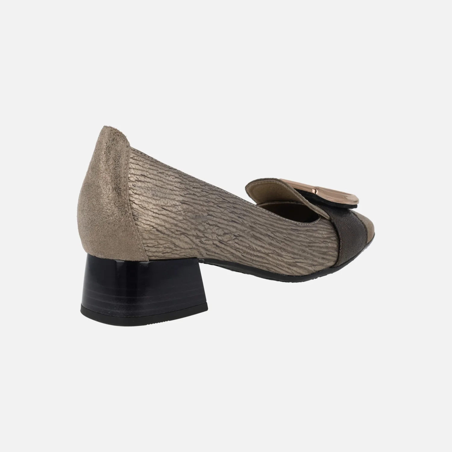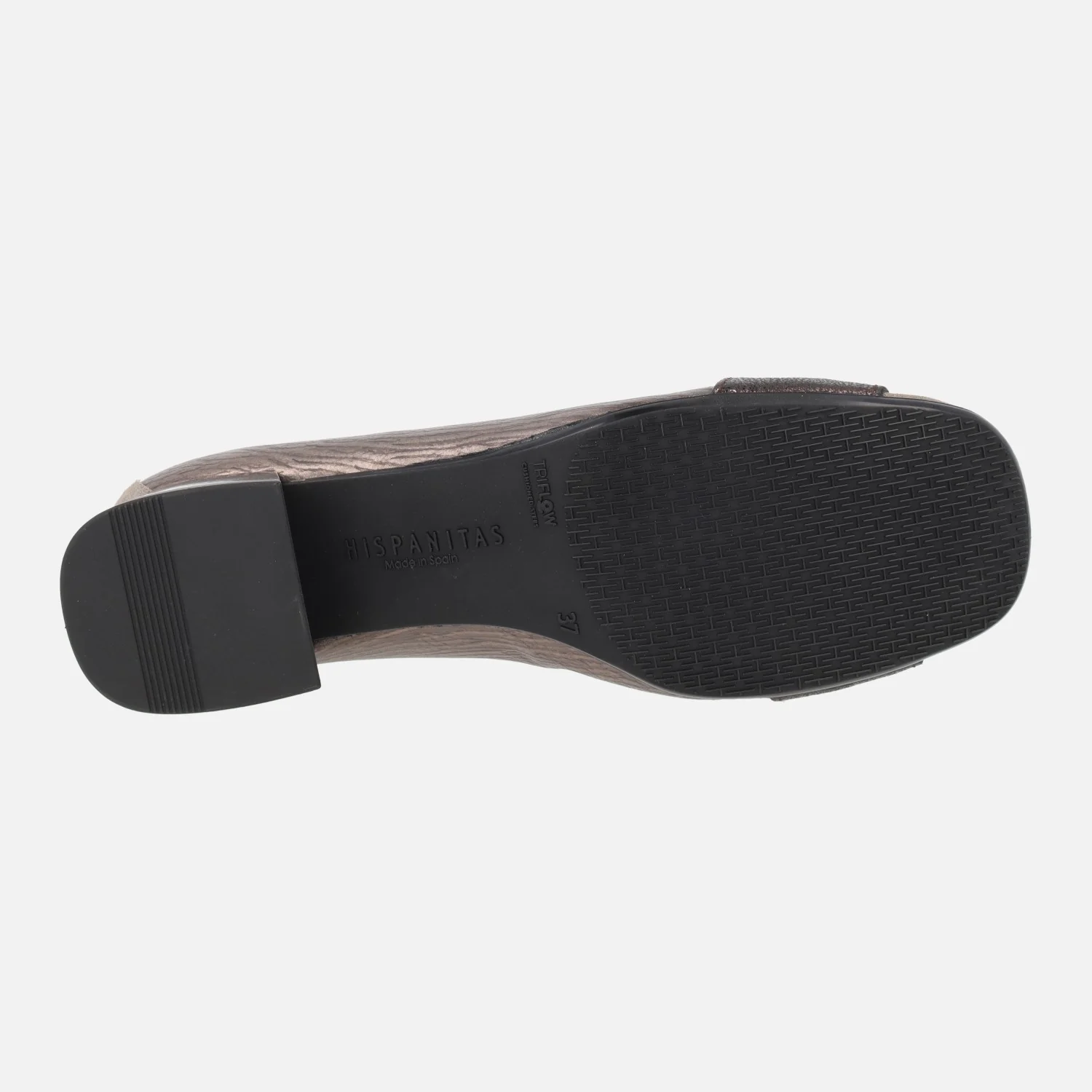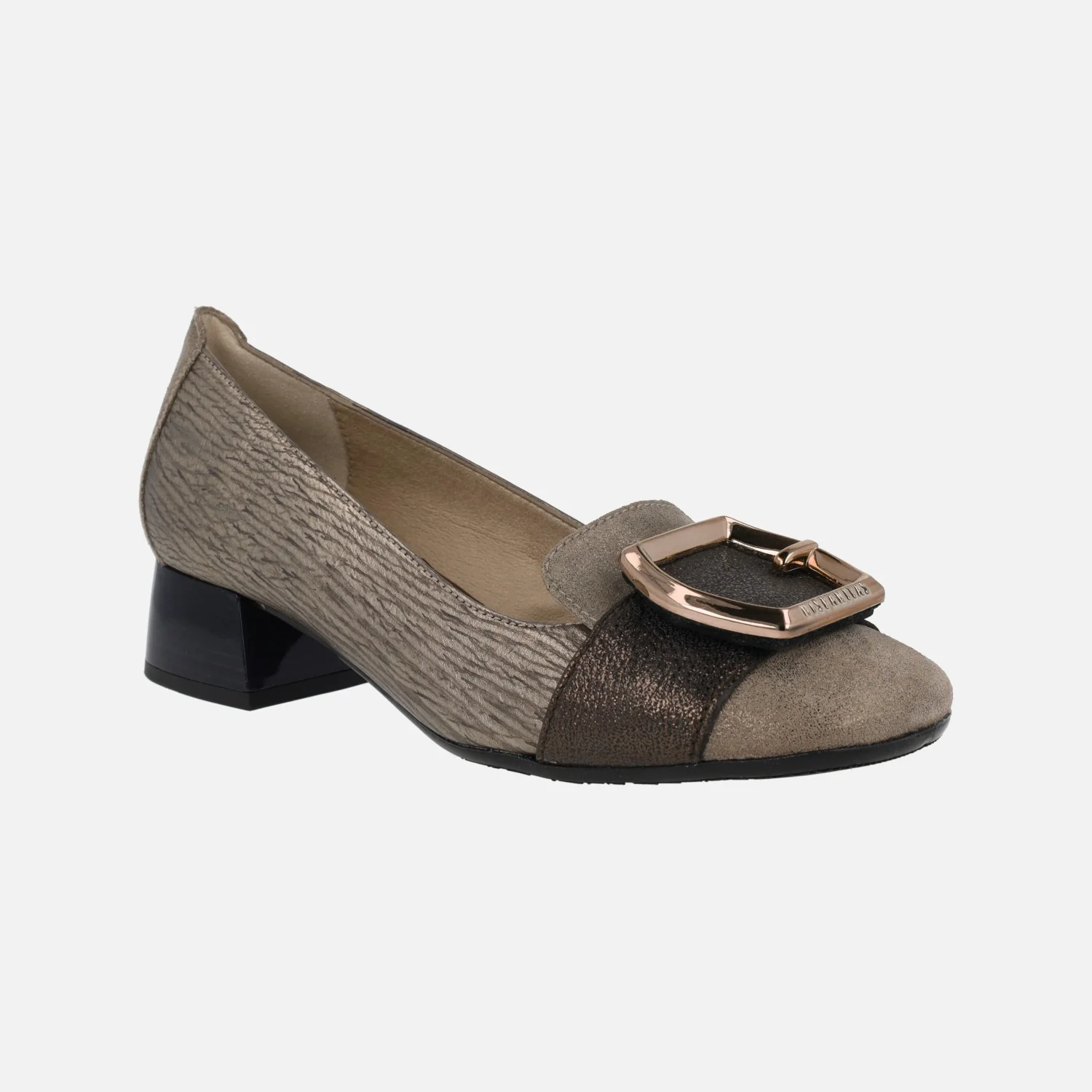 Zapatos de tacón bajo de la marca Hispanitas modelo Manila HI232987 en combinado de metales. Zapatos con copete, elaborados en piel taupe con brillo, con tira bronce en la parte delantera y adorno metálico dorado. El adorno es una hebilla hexagonal. El interior está compuesto de piel y microfibra. Piso de goma, con tacones bajos, de 3,5 cms de altura. Tecnología TRIFLOW de triple almohadillado, para un gran confort y gran amortiguación al caminar. Made in Spain.