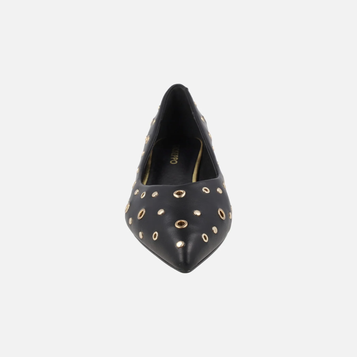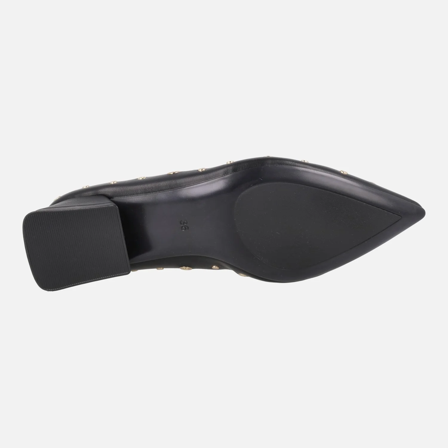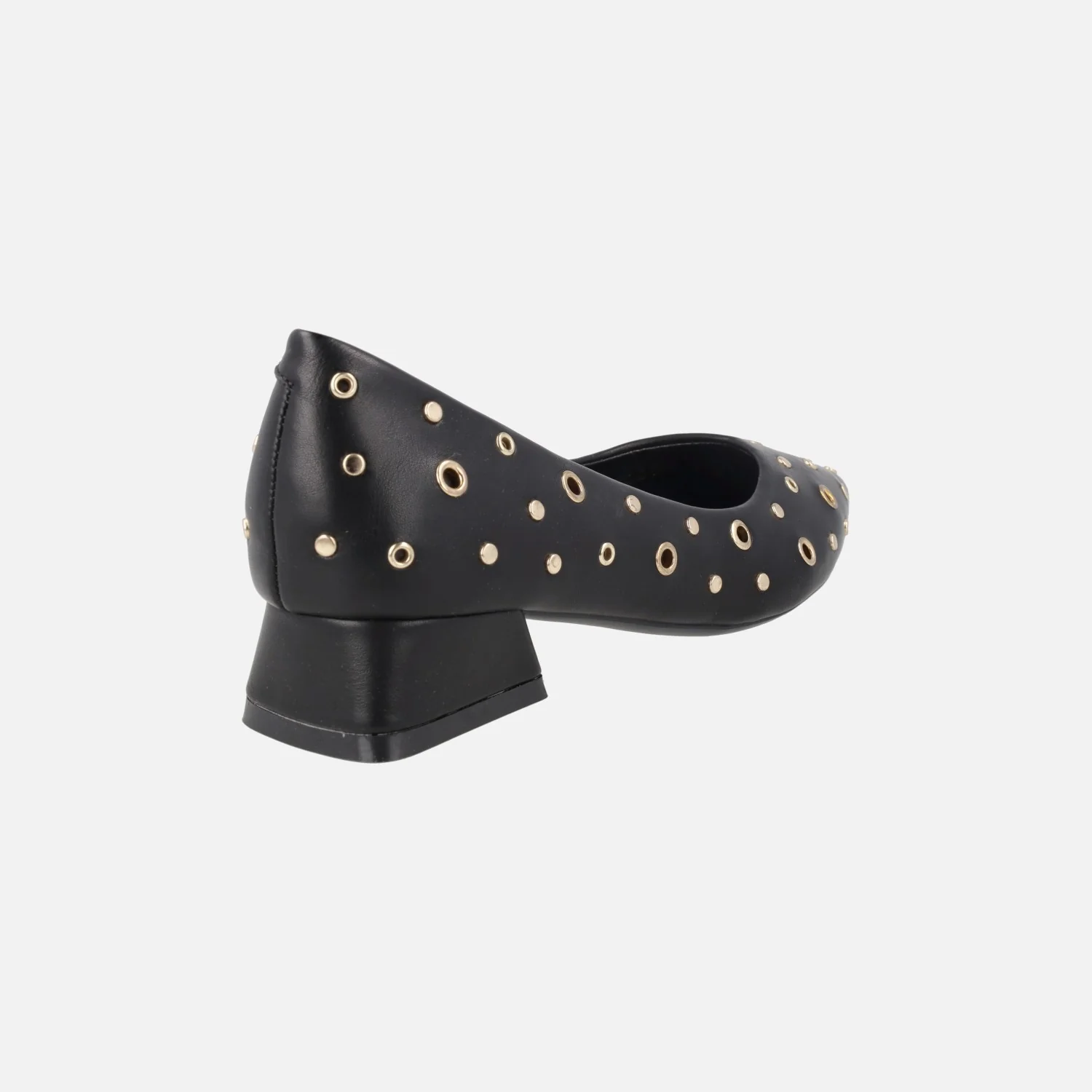 Preciosos zapatos de tacón corte salón de la marca Gioseppo, modelo 76729-P Negro Kenyon. Salones negros elaborados en materiales sintéticos con detalle de tachas y remaches metálicos dorados. Horma afilada. Planta forrada de piel. Tacones anchos, de 3 cm de altura. Piso sintético.