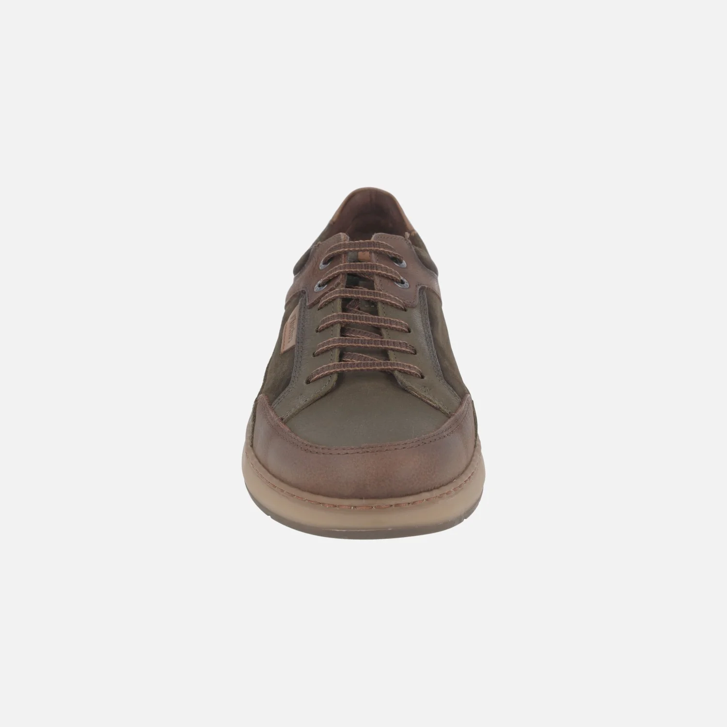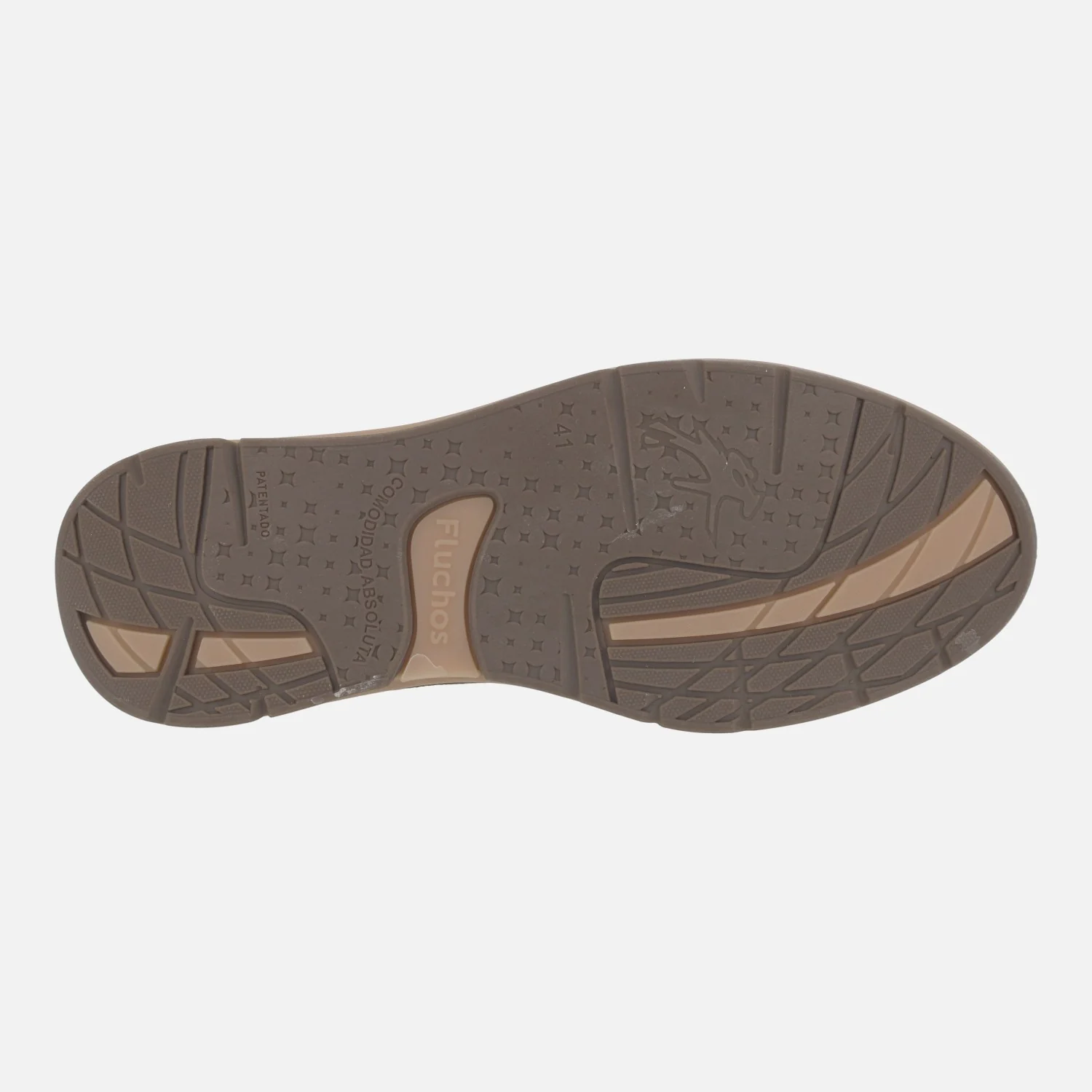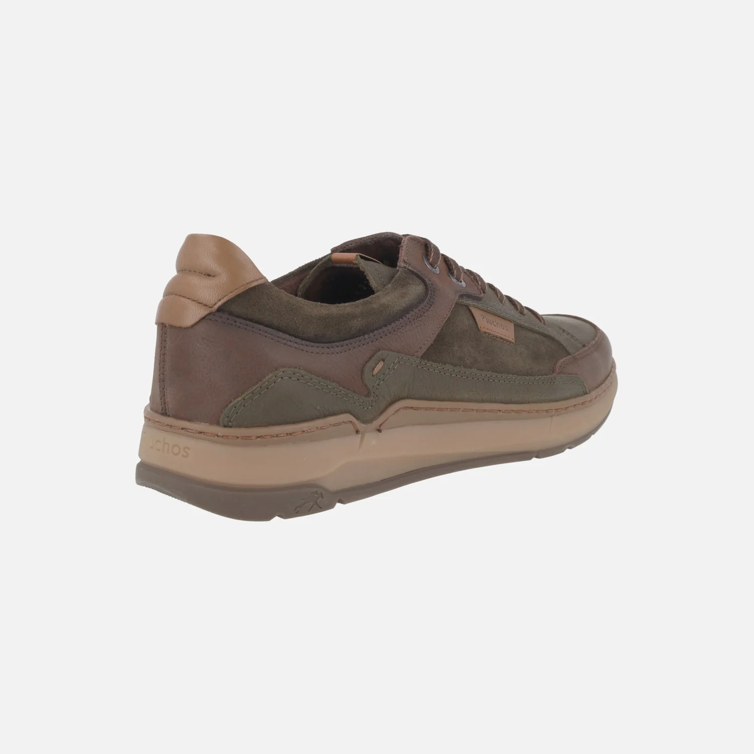 Zapatos de estilo deportivo para hombre de la marca Fluchos, modelo Jeff F2279 Vegabuck Kaki. Zapatos elaborados en combinado de piel y serraje, en tonos marrones y verde kaki. Cierre de cordones. Interior textil, con plantillas extraíbles. Piso de goma.