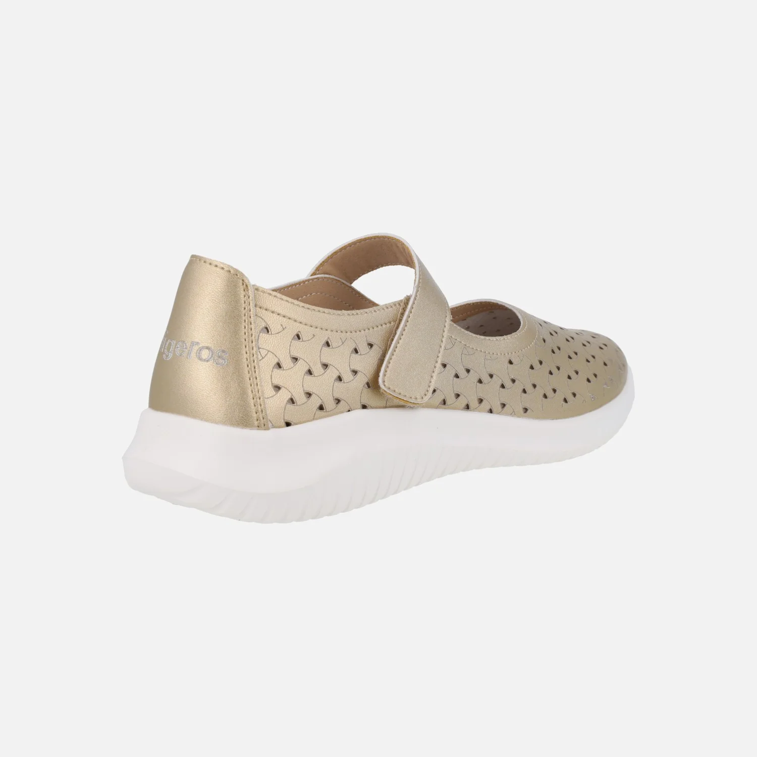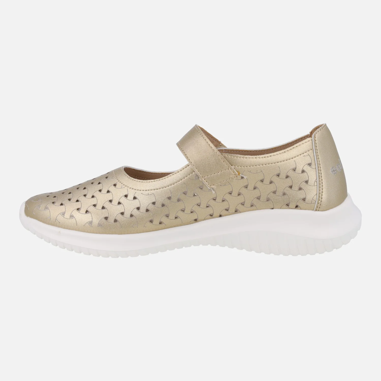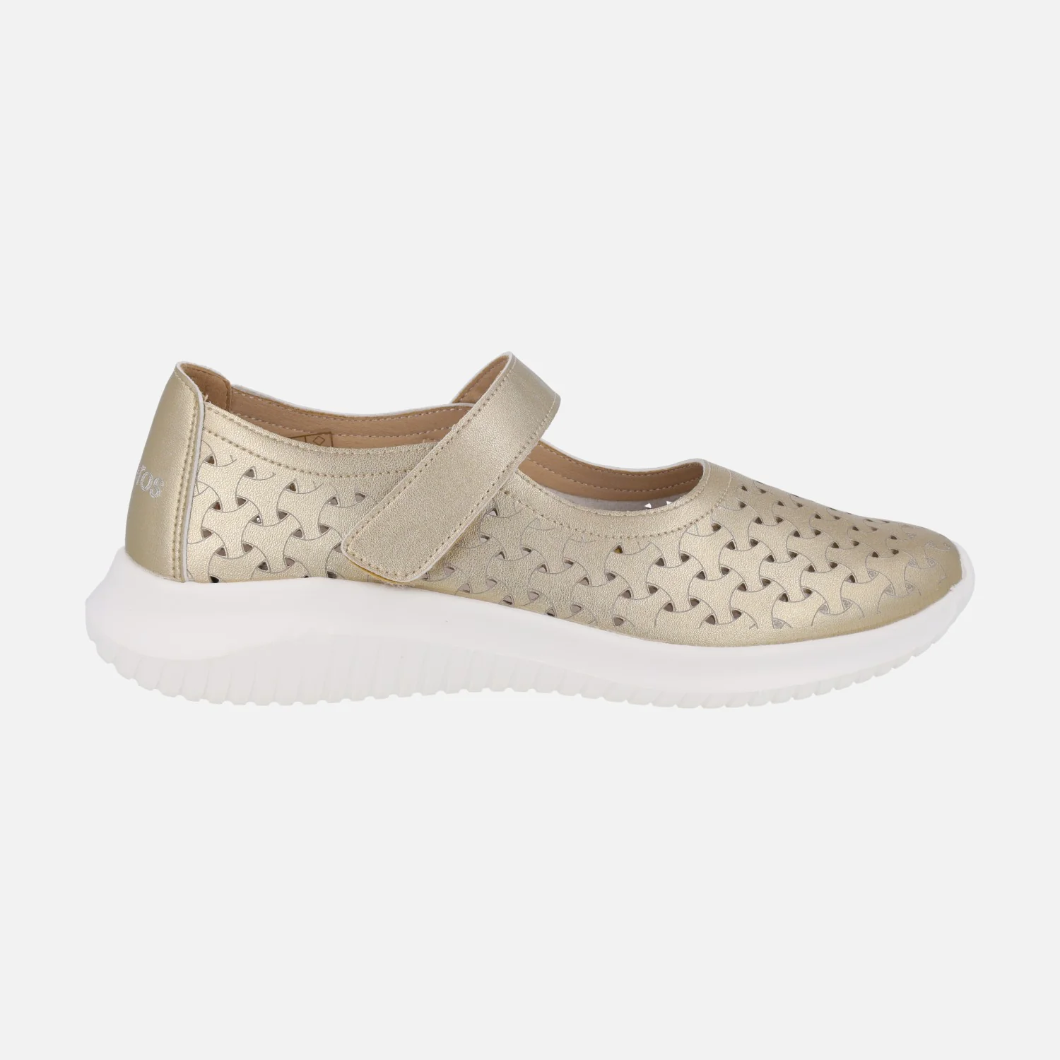 Zapatillas deportivas para mujer estilo merceditas de la marca Ecoligeros modelo Isa. Mercedes elaboradas en materiales sintéticos, con dibujos a láser y picados, cierre de velcro. Interiores en combinado de sintéticos y piel. Plantillas extraíbles. Piso de goma super ligero, con una altura trasera de 3 cms. Detalle de logo «Ecoligeros» grabado en el talón. Disponibles en oro, kaki, azul jeans y beige.