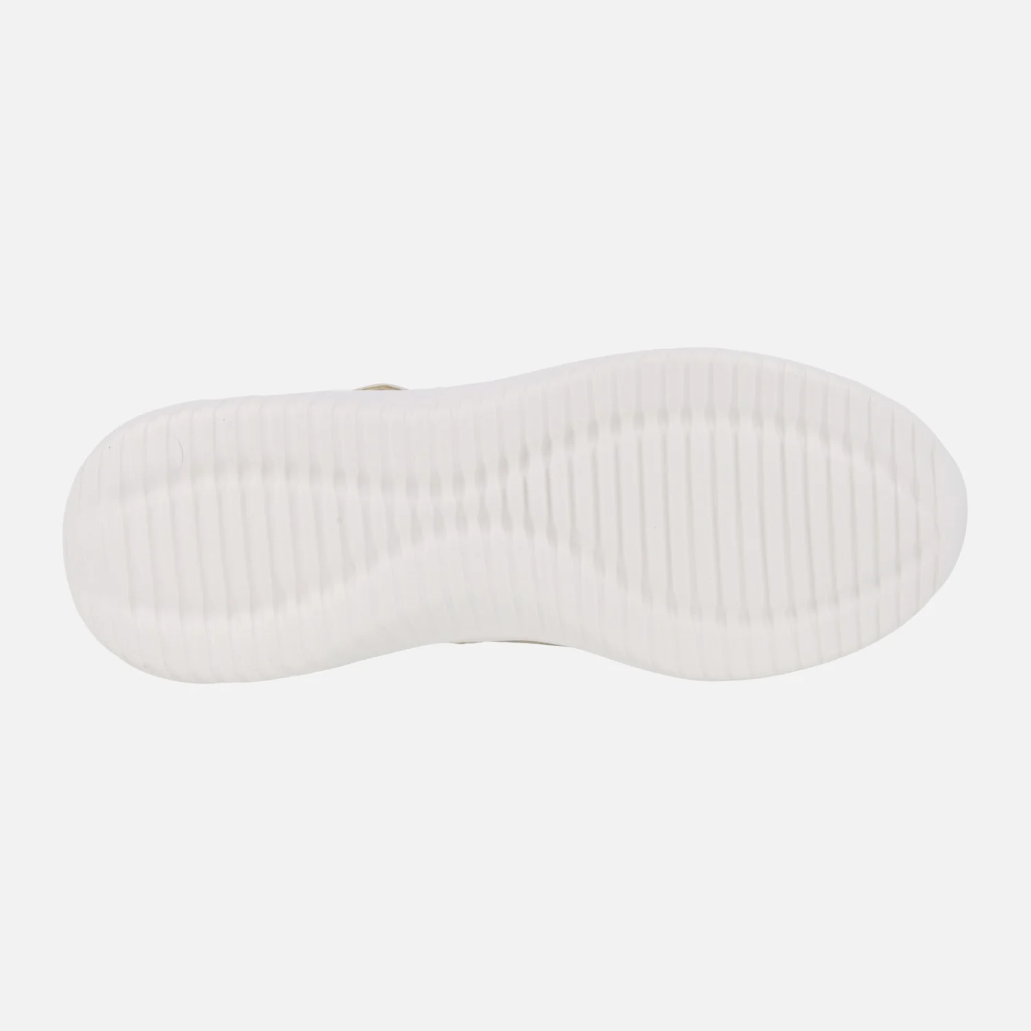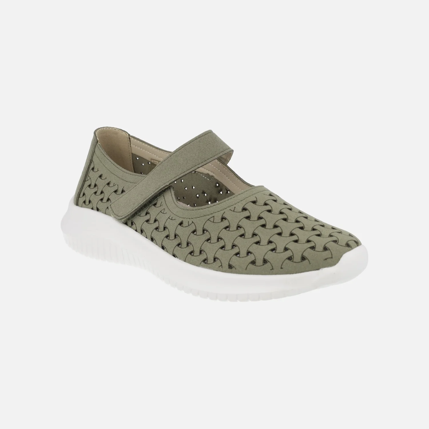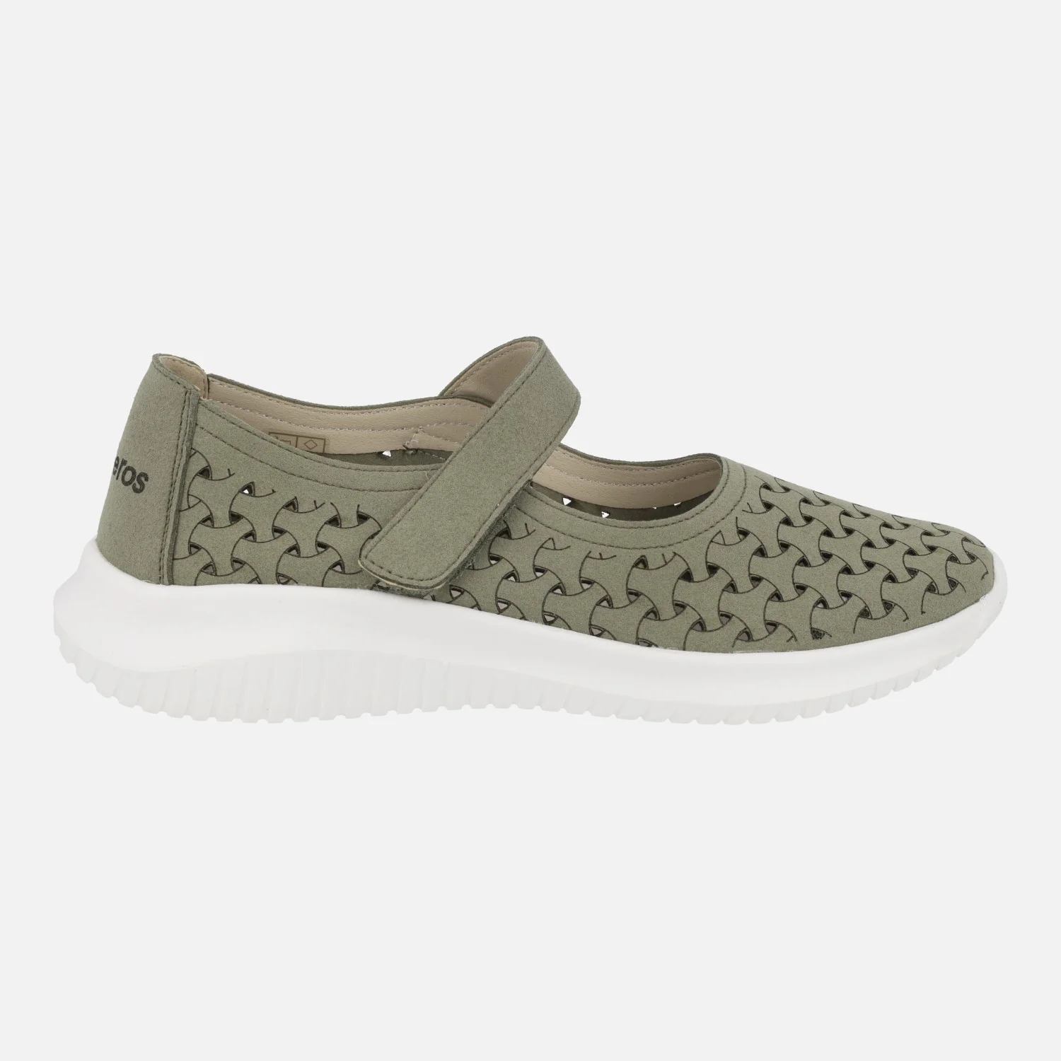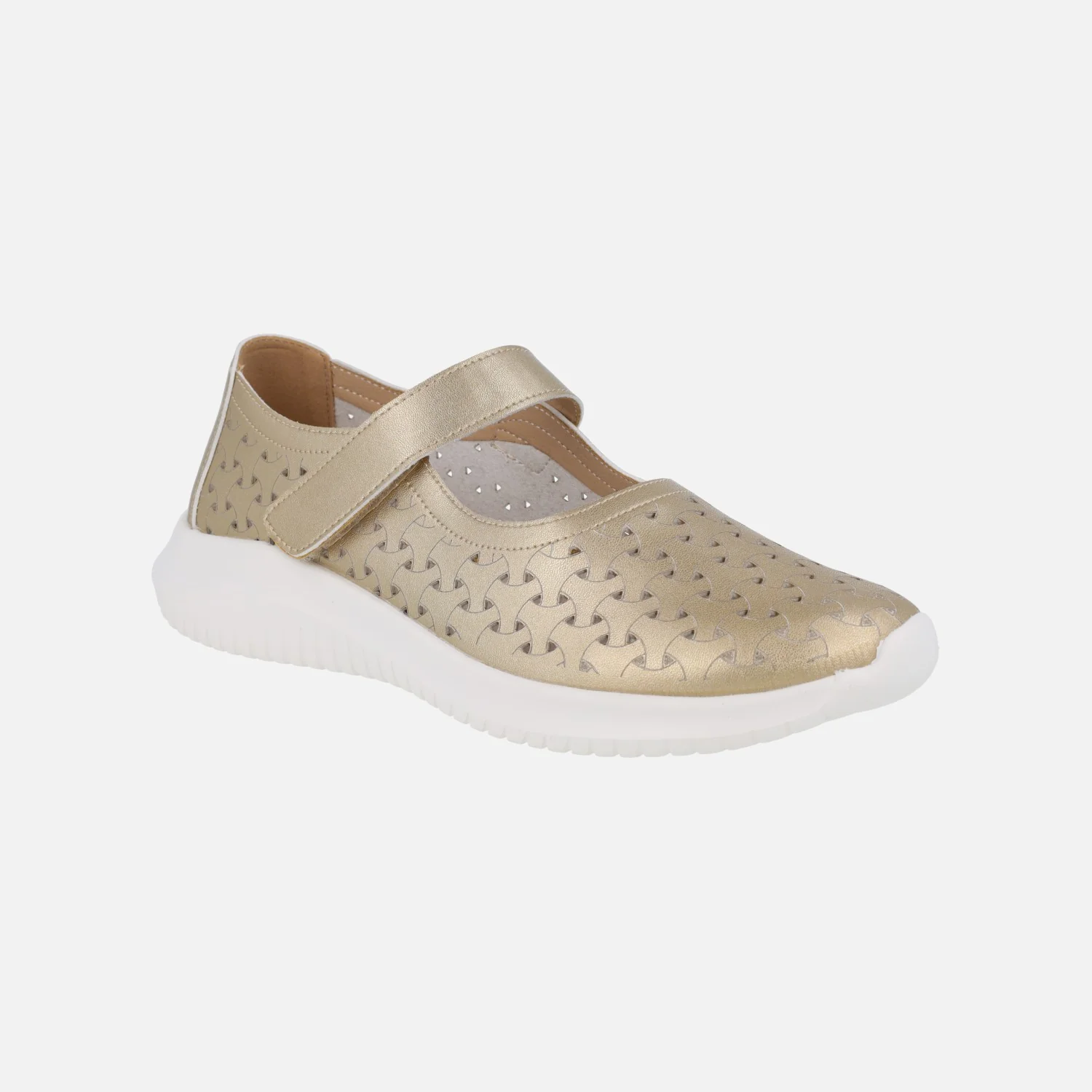 Zapatillas deportivas para mujer estilo merceditas de la marca Ecoligeros modelo Isa. Mercedes elaboradas en materiales sintéticos, con dibujos a láser y picados, cierre de velcro. Interiores en combinado de sintéticos y piel. Plantillas extraíbles. Piso de goma super ligero, con una altura trasera de 3 cms. Detalle de logo «Ecoligeros» grabado en el talón. Disponibles en oro, kaki, azul jeans y beige.