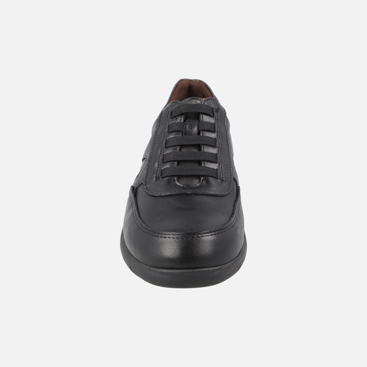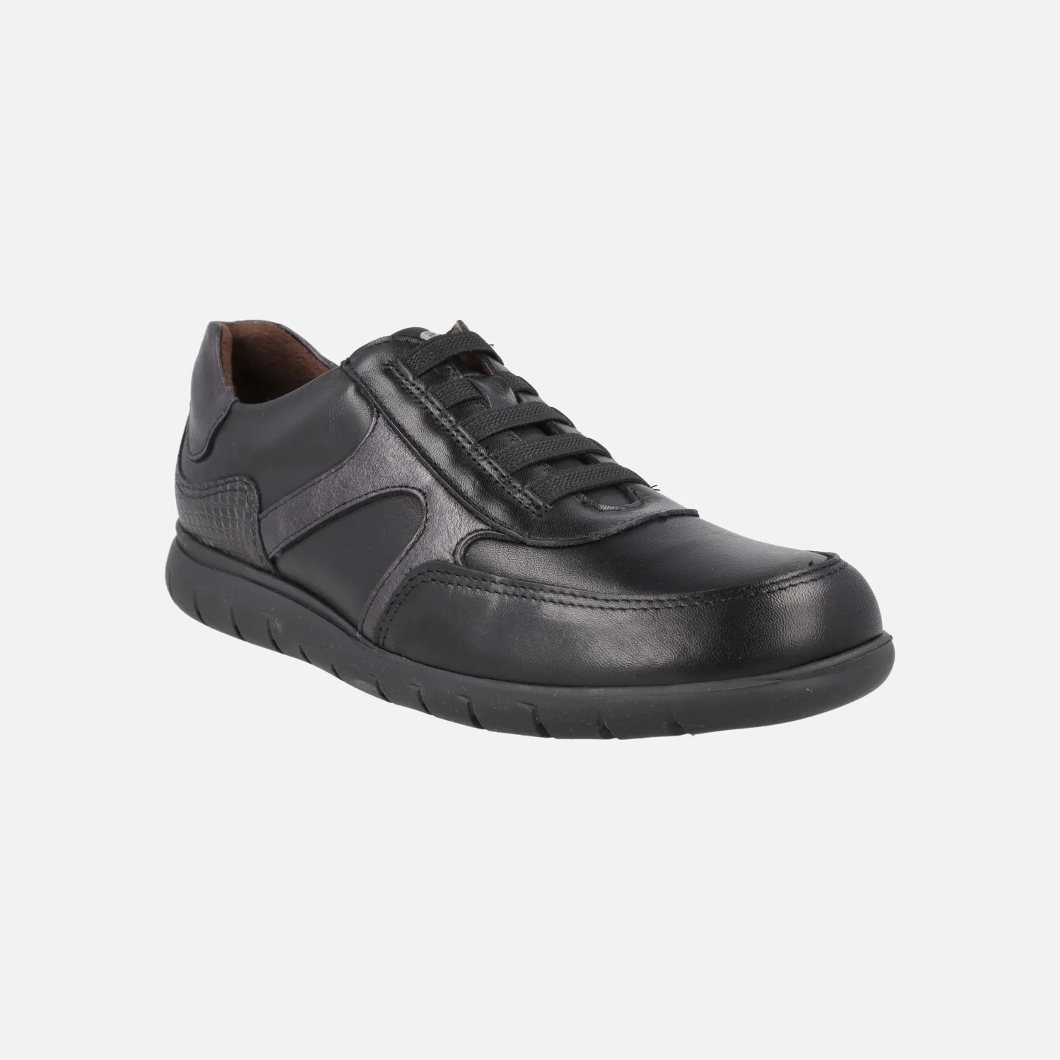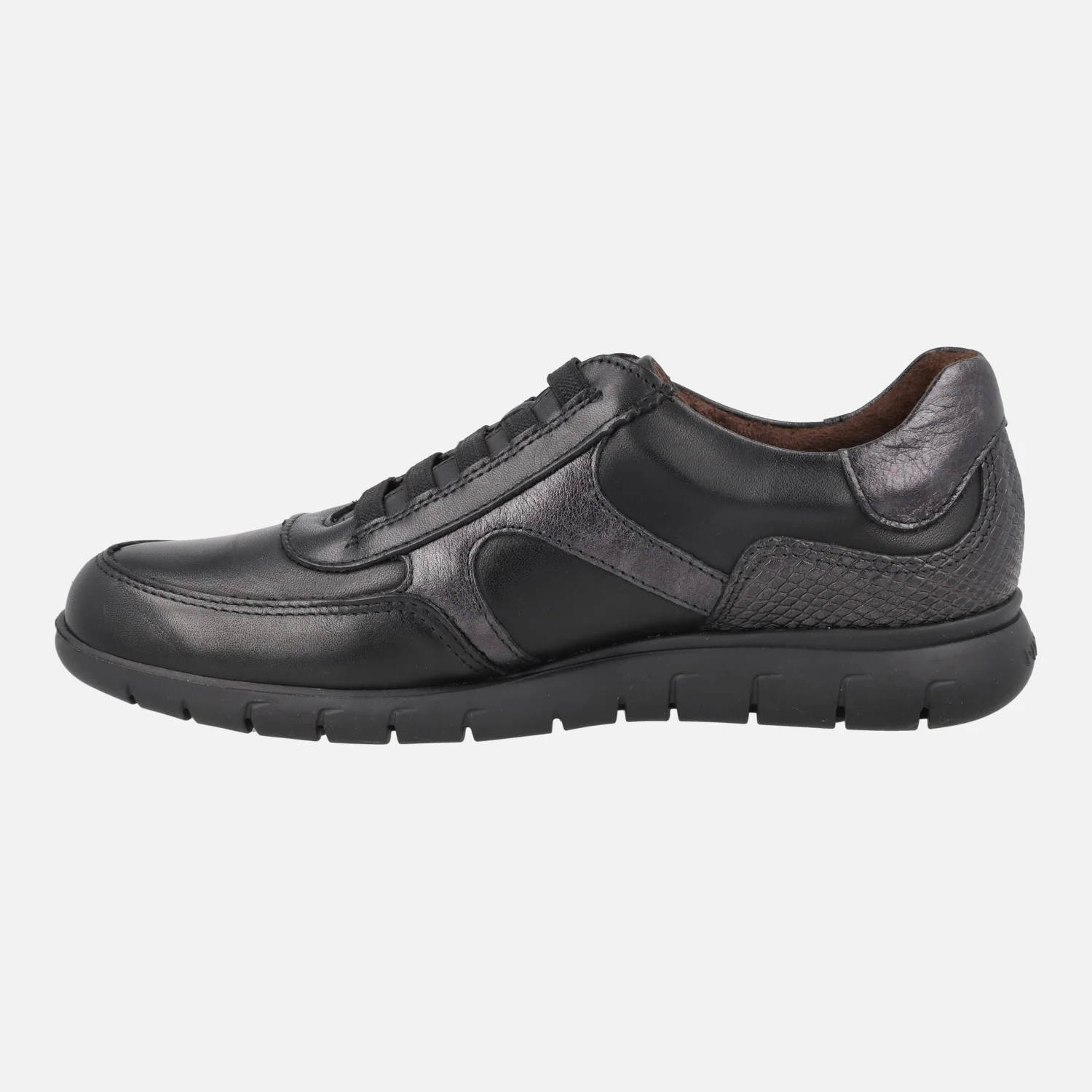 Zapatos confort de estilo deportivo para mujer de la marca Pitillos, modelo 20211 de la línea Pasodoble. Zapatos de piel con detalle de gomas elásticas en la parte frontal. Elaborados en piel negra combinada con metalizado plomo y grabado coco. Interior textil con plantillas extraíbles. Piso sintético con 2,5 cm de altura trasera y 1cm en la parte delantera.