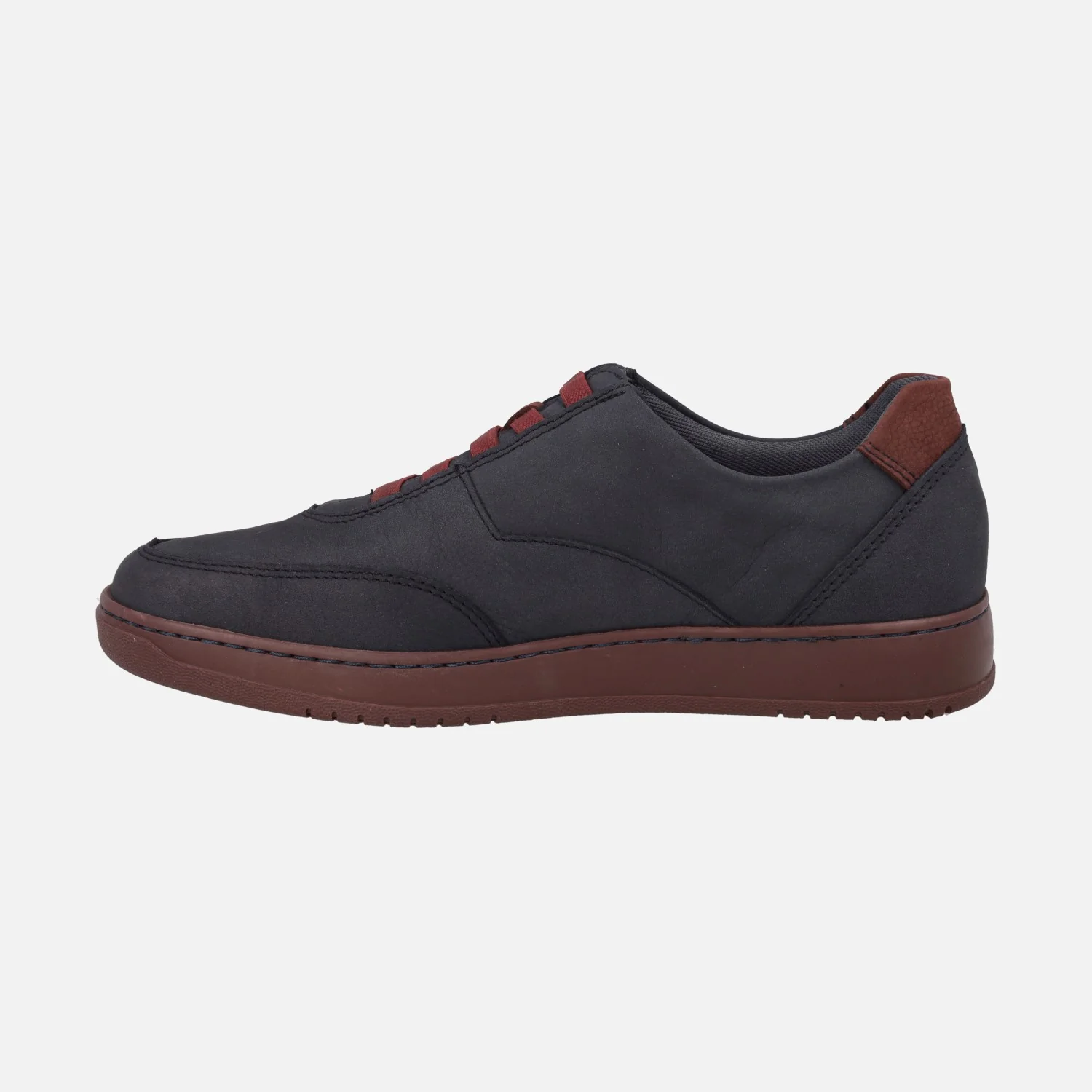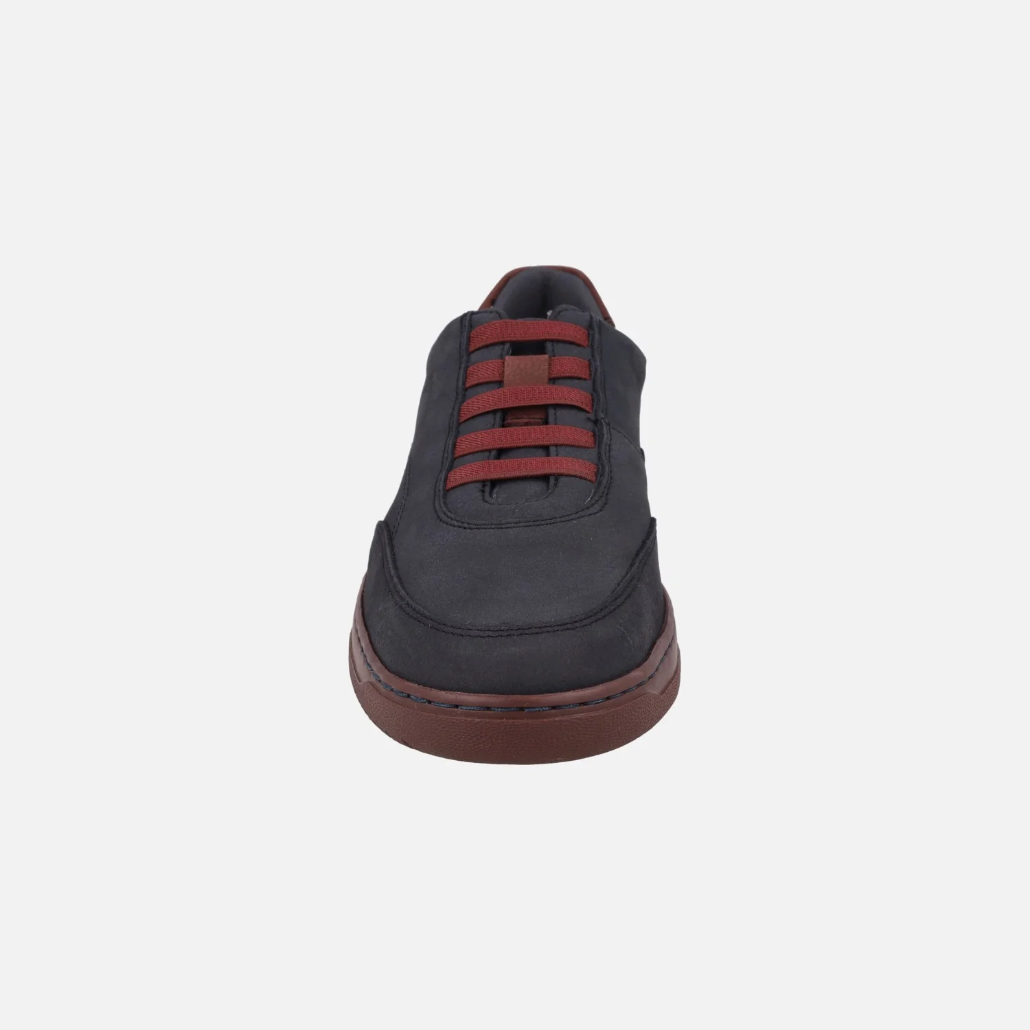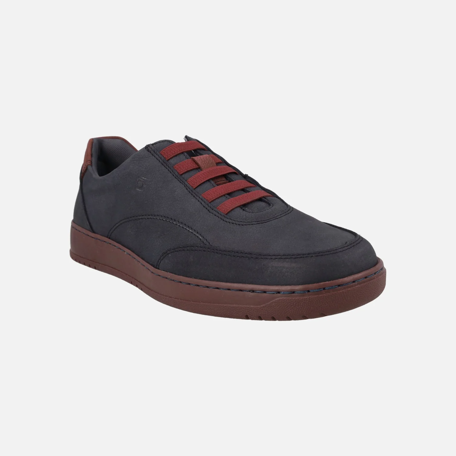 Zapatos deportivos para hombre de la marca Ricardo Hernandez modelo 40260 Marino. Deportivos elaborados en piel nobuck azul marino, con cierre de gomas elásticas en rojo en la parte frontal. Piso y talonera contrastados en burdeos. Interior textil con plantillas extraíbles. Suela sintética.