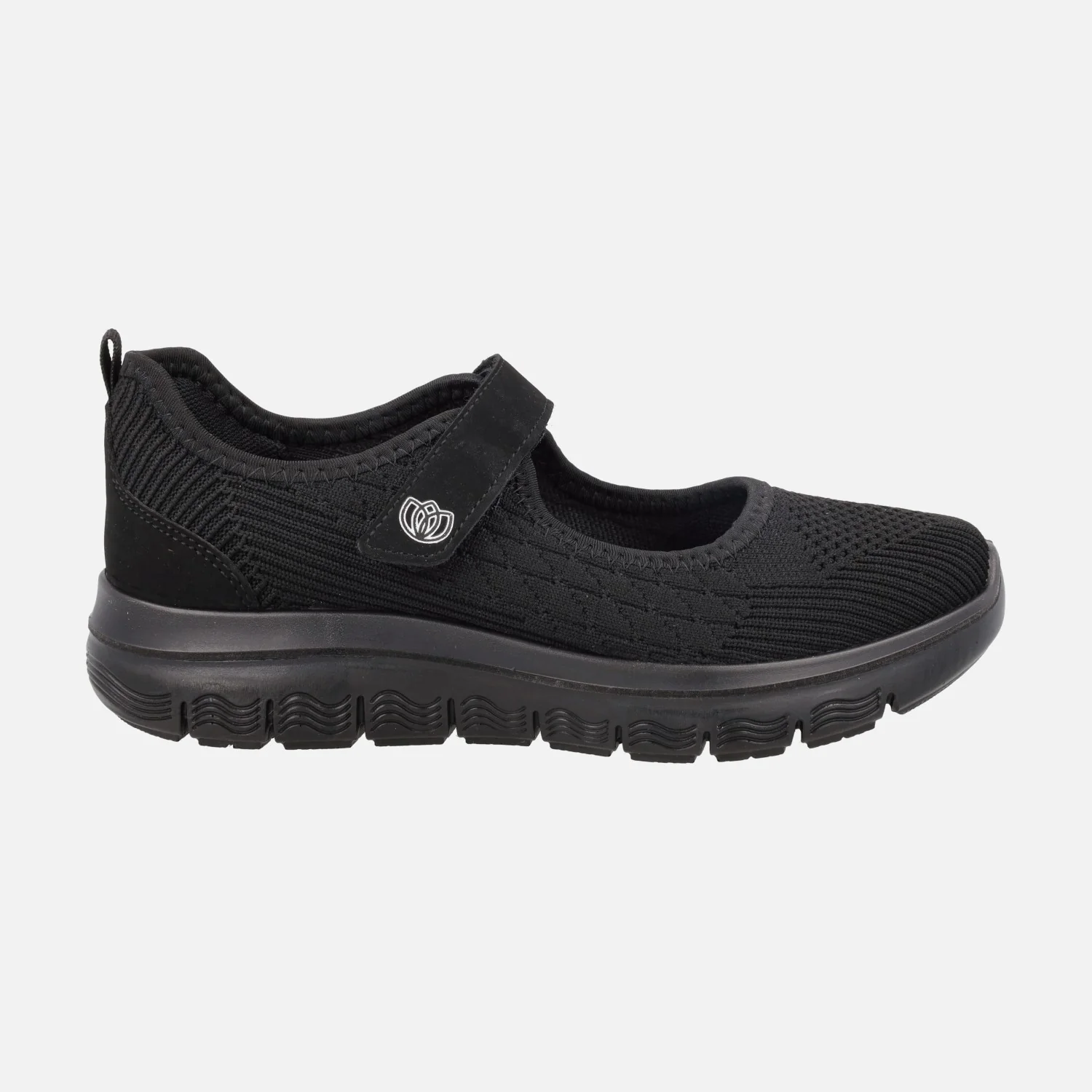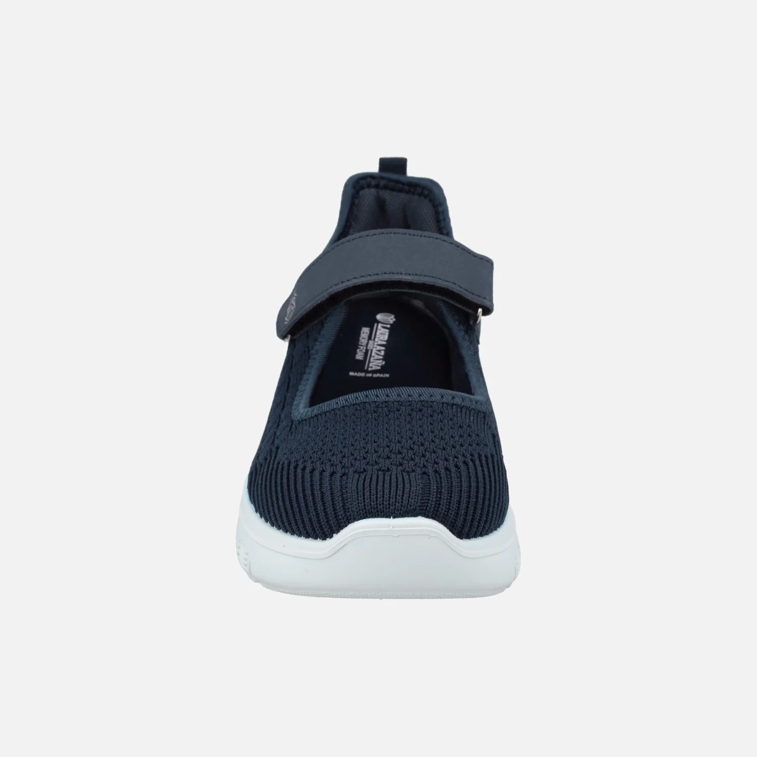 Zapatos estilo mercedes de la marca Laura Azaña modelo LA24507 disponibles en negro y en azul marino. Deportivas elaboradas en tejido con tira que cruza el empeine y cierra con velcro. Interior textil con plantillas extraíbles. Suela sintética, muy ligera, de 3,5 cm de altura trasera y 2,5 cm parte delantera.