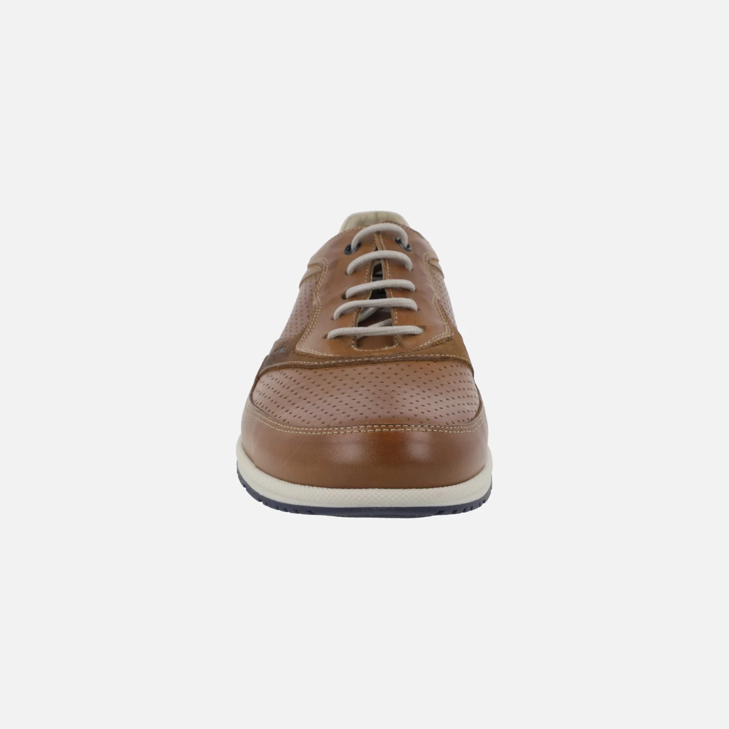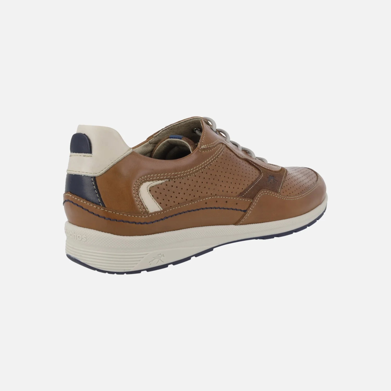 Zapatos de estilo deportivo para hombre de la marca Fluchos modelo Jaden F1738 Cuero. Zapatos deportivos elaborados en piel y serraje marrón cuero con detalles en beige y azul marino. Picados en la piel. Interiores en tejido, con plantillas extraíbles. Cierre de cordones. Piso de goma.