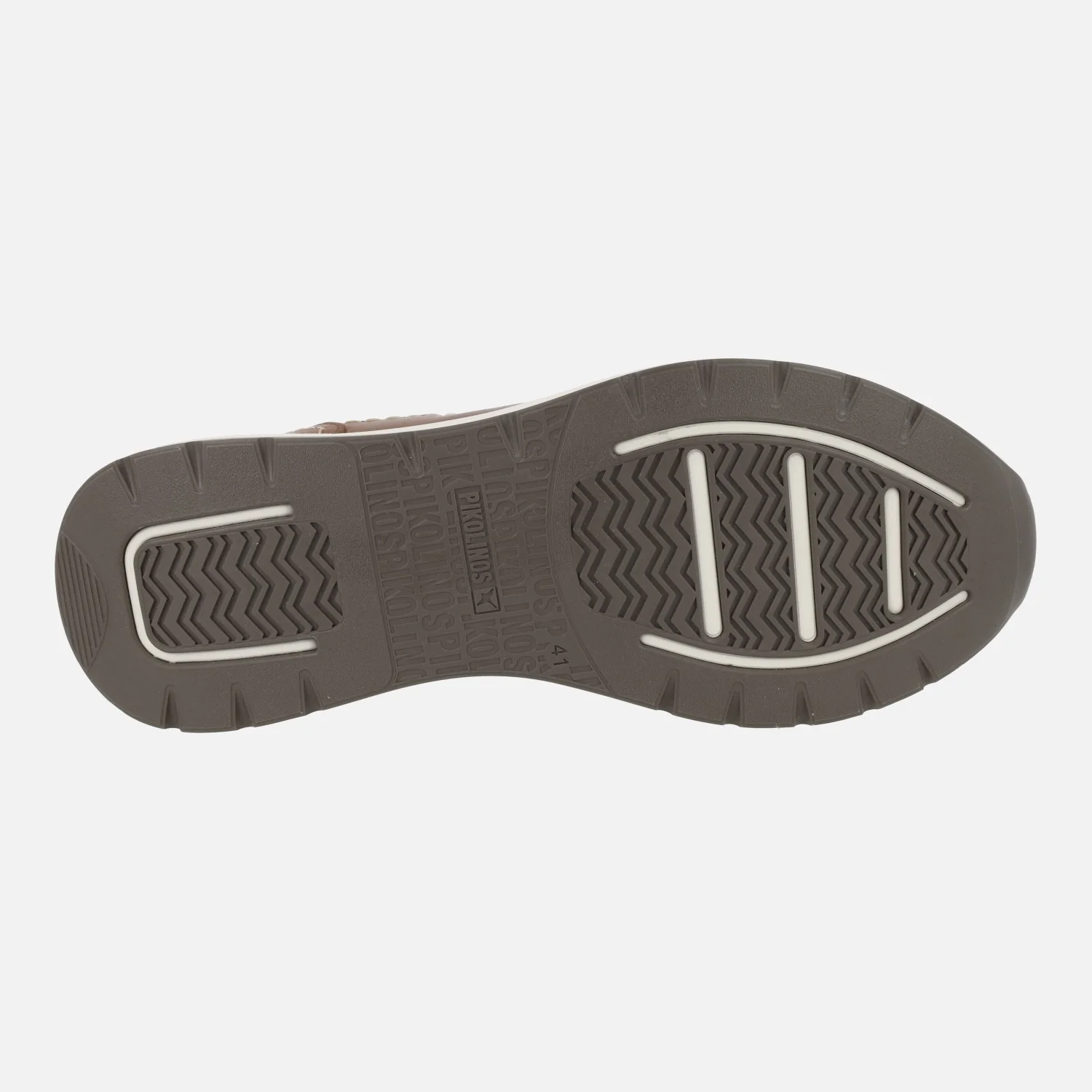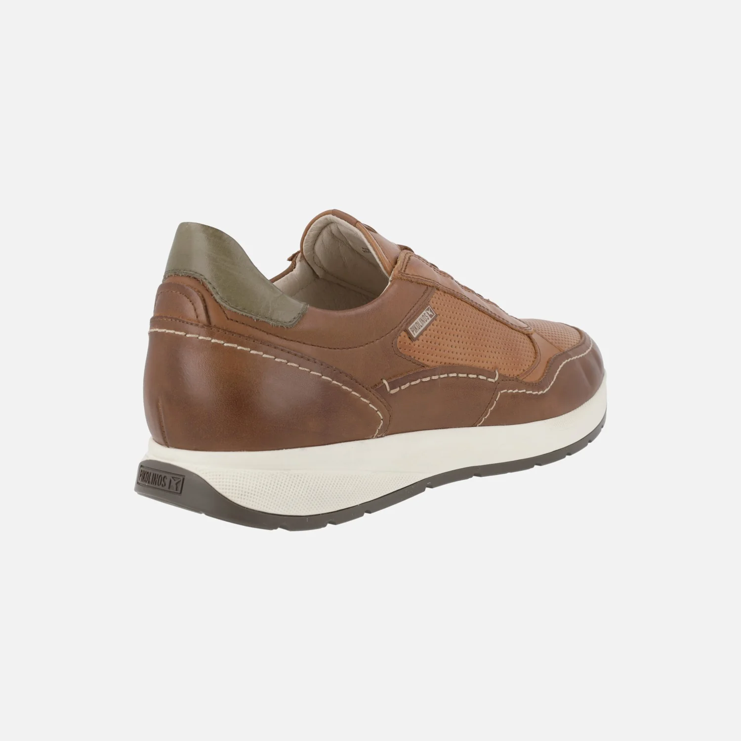 Zapatos deportivos de piel para hombre de la marca Pikolinos, modelo Getafe M2B-6284C1 Cuero. Zapatos deportivos de piel marrón cuero, con detalles en kaki en el talón. Picados laterales. Cordones elásticos. Interiores en piel y tejido, con plantillas extraíbles. Piso de goma super ligero Extralight.
