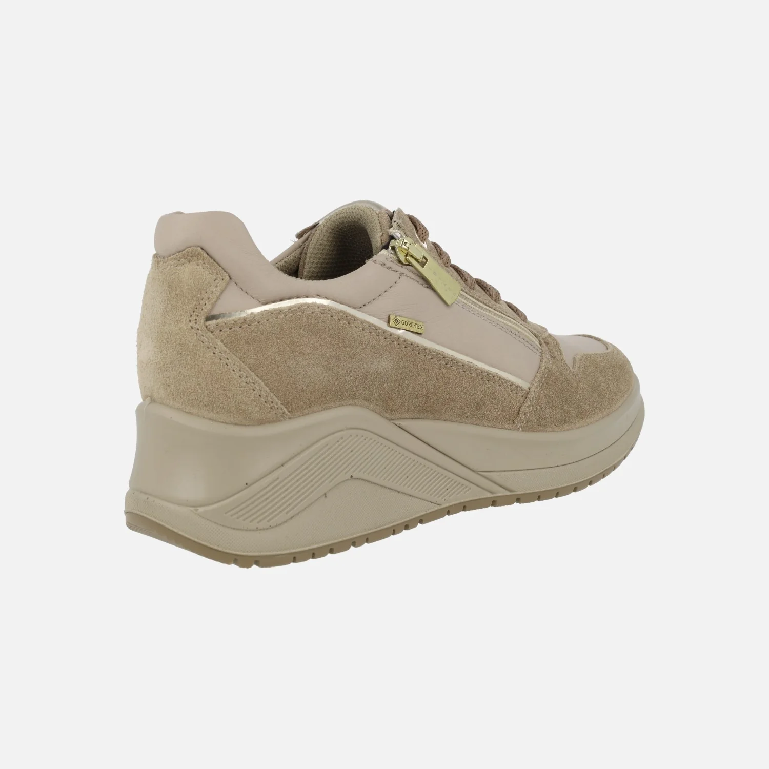Zapatos deportivos para mujer de la marca Igi&co modelo 86546 Biscotto. Deportivas elaboradas en piel y serraje color beige/camel, con cordones en la parte delantera y cremallera en el lado exterior. Membrana interior impermeable de Gore tex. Forro textil, plantillas extraíbles forradas en piel. Piso sintético con cuña de 5,5 cm de altura trasera (2,5 cm plataforma delantera).