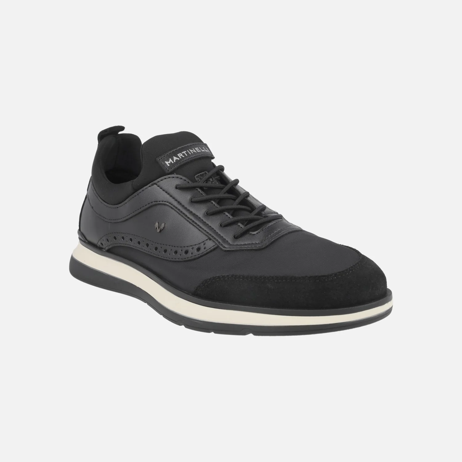 Elegantes zapatos deportivos para hombre de la marca Martinelli, modelo Walden 1606-2733X Black. Sneakers para hombre elaboradas en combinado de piel lisa, serraje y tejido, con cordones elásticos. Interior mixto en tejido y otros materiales. Suela sintética bicolor.