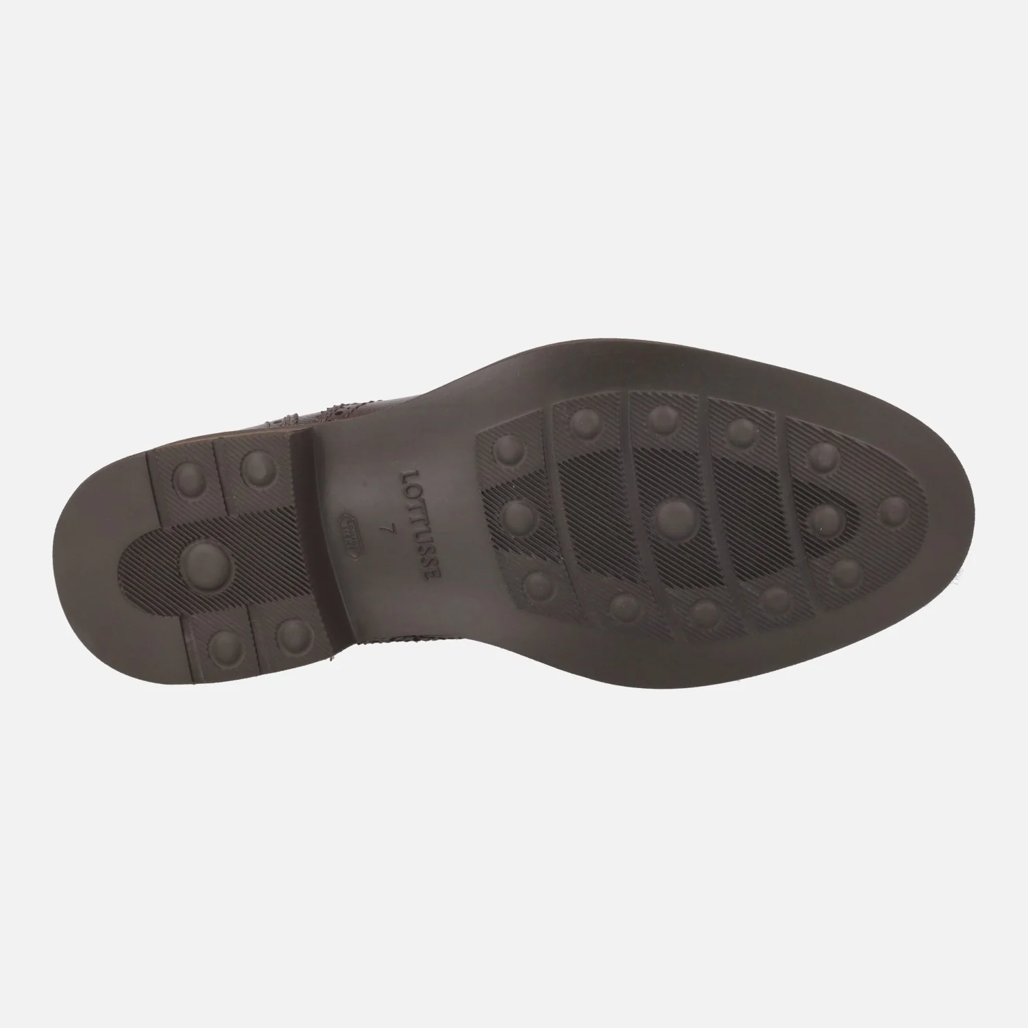 Elegantes zapatos de cordones para hombre de la marca Lottusse modelo LL07248 en piel marrón. Zapatos blucher pala vega, con detalle de picados. Elaborados en piel marrón con cierre de cordones textiles. Interiores forrados de piel. Plantillas extraíbles. Fabricación Goodyear. Suela de goma. Fabricados en España.
