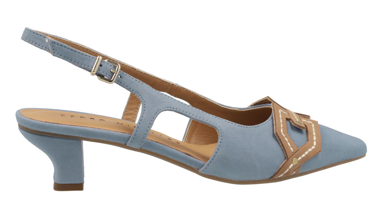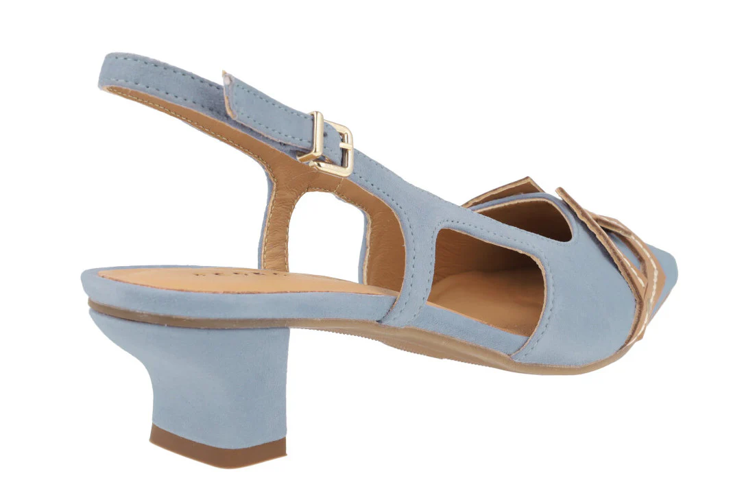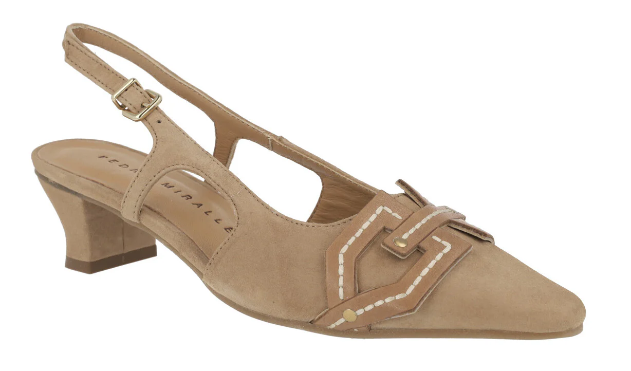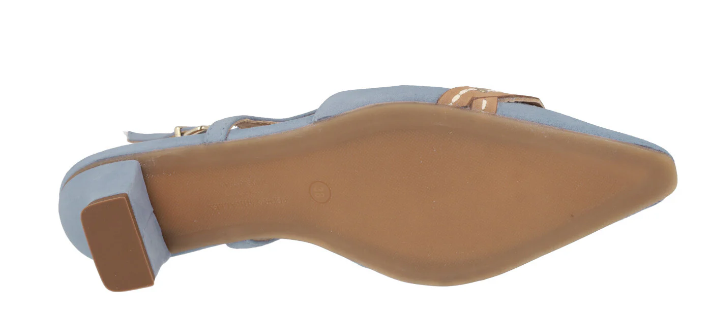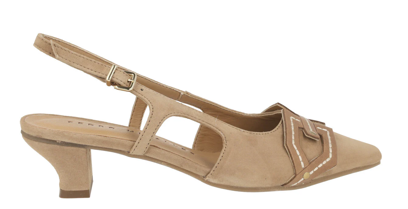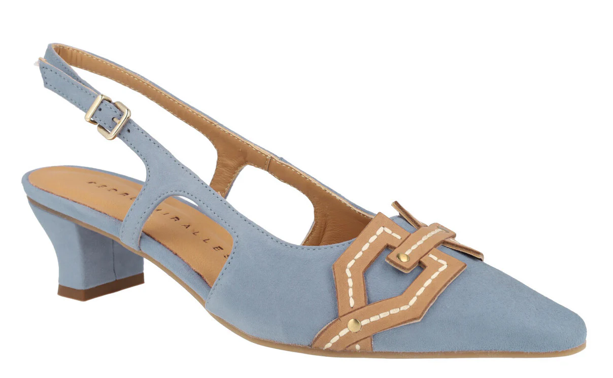 Elegantes zapatos de salón destalonados Pedro Miralles Belluno 13728, disponibles en amalfi cuoio (camel) o amalfi cerulean (celeste). Zapatos destalonados de ante con adorno en piel en la pala. Tira al talón con cierre de hebilla. Forro y planta de piel. Tacones bajos, forrados, de 5 cms de altura. Made in Spain.