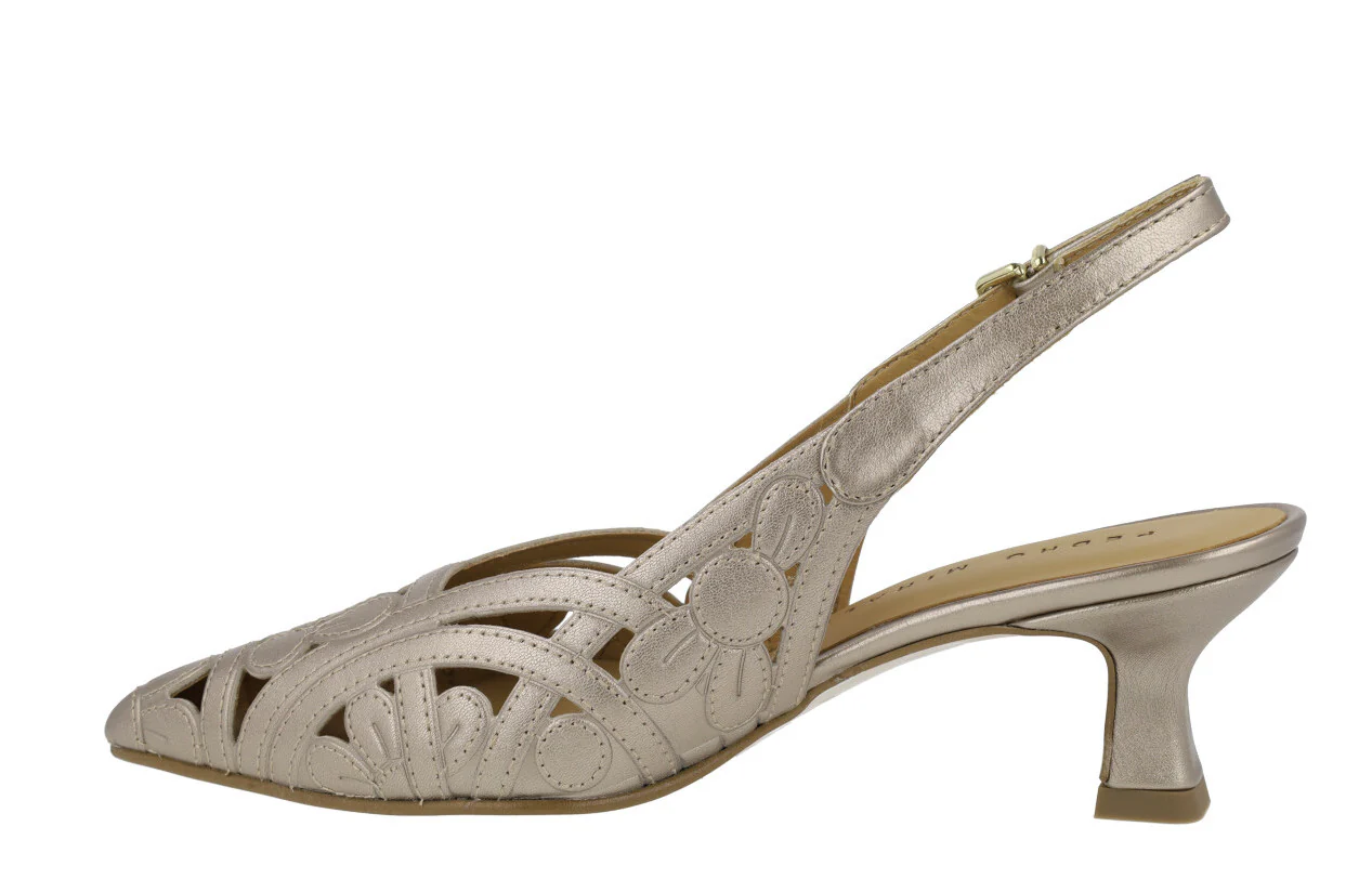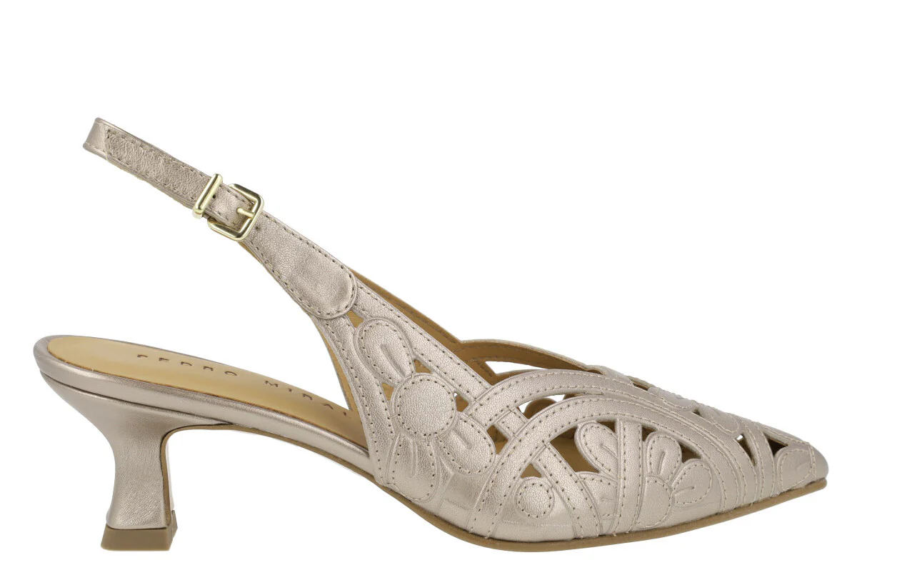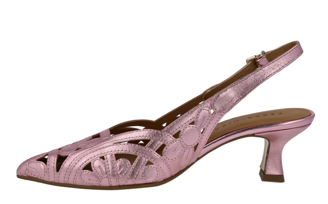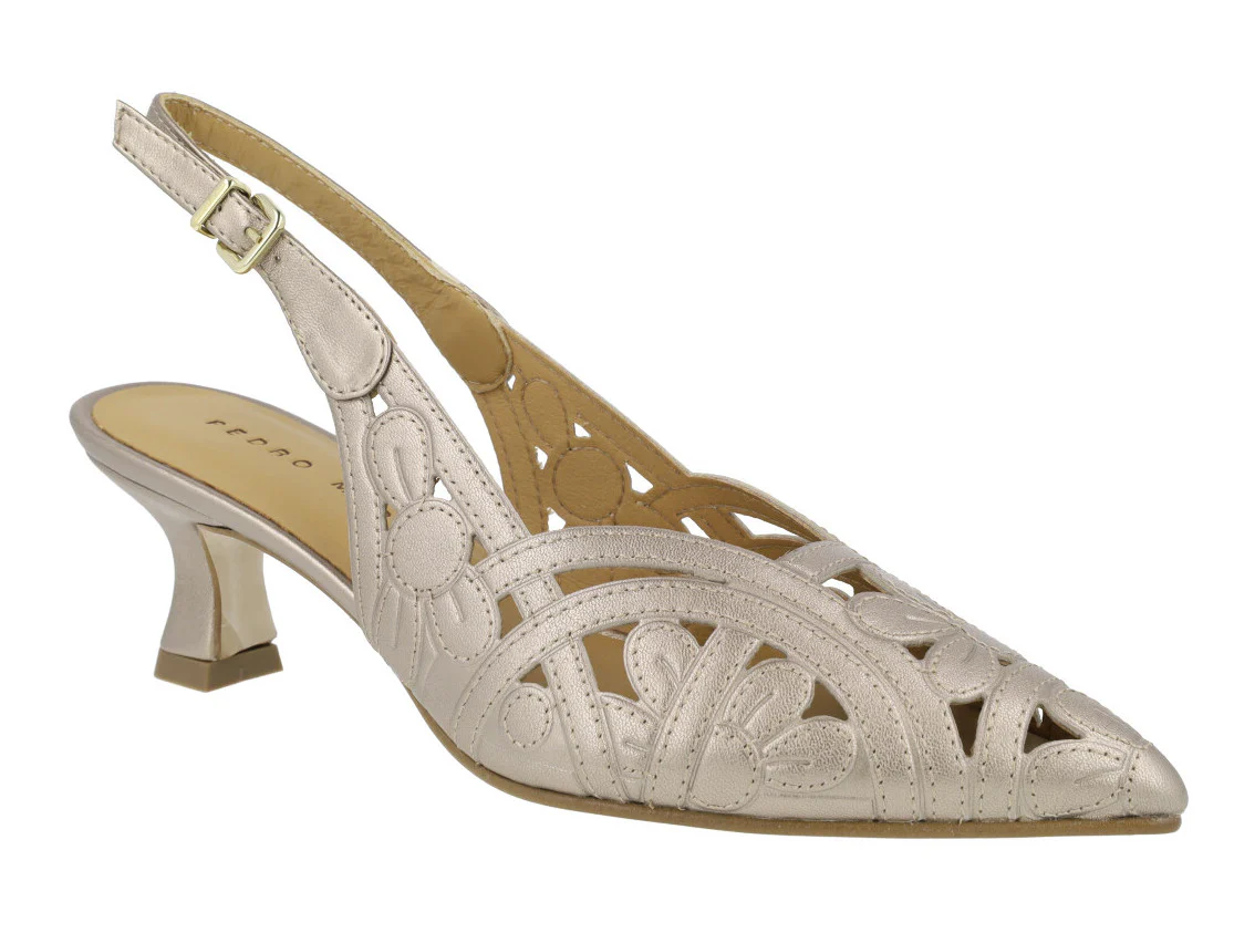 Preciosos zapatos destalonados Pedro Miralles 13778 Soulme. Zapatos de piel metalizada, con tira al talón y diseño troquelado. Cierre de hebilla. Disponibles en rosa metalizado (topaz) o en un color oro tirando a bronce (humo). Interiores de piel, forro y planta. Horma afilada. Tacones bajos, forrados, de aproximadamente 6,5 cms de altura. Made in Spain.