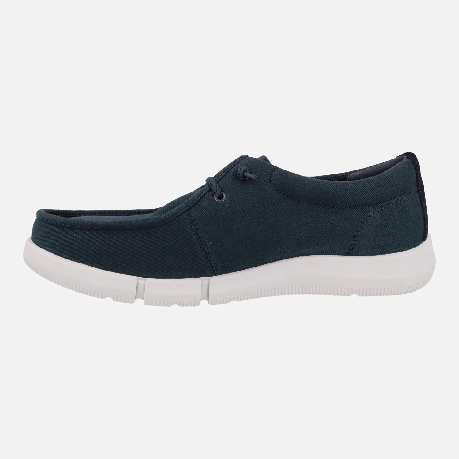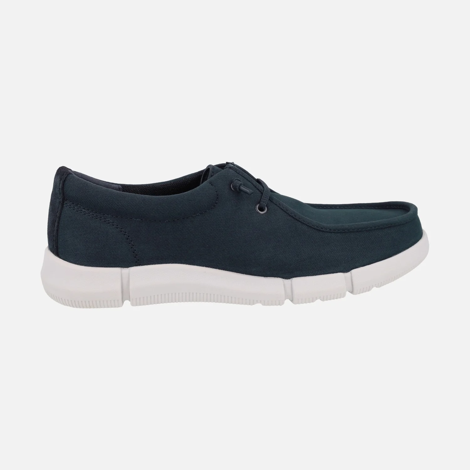 Zapatos blucher para hombre de la marca Geox modelo U 4546C Adacter. Zapatos de cordones elaborados en tejido azul con cordones elásticos. Detalle de pieza en ante en la talonera. Planta y forro textil combinado con otros materiales. Piso ligero de goma.