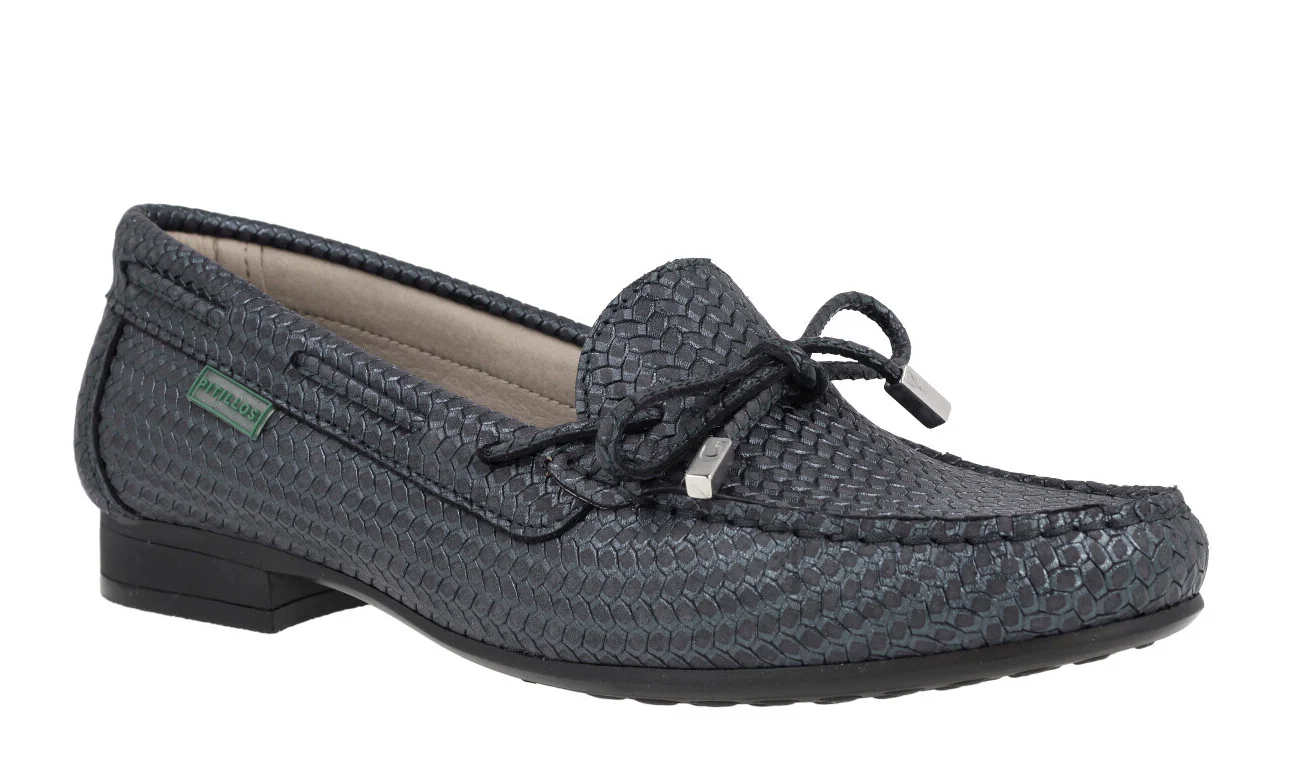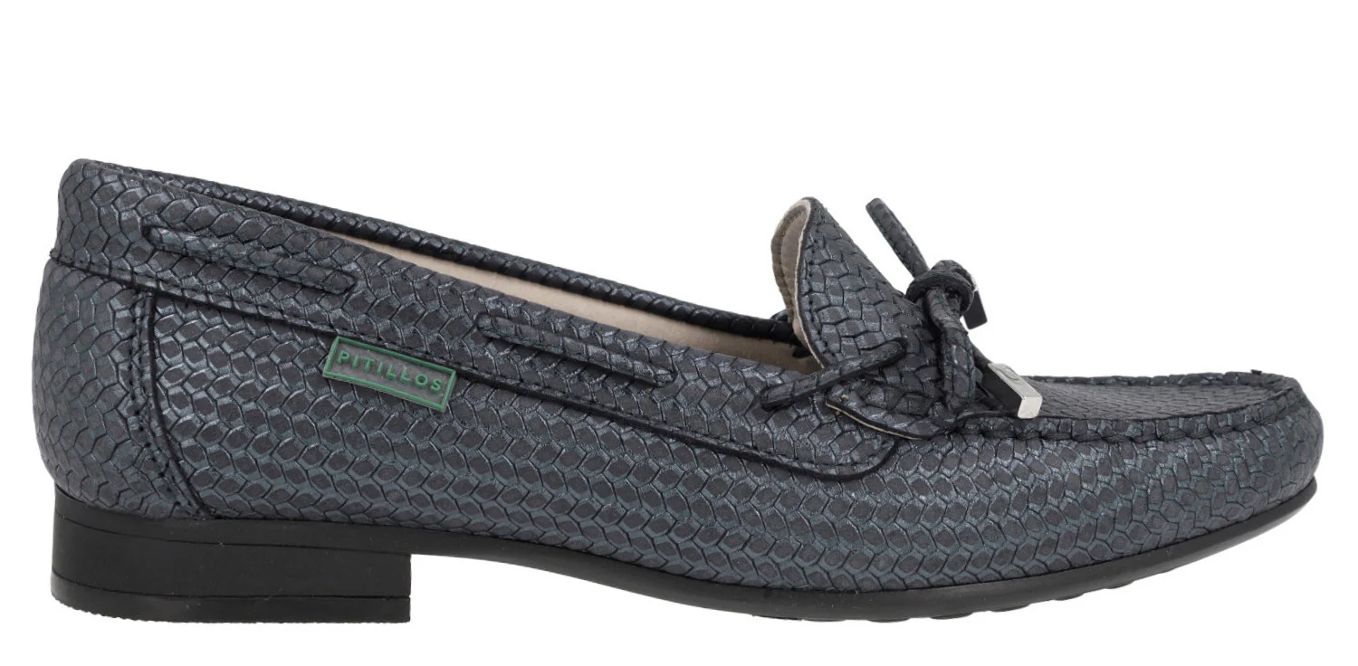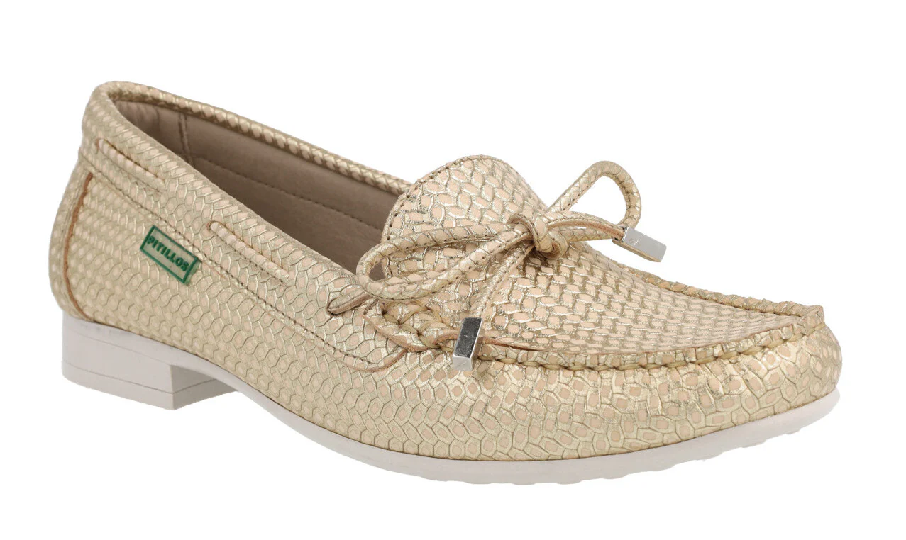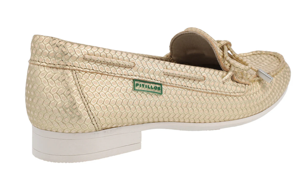 Zapatos mocasines para mujer de la línea Silvia Hernandez de la marca Pitillos, modelo 3611. Zapatos mocasines elaborados en piel grabada, en combinado oro o azul marino, con adorno de lazo. Interior mixto de tejido y otros materiales (forro técnico compuesto por un entramado de fibras que ofrece grandes propiedades de confort y transpiración). Piso fino de goma con 2 cms de altura. Made in Spain.