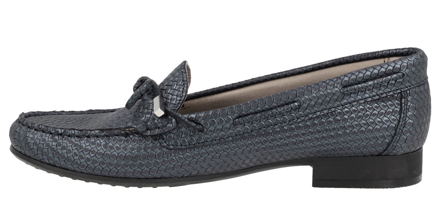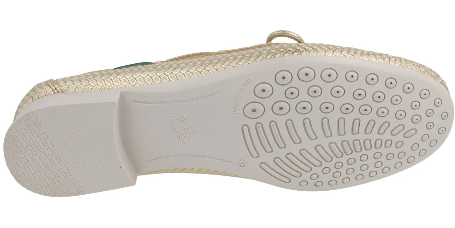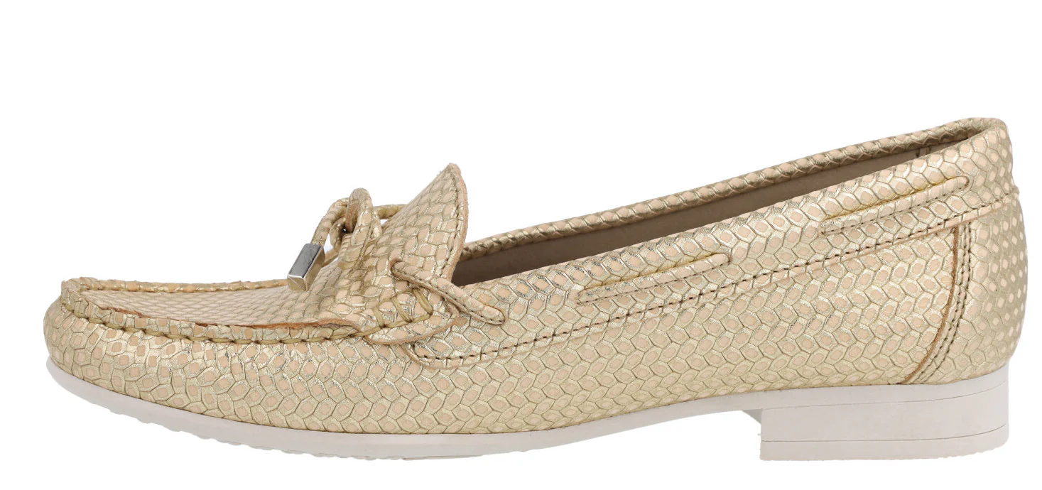 Zapatos mocasines para mujer de la línea Silvia Hernandez de la marca Pitillos, modelo 3611. Zapatos mocasines elaborados en piel grabada, en combinado oro o azul marino, con adorno de lazo. Interior mixto de tejido y otros materiales (forro técnico compuesto por un entramado de fibras que ofrece grandes propiedades de confort y transpiración). Piso fino de goma con 2 cms de altura. Made in Spain.