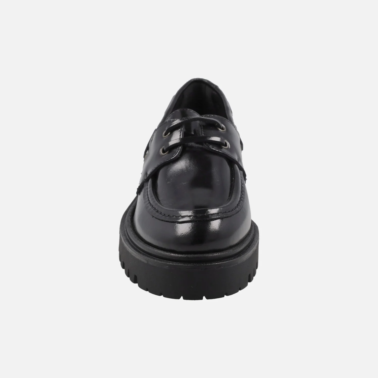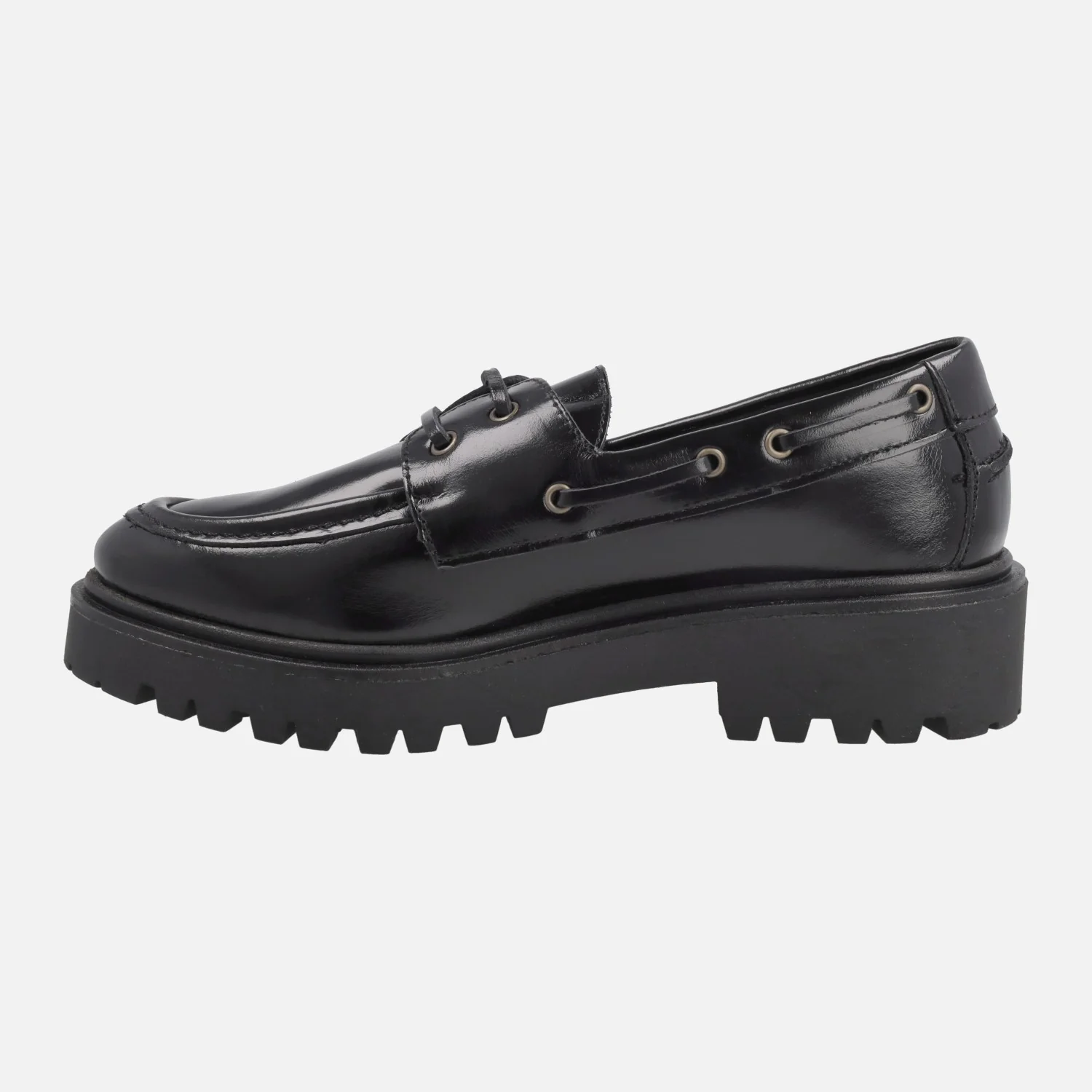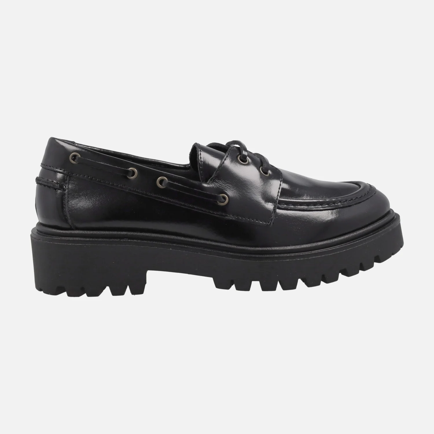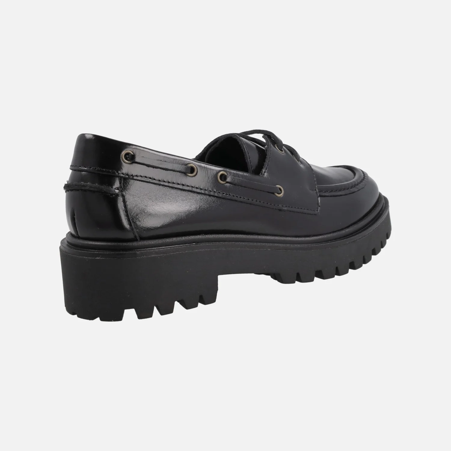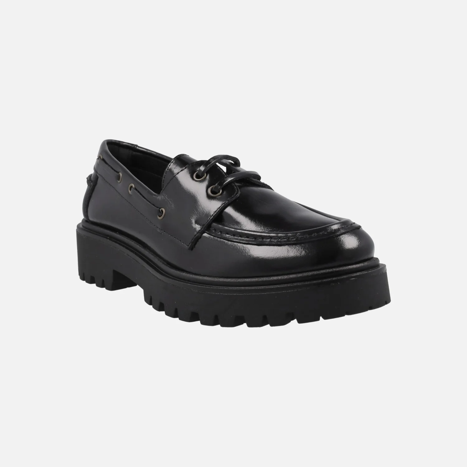 Zapatos náuticos para mujer con piso track modelo 4334 Negro de la marca Bryan Stepwise. Náuticos elaborados en piel florentik negra (semibrillo) con cierre de cordones. Interiores en combinado de piel y tejido. Piso de goma, estilo track, con 4 cm de altura trasera (2,5 cm plataforma delantera). Made in SPain.