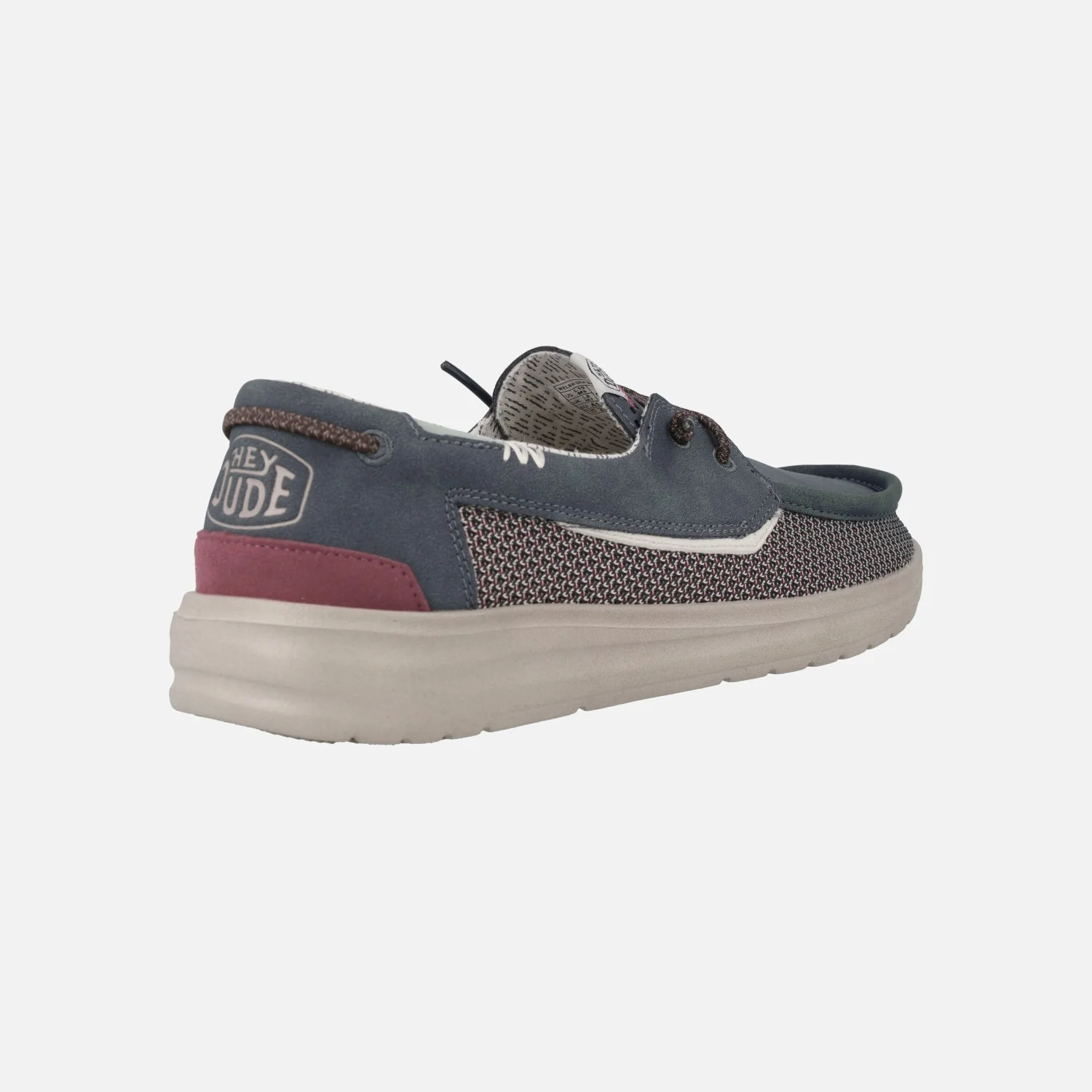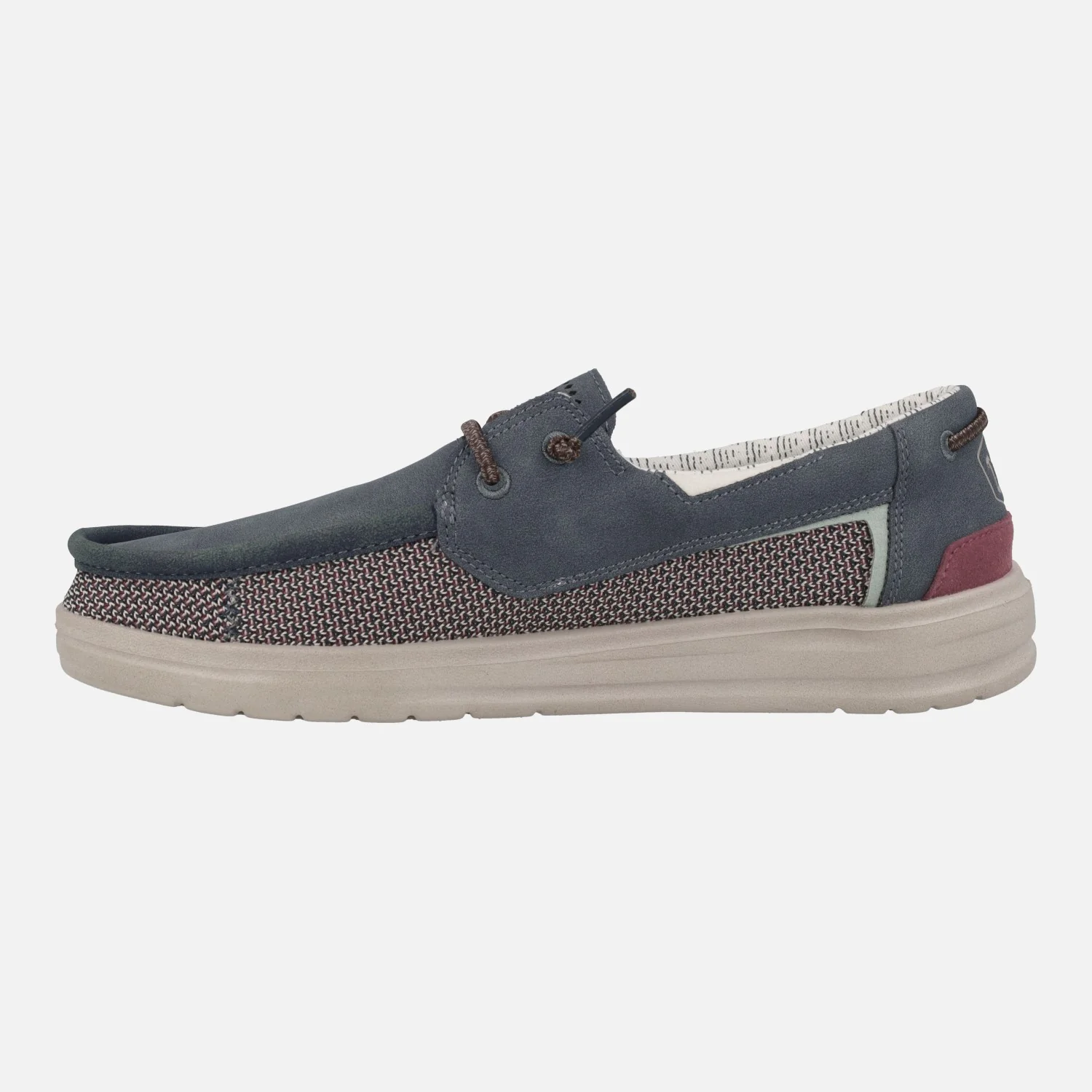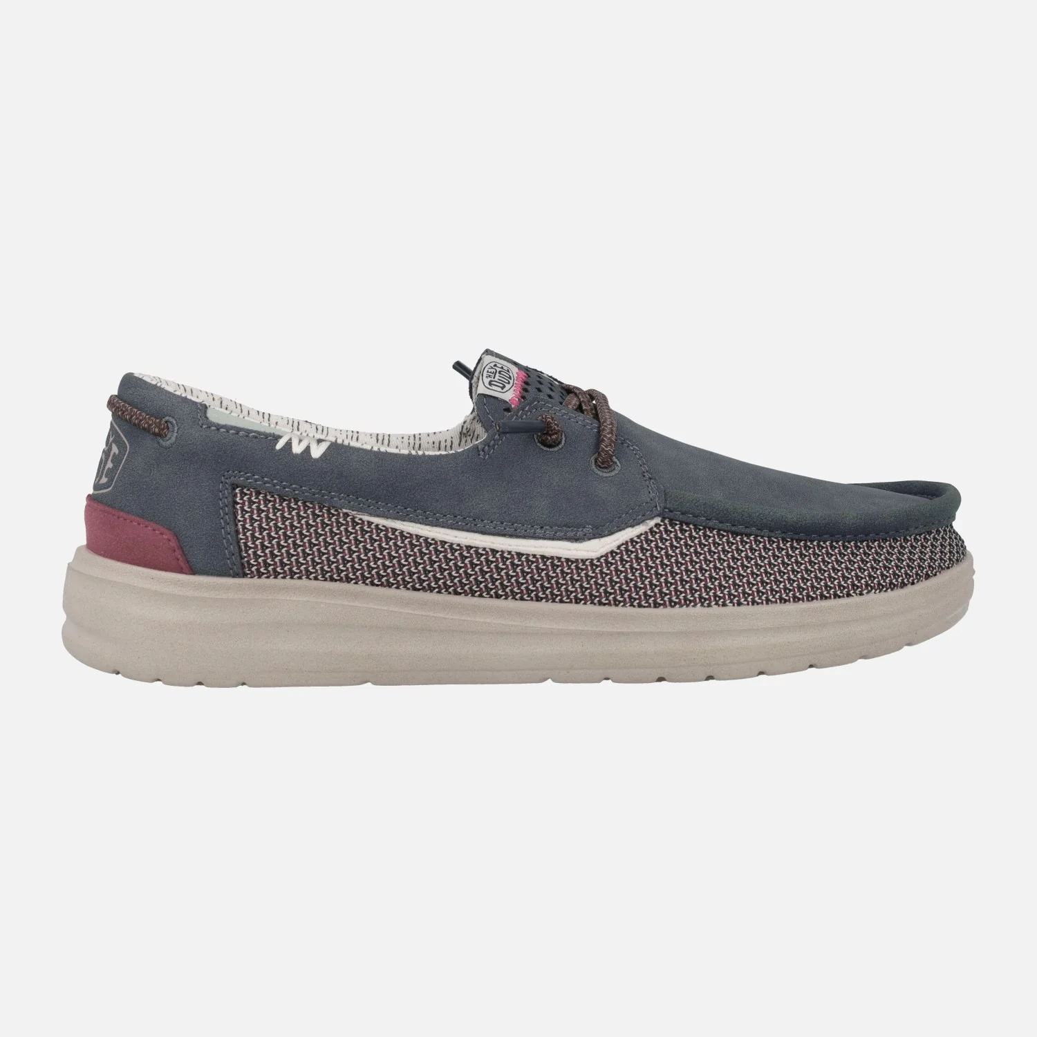 Zapatos náuticos para hombre de la marca Hey dude, modelo Welsh Grip. Disponibles en azul marino (deep blue). Elaborado en tejido y piel reciclada, con forro de algodón. Cordones elásticos para mayor comodidad. Plantillas de espuma con Memory foam forradas de cuero. Piso ligero de goma, ultraligero y transpirable.