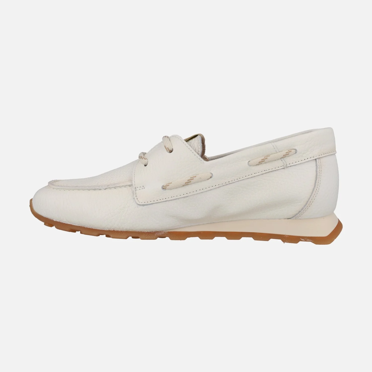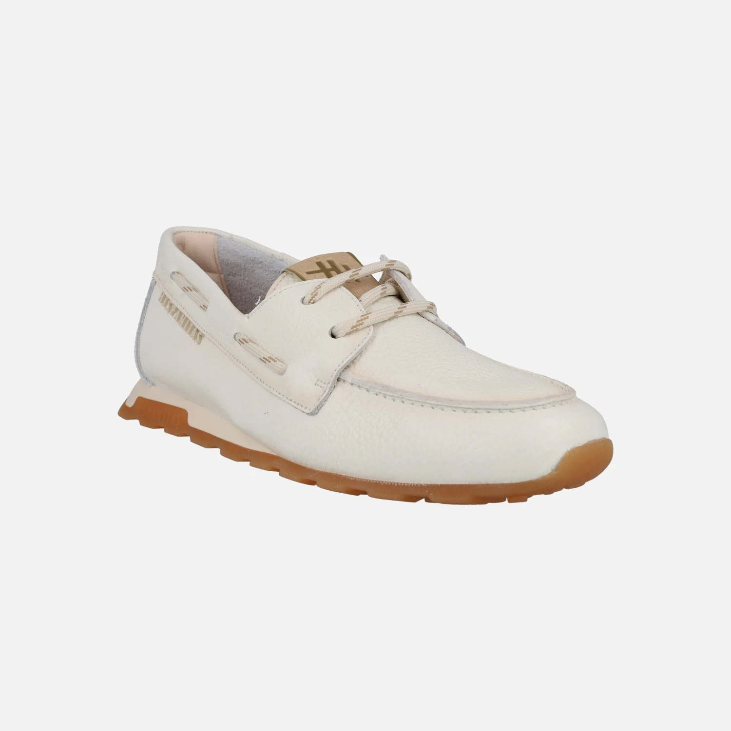 Zapatos náuticos para mujer de la marca Hispanitas modelo HV264603 Zinnia Panna. Náuticos elaborados en piel blanca con cierre de cordones textiles. Interiores en tejido microfibra, con plantillas extraíbles. Piso de goma con 2 cm de altura en la parte trasera. Tecnología TRIFLOW de triple almohadillado, para un gran confort al caminar.