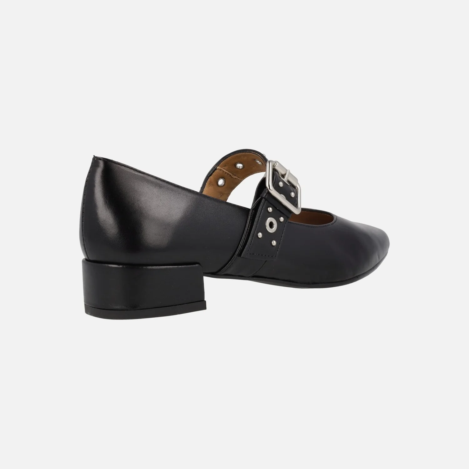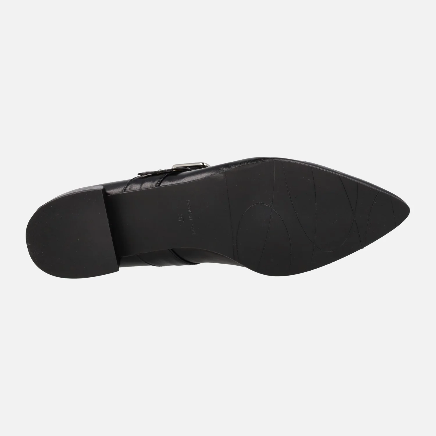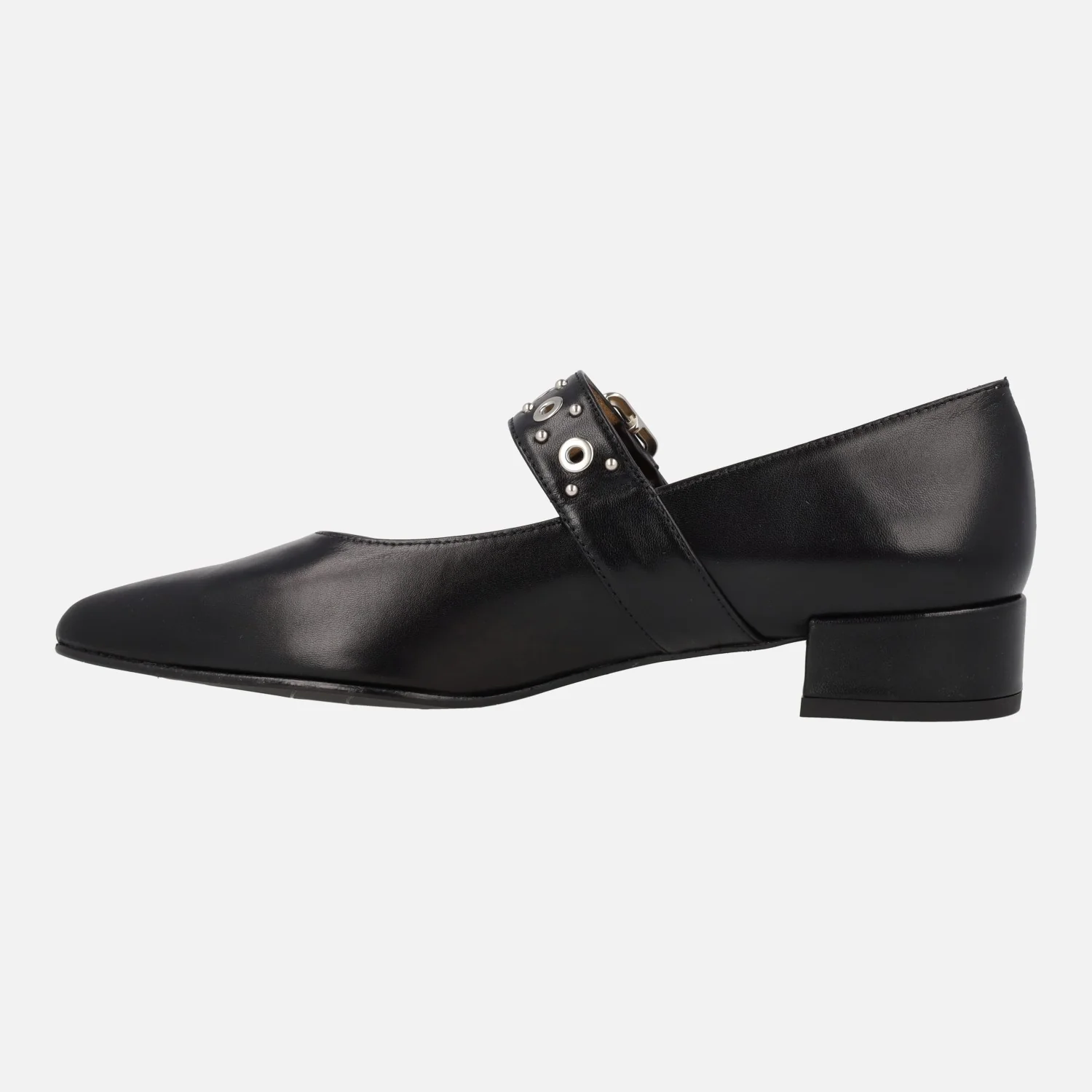 Bailarinas de tacón para mujer de la marca española Mirai modelo S-4173 Negro. Zapatos elaborados en piel negra, con detalle de tira que cruza al empeine estilo merceditas, con hebilla y tachas plateadas. Forro y planta de piel. Tacón bajo y ancho, de 3 cms de altura. Made in Spain.