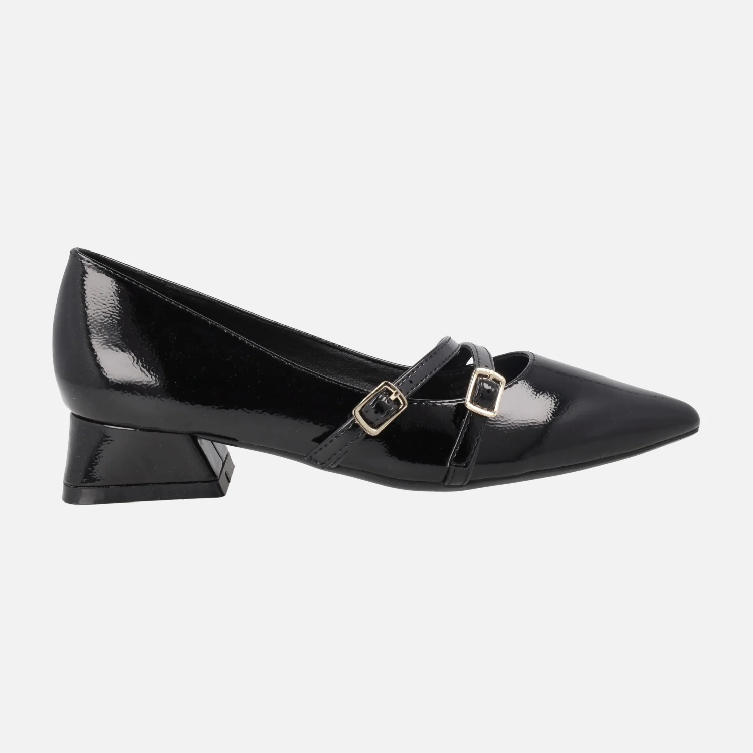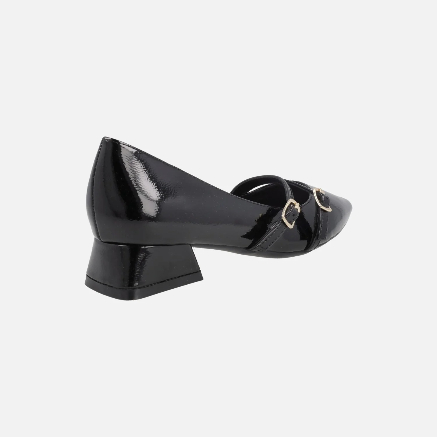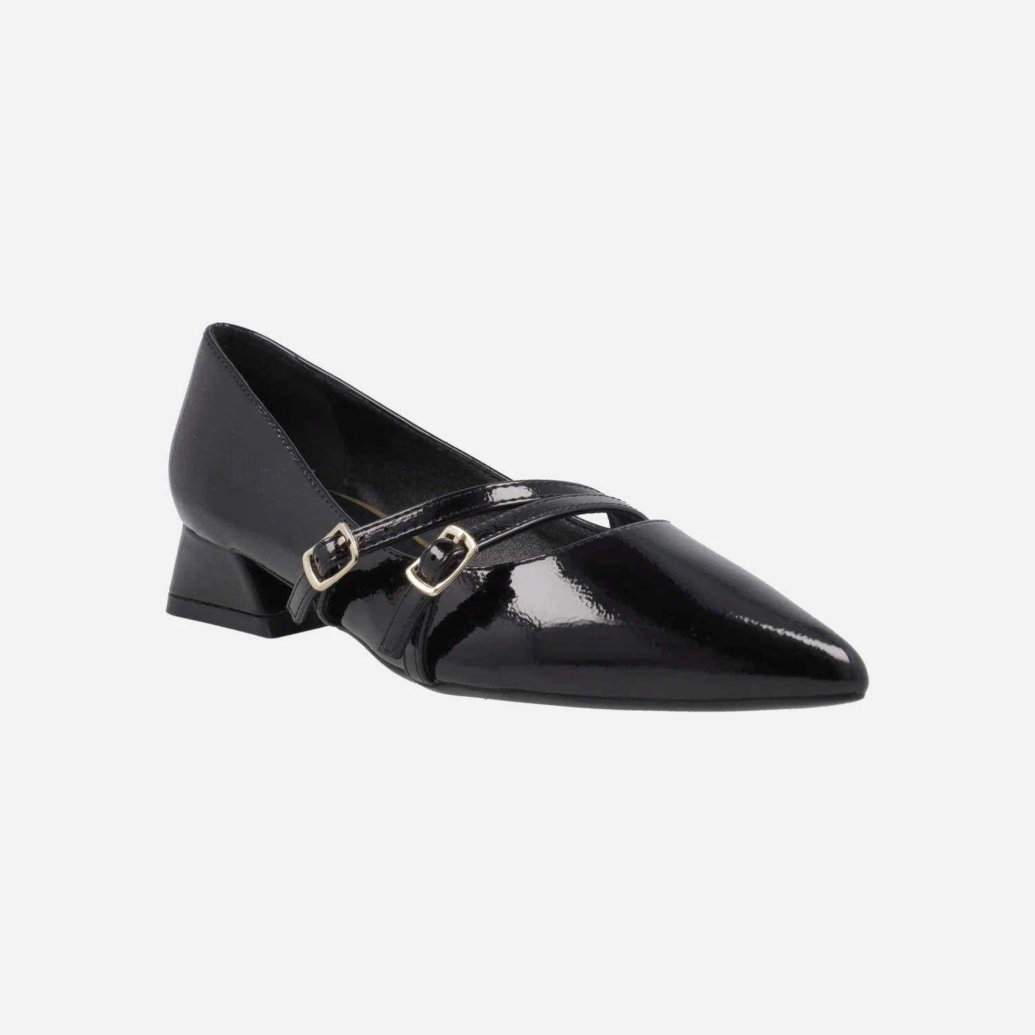Zapatos de tacón corte salón de la marca Gioseppo modelo Lucan 76897-P Negro. Zapatos elaborados en materiales sintéticos efecto charol, con dos tiras al empeine con cierre de hebilla dorada. Interiores en sintéticos, con planta acolchada. Punta afilada. Tacones de 3 cm. Suela de caucho.