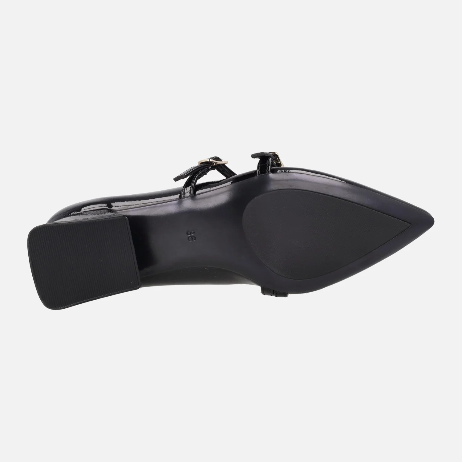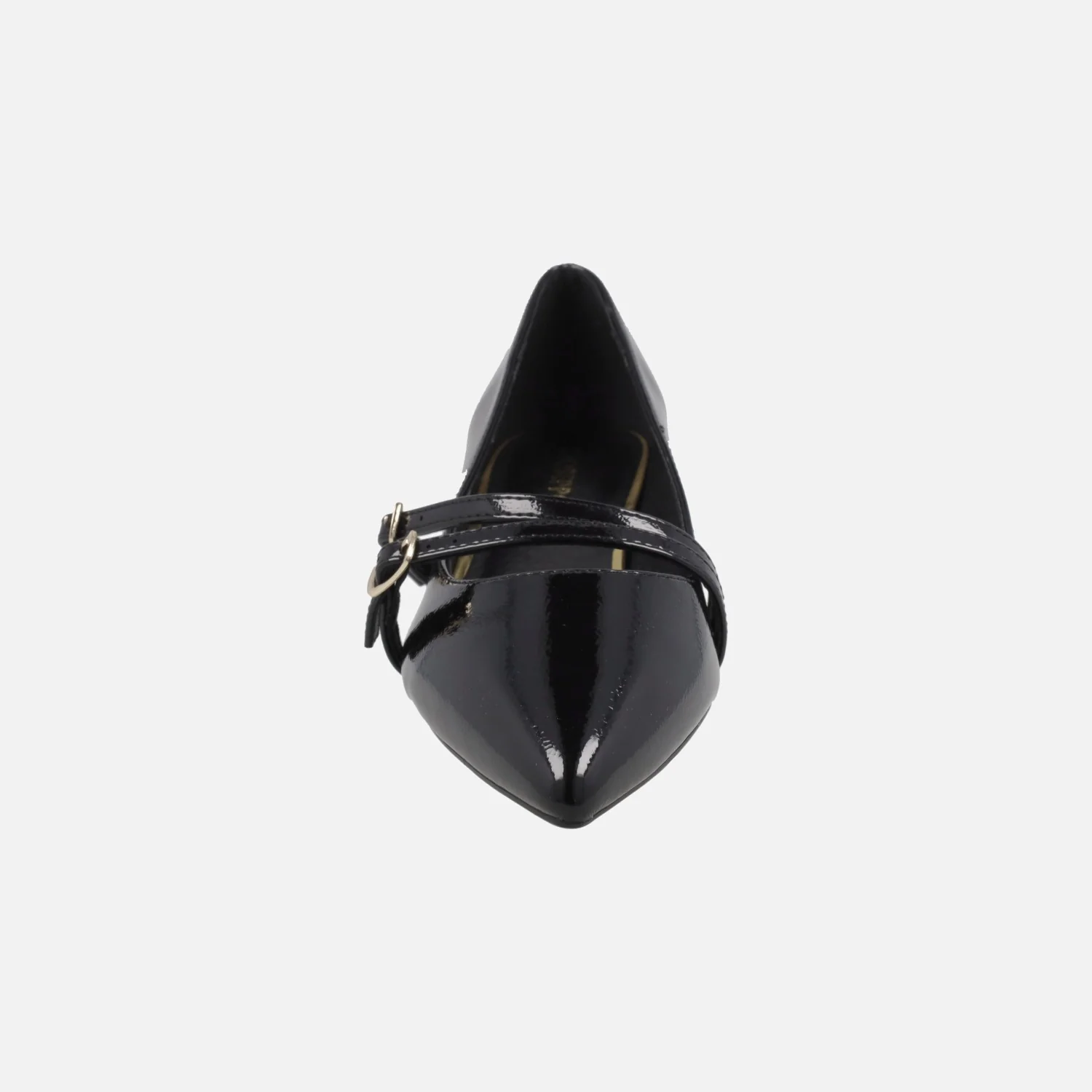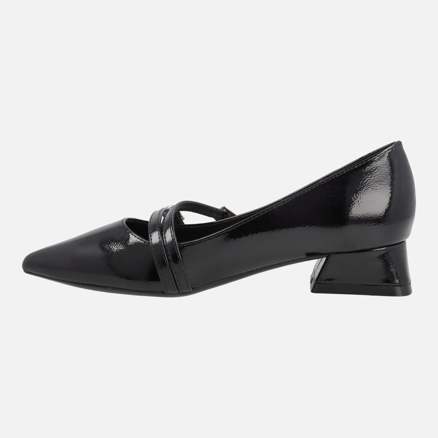 Zapatos de tacón corte salón de la marca Gioseppo modelo Lucan 76897-P Negro. Zapatos elaborados en materiales sintéticos efecto charol, con dos tiras al empeine con cierre de hebilla dorada. Interiores en sintéticos, con planta acolchada. Punta afilada. Tacones de 3 cm. Suela de caucho.