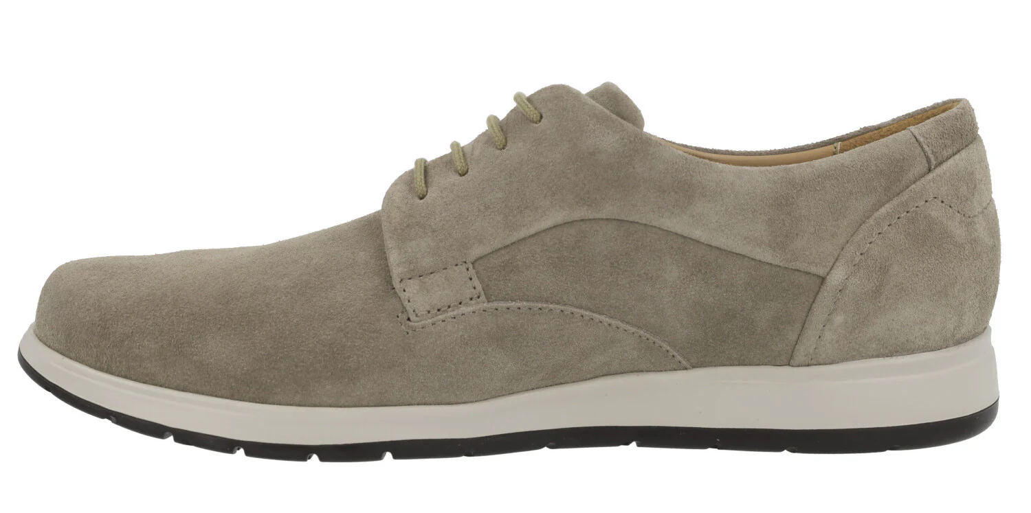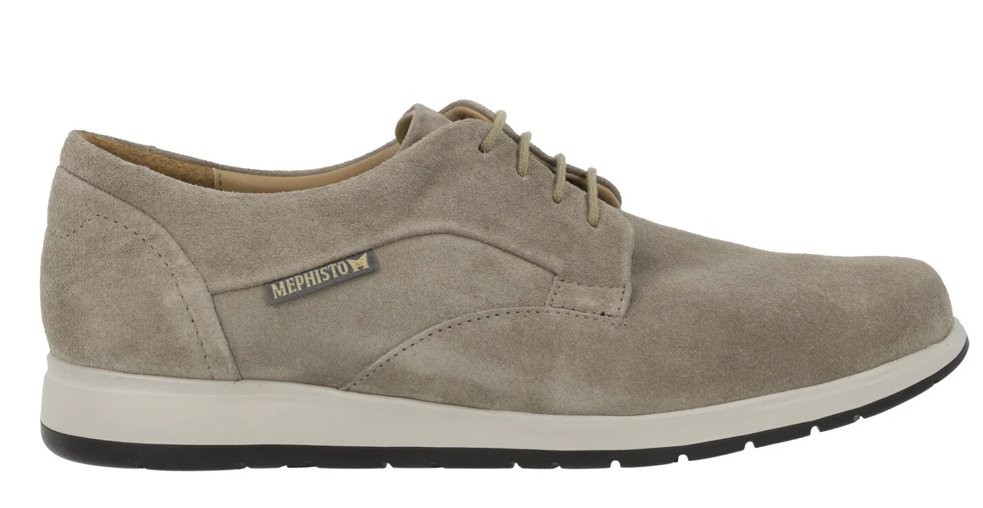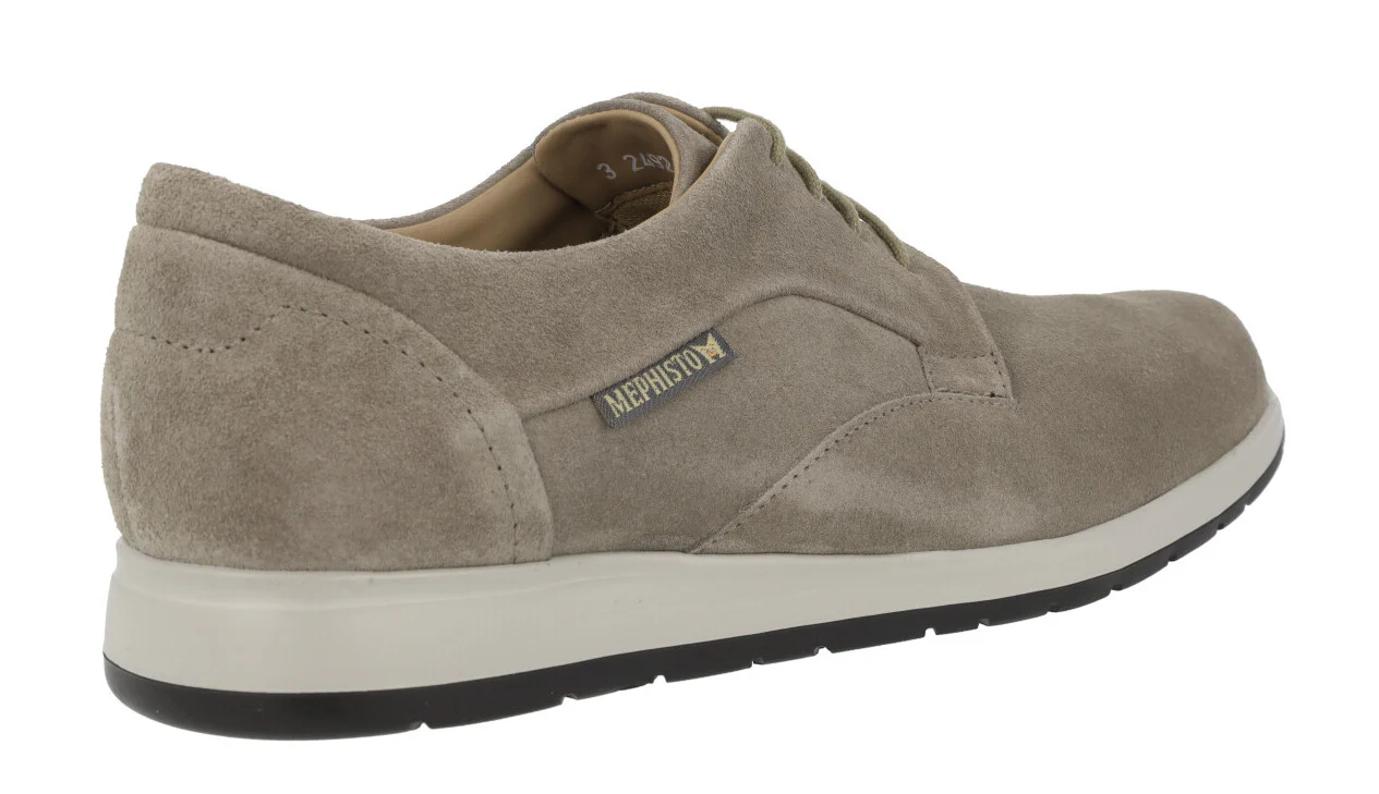Zapatos de cordones para hombre de la marca Mephisto modelo Valerio 2201. Zapatos elaborados en piel serraje, disponibles en taupe (warm grey). Plantillas de piel extraíbles con sistema Soft Air, de gran amortiguación y transpirabilidad. Piso de caucho natural, Extralight, de peso mínimo. Con shock absorber, sistema de reducción de impactos al caminar.