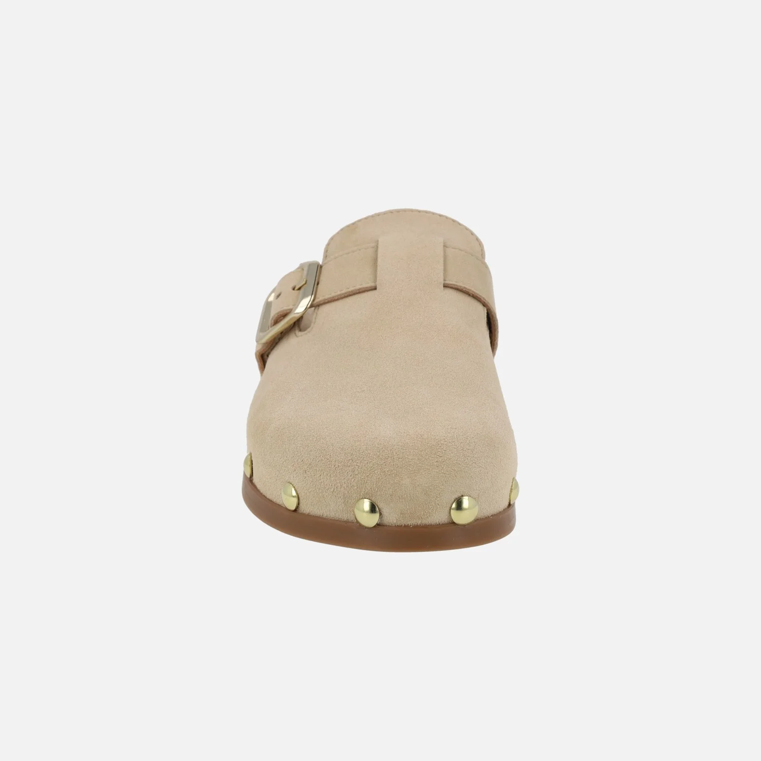 Preciosos zuecos de la marca Alpe, modelo 5395 Alive, disponibles en baby silk cuero o arena (beige). Preciosos zuecos de serraje con adorno de hebilla lateral y detalle de tachas metálicas doradas. Interior textil. Plataforma de aproximadamente 3 cm de altura. Suela sintética. Made in Spain.