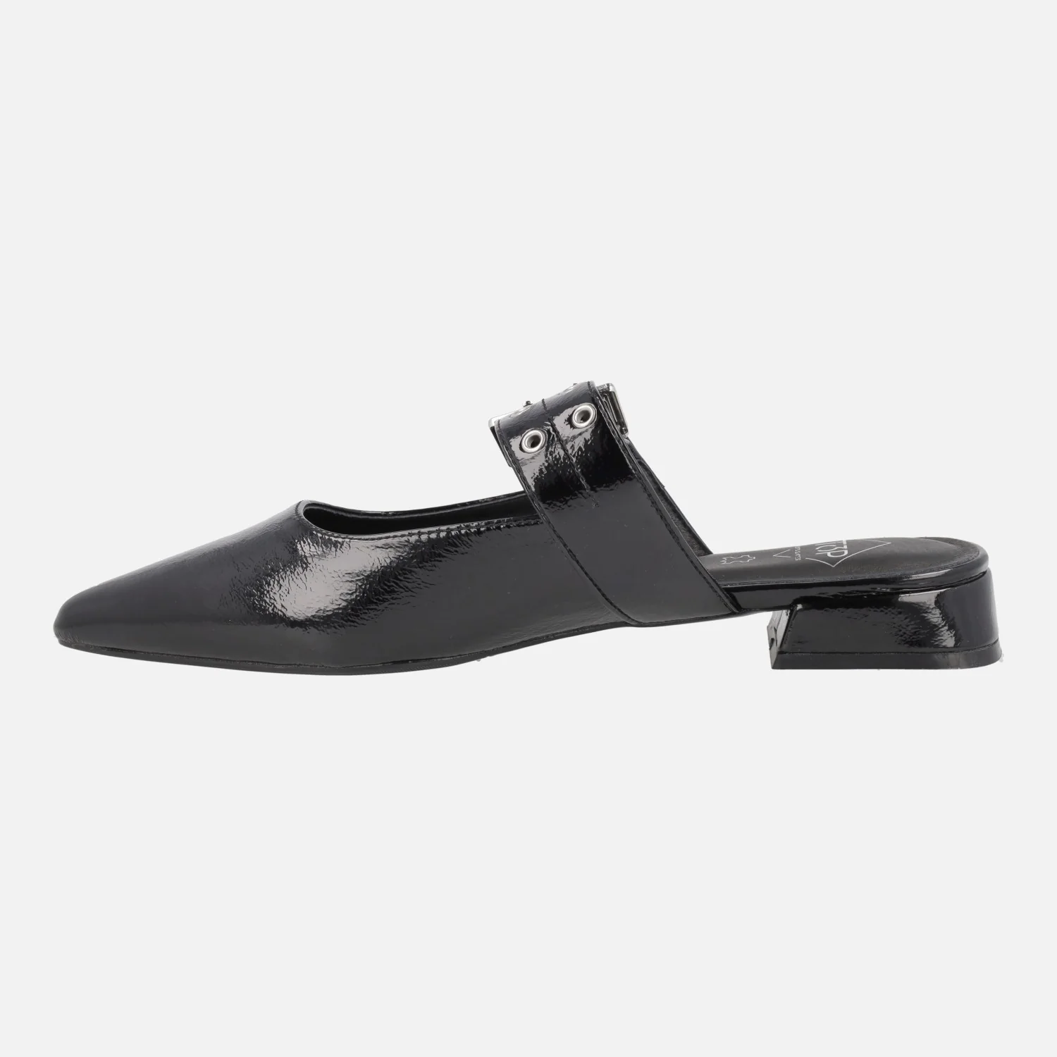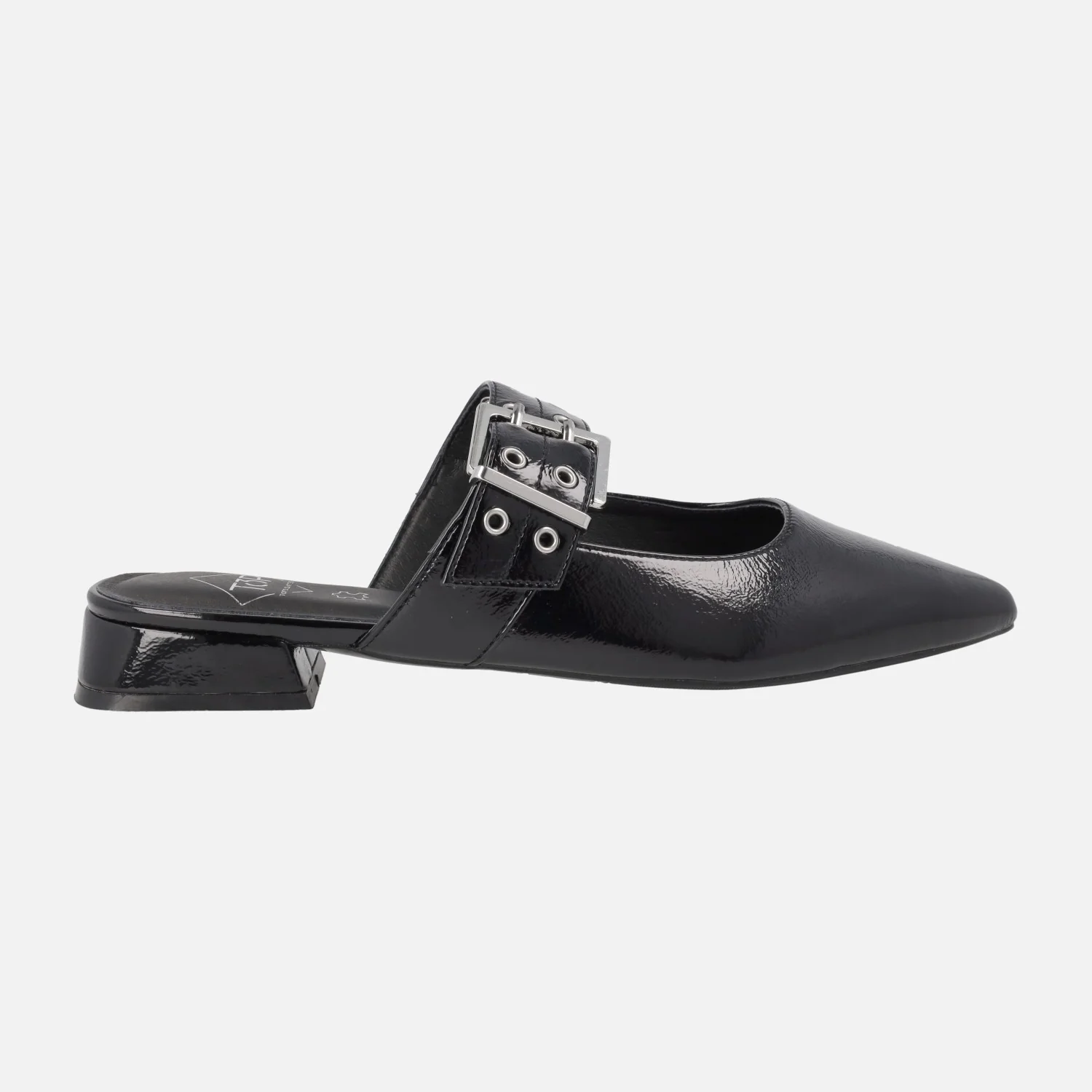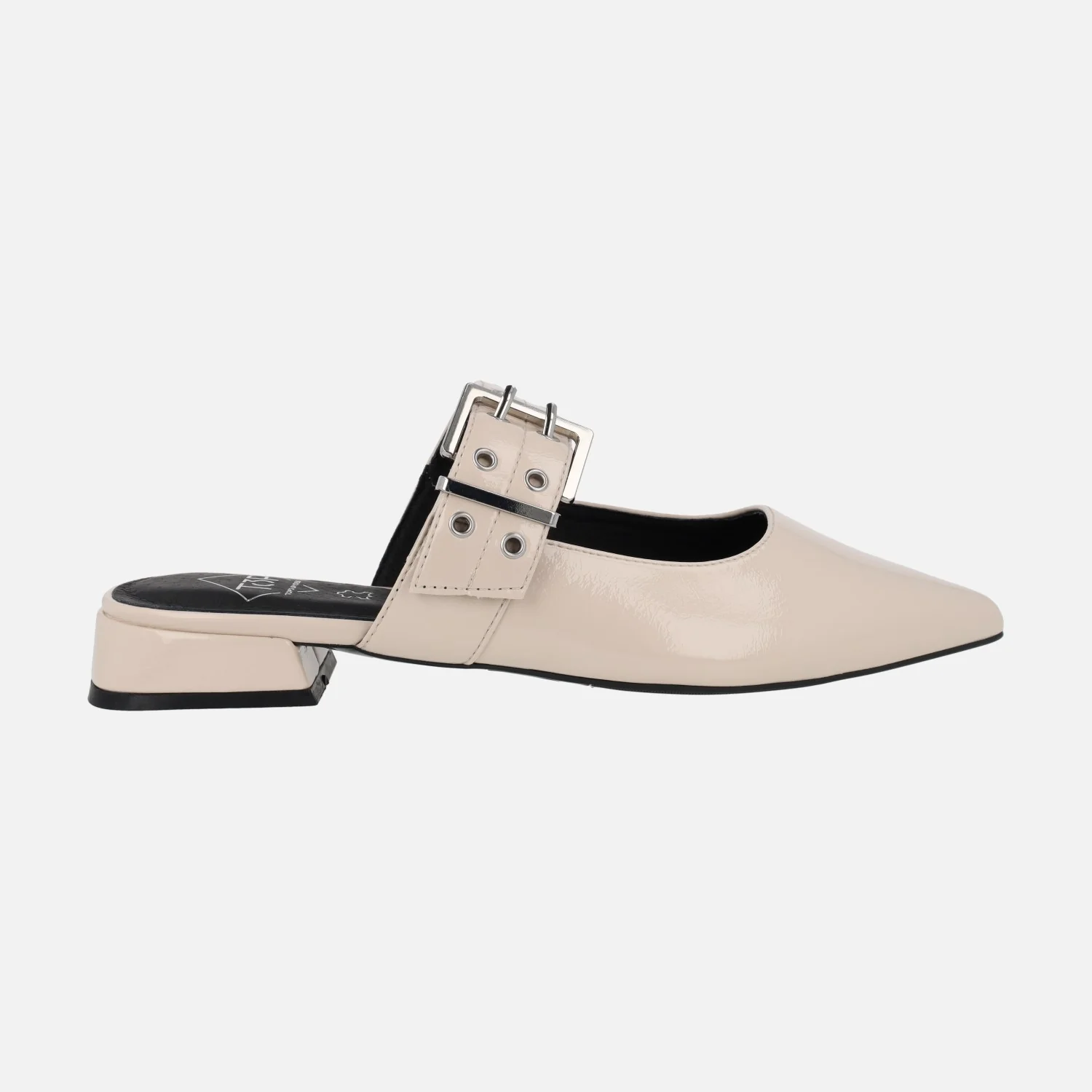 Zuecos de charol marca Top3 modelo SE25398 disponibles en charol negro o beige (hielo). Zuecos destalonados con tira al empeine regulable con hebilla. Interiores forrados de piel. Horma afilada. Piso sintético con tacones de 2,5 cms de altura.