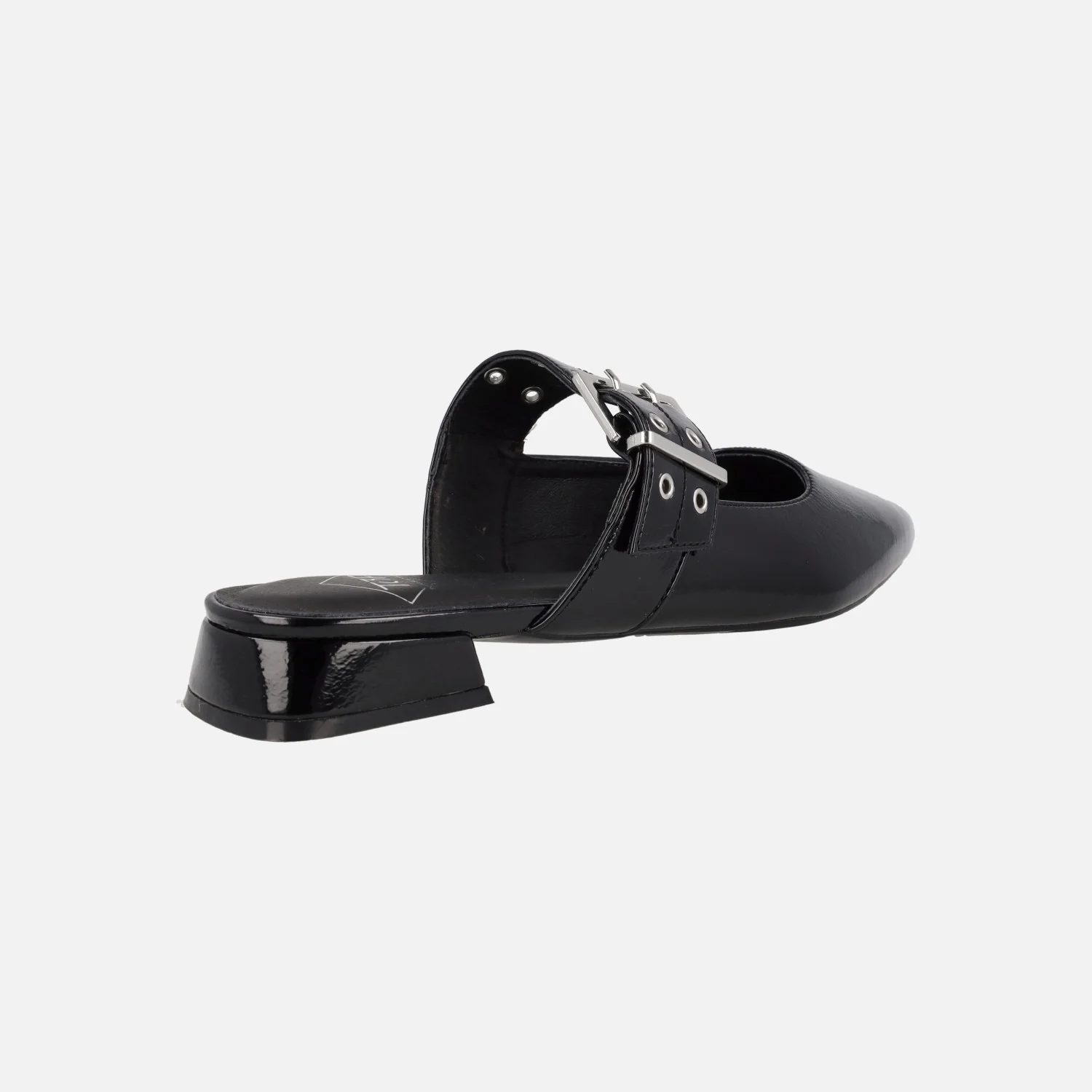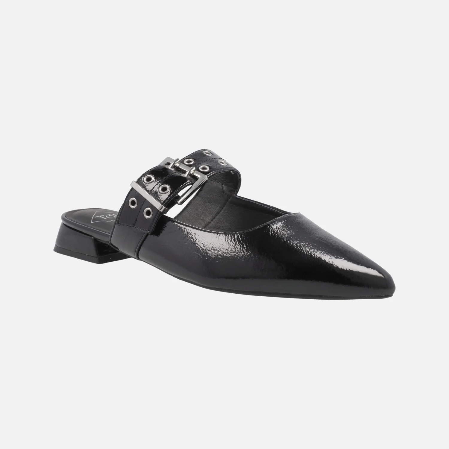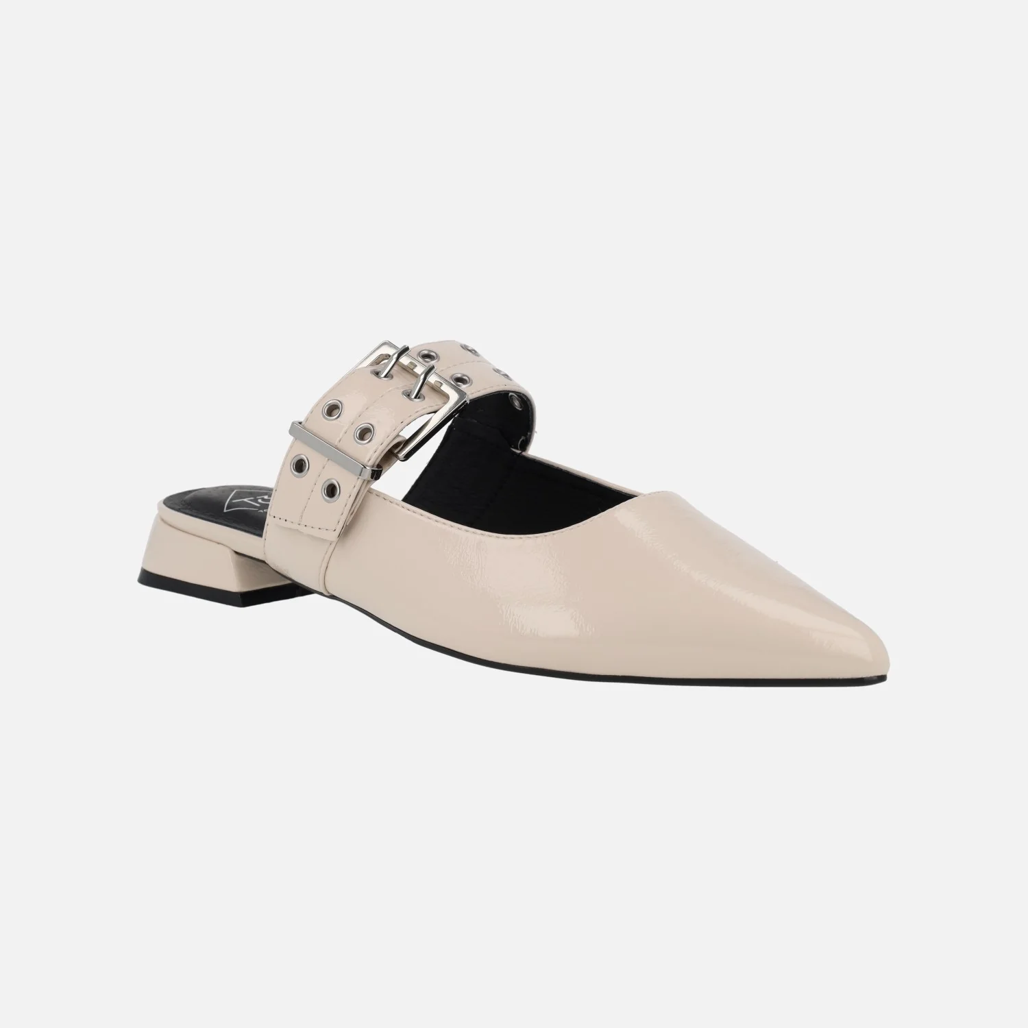 Zuecos de charol marca Top3 modelo SE25398 disponibles en charol negro o beige (hielo). Zuecos destalonados con tira al empeine regulable con hebilla. Interiores forrados de piel. Horma afilada. Piso sintético con tacones de 2,5 cms de altura.