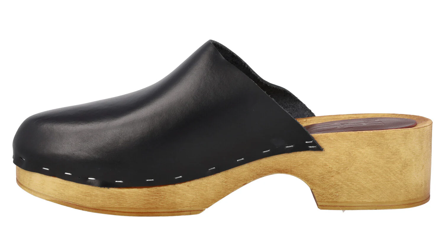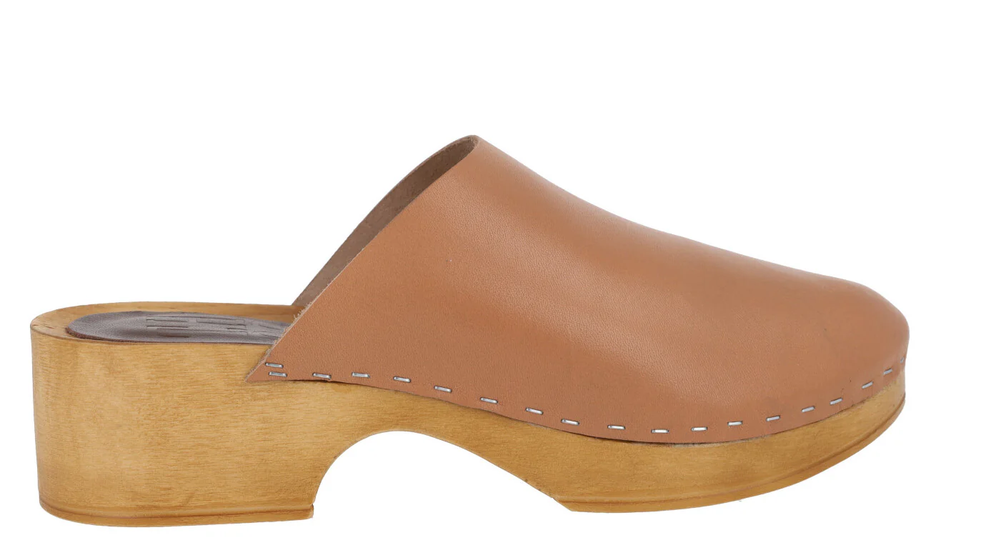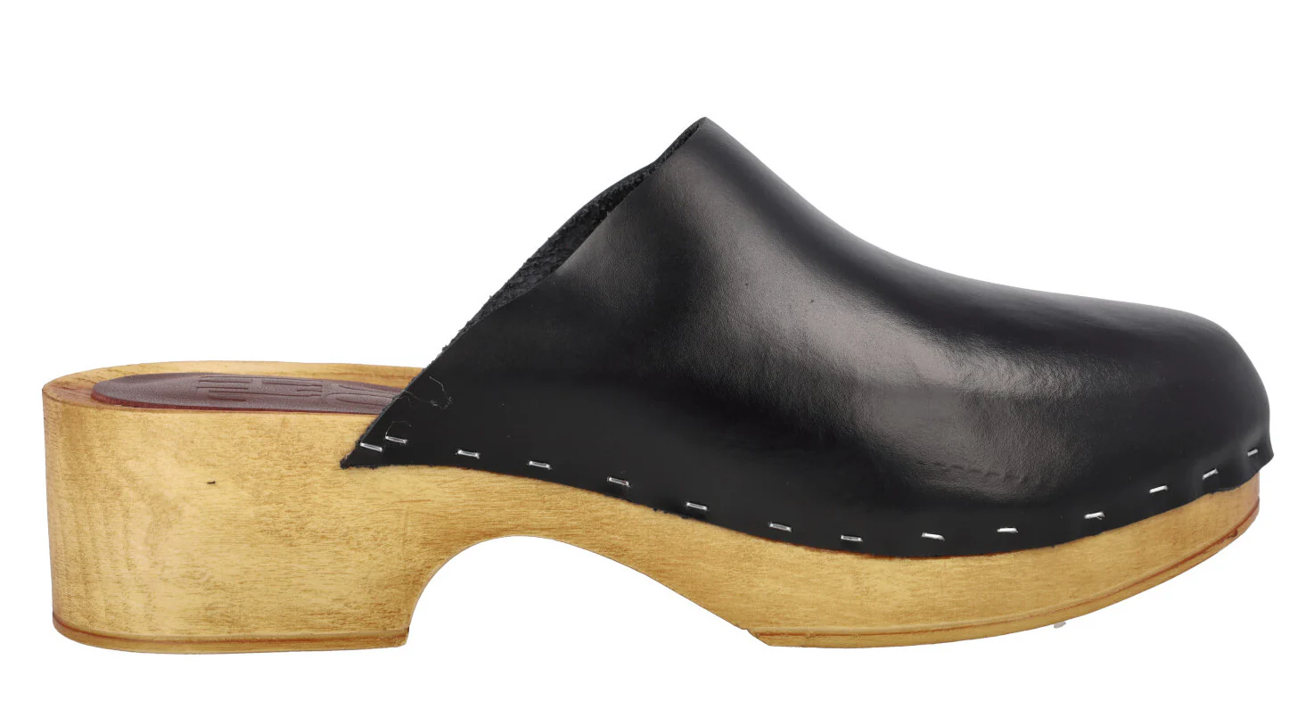 Zuecos de piel de la marca Planet, modelo 41-GG. Zuecos de piel, disponibles en color cuero o negros, con plataforma y tacón imitando madera, muy ligeros. Pieza de piel en la planta. Altura trasera 4,5 cms (2,5 cms plataforma delantera).