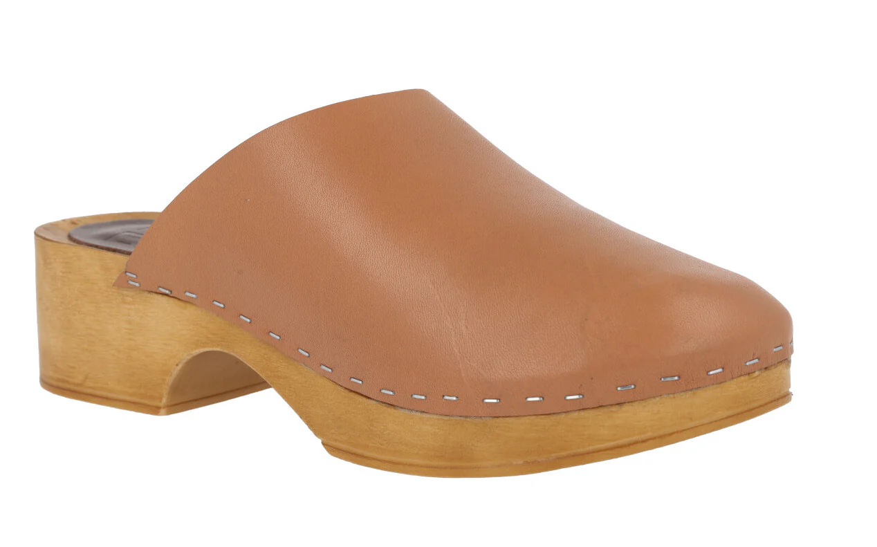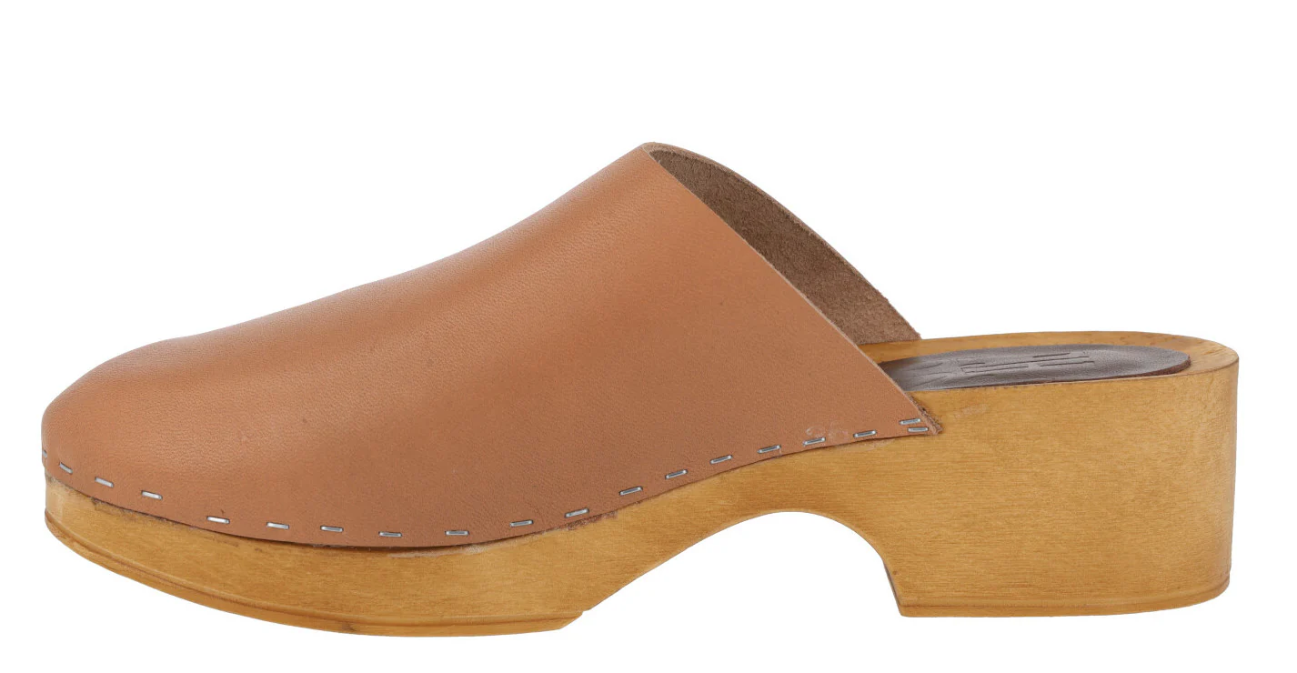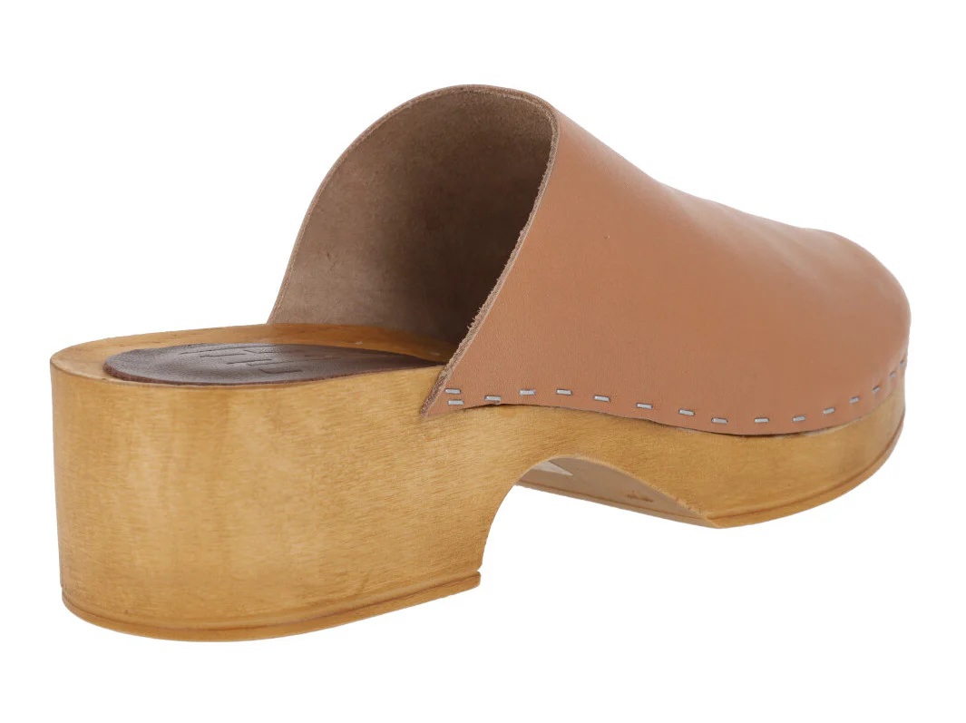 Zuecos de piel de la marca Planet, modelo 41-GG. Zuecos de piel, disponibles en color cuero o negros, con plataforma y tacón imitando madera, muy ligeros. Pieza de piel en la planta. Altura trasera 4,5 cms (2,5 cms plataforma delantera).