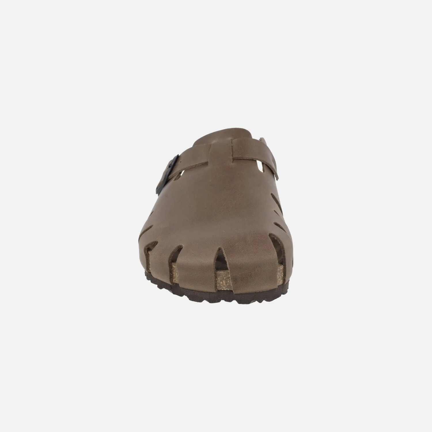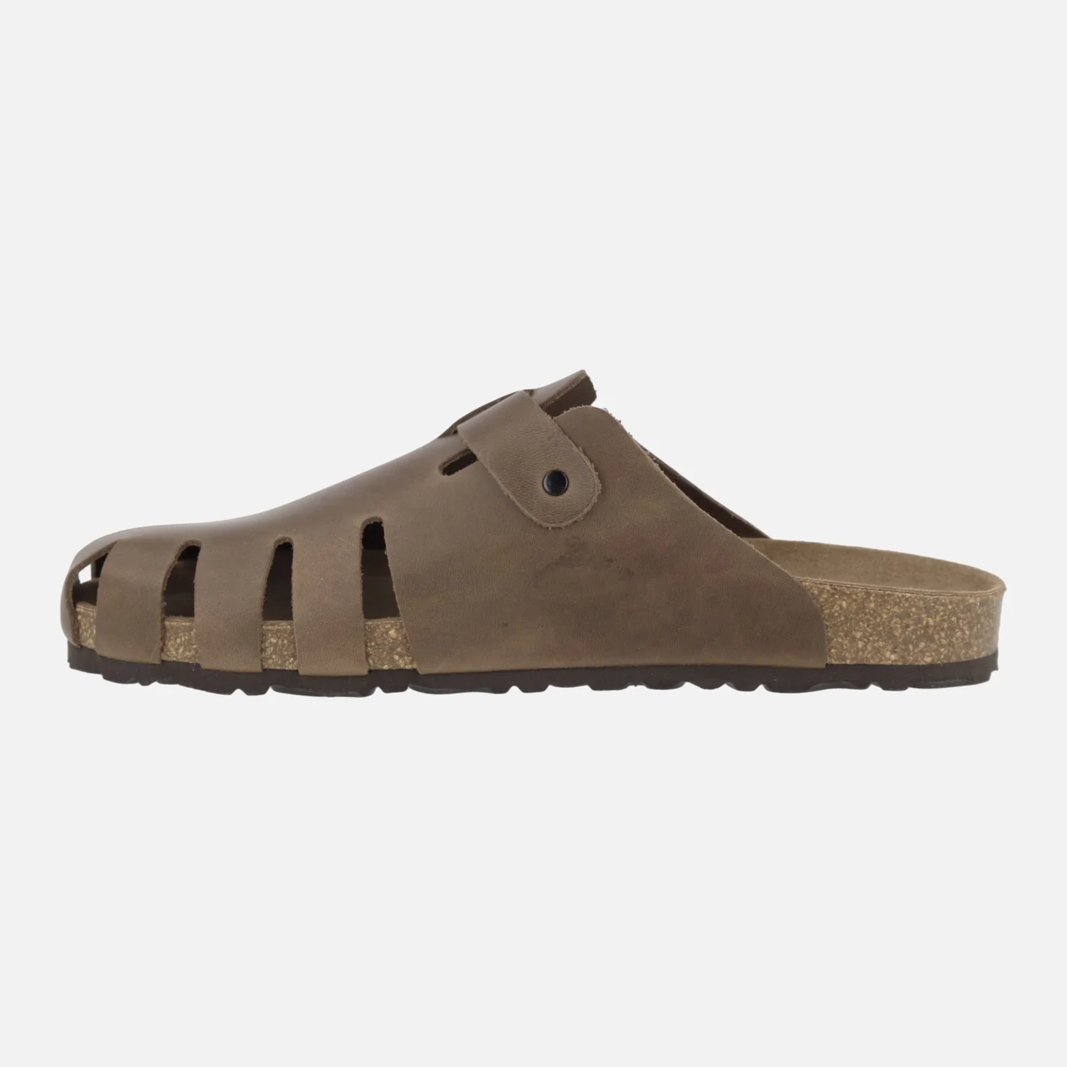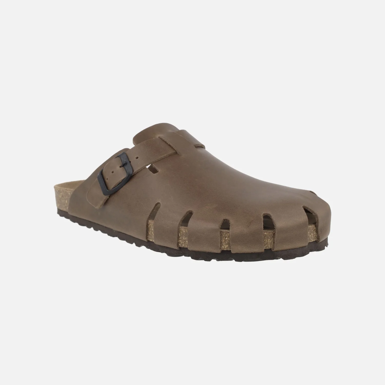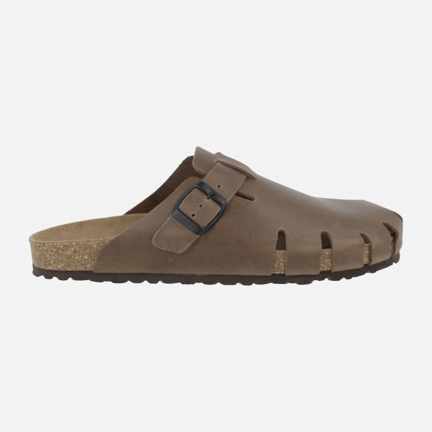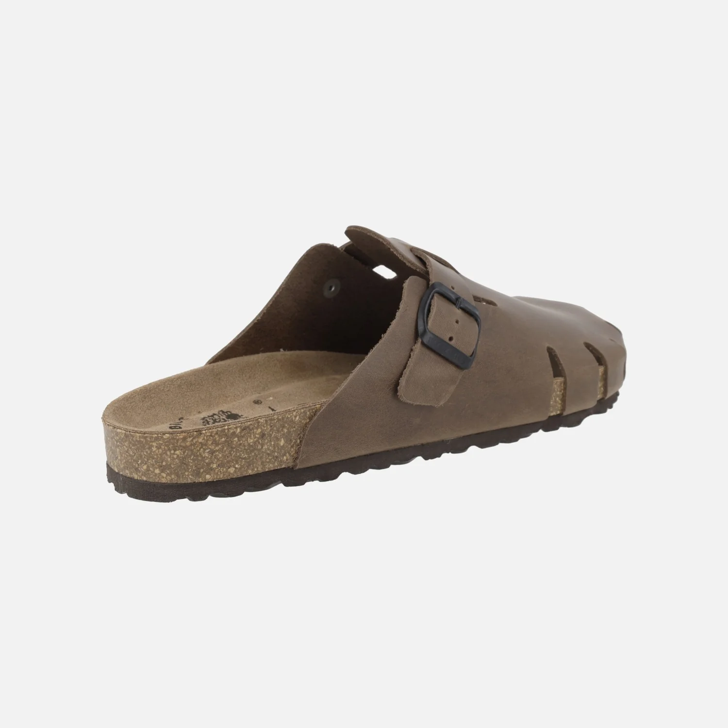 Zuecos para hombre de la marca Interbios modelo 9570, disponibles en Pardo (marrón oscuro). Zuecos de piel engrasada (pueden presentar imperfecciones subsanables echando grasa) con una tira ajustable con hebilla. Interiores de piel. Planta bio. Suela de goma. Entre suela de corcho. Hechos en Elche, Spain.