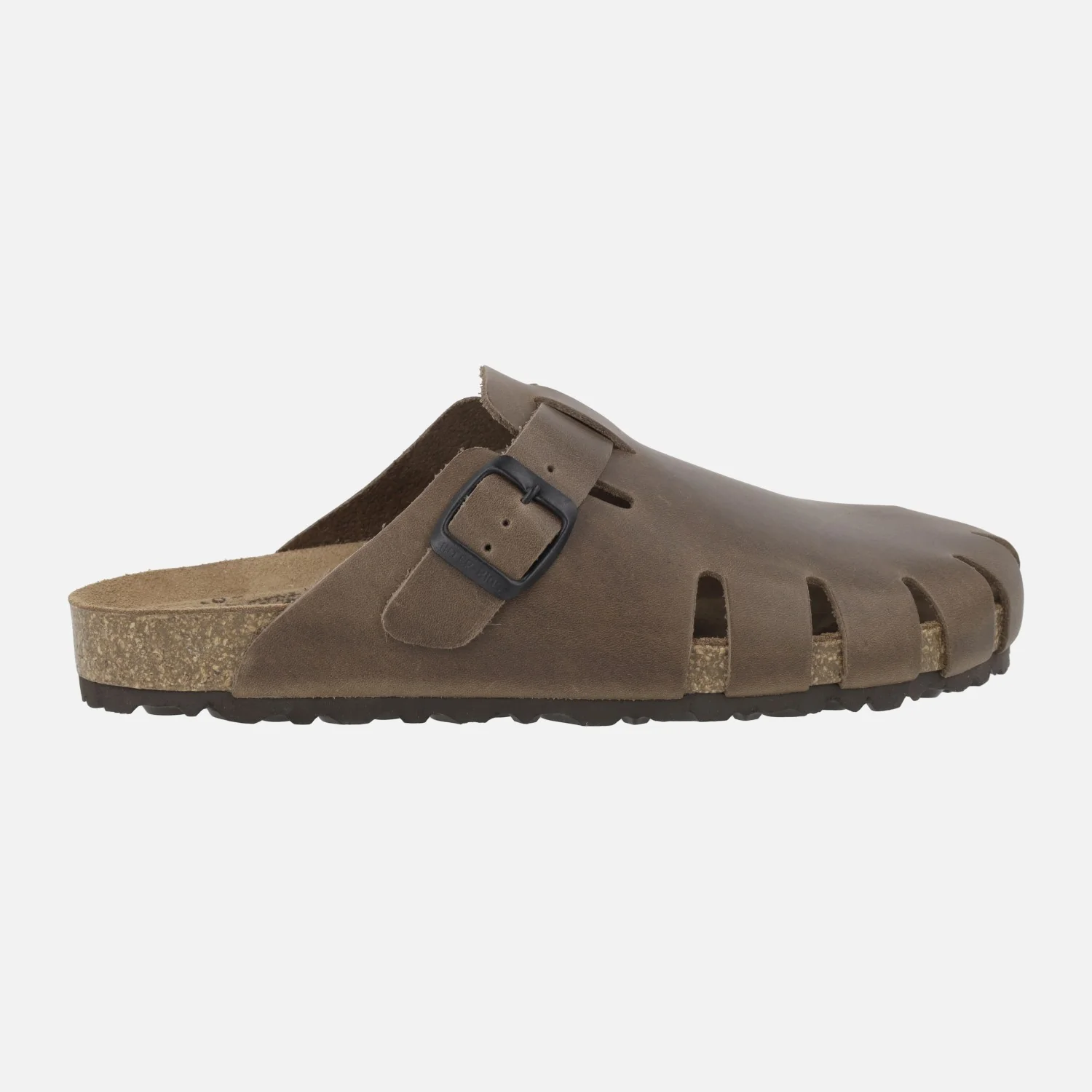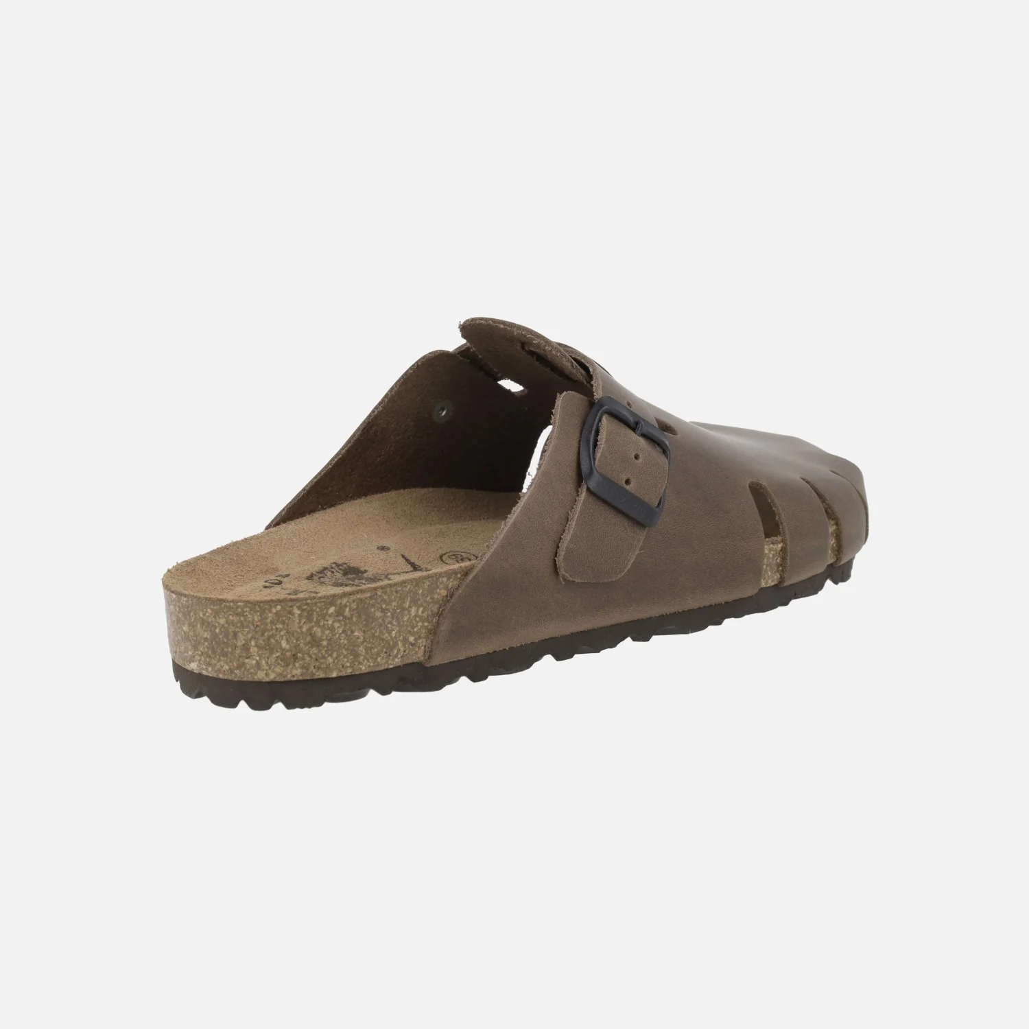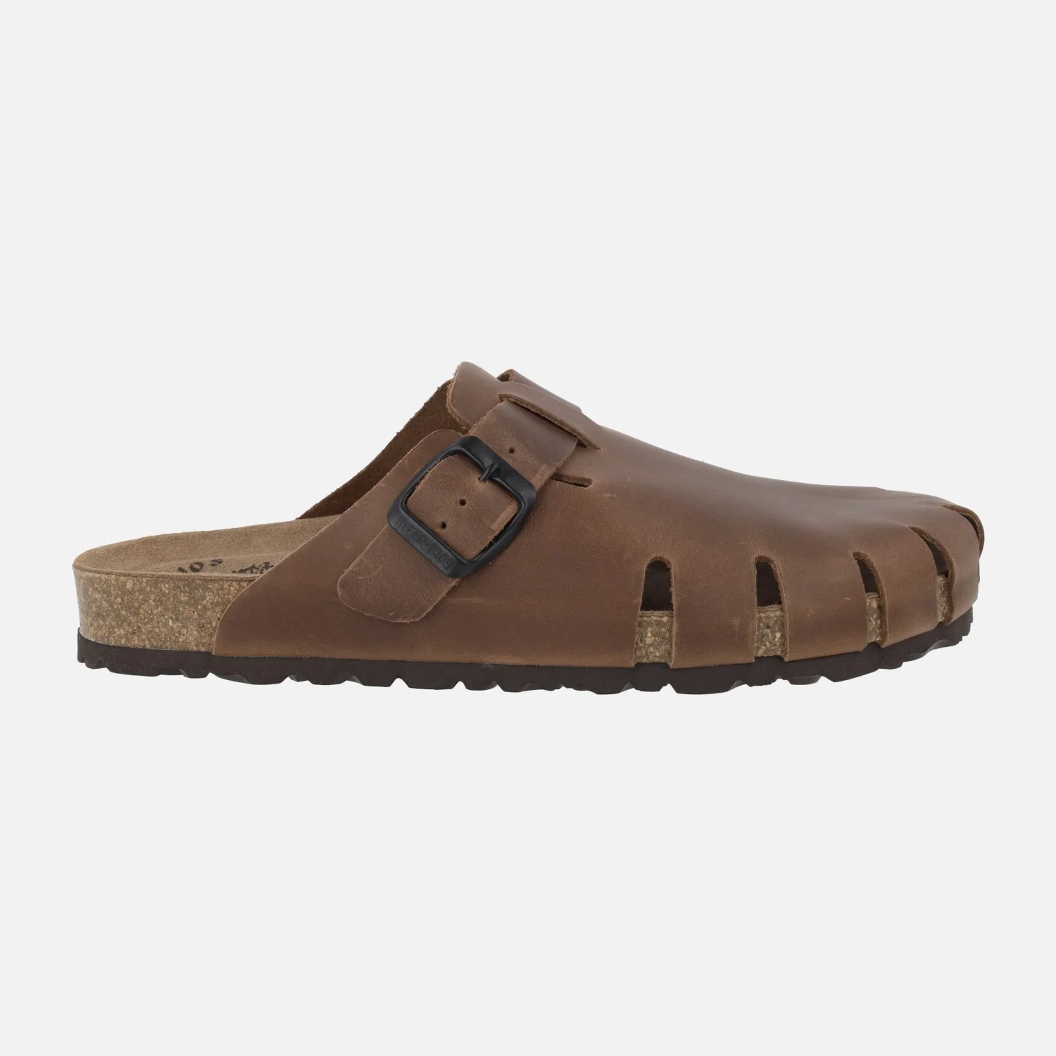 Zuecos para mujer de la marca Interbios modelo 7506, disponibles en Pardo (marrón oscuro) y en Ours (marrón cuero). Zuecos de piel engrasada (pueden presentar imperfecciones subsanables echando grasa) con una tira ajustable con hebilla. Interiores de piel. Planta bio. Suela de goma. Entre suela de corcho. Altura trasera 2,5 cm aproximadamente (2 cm parte delantera). Hechos en Elche, Spain.