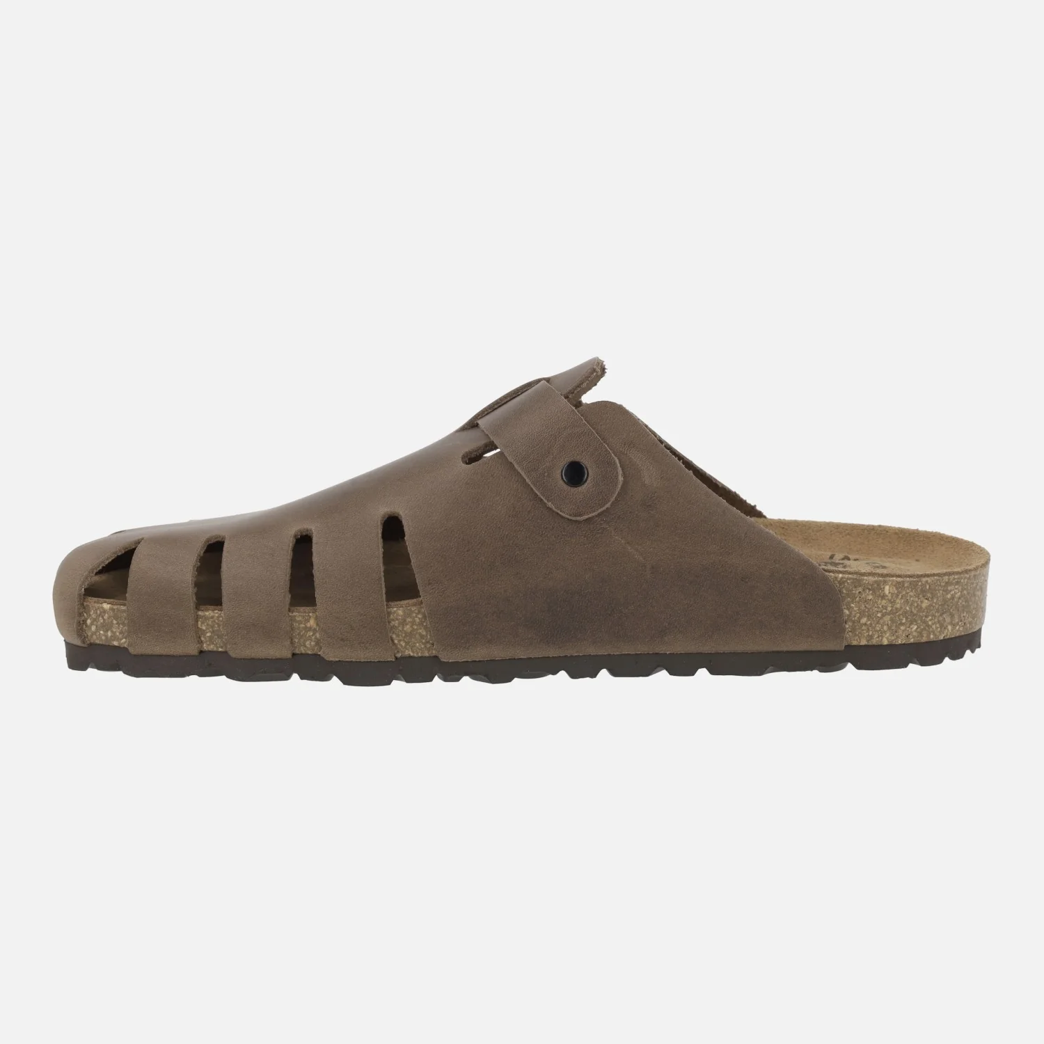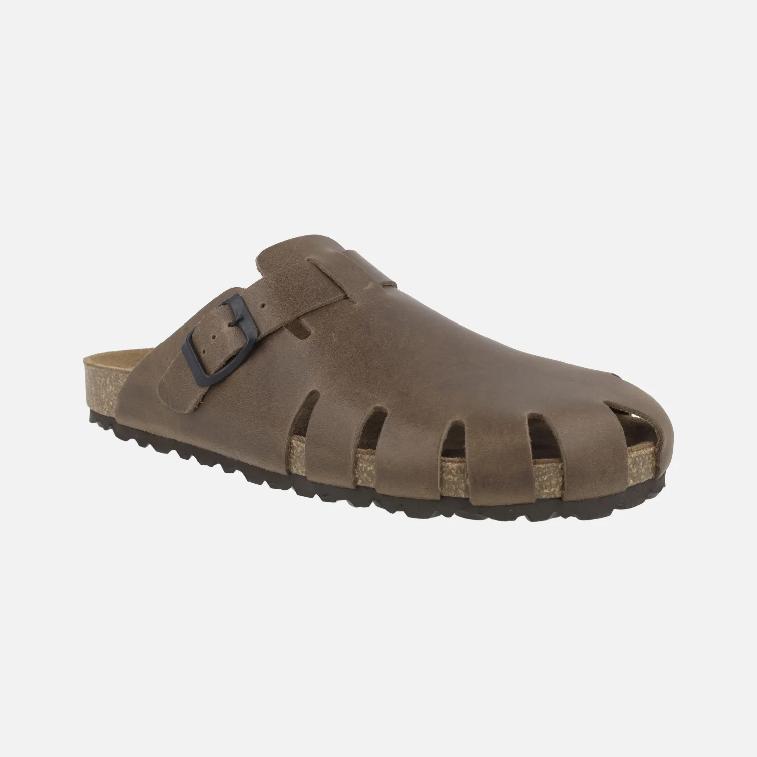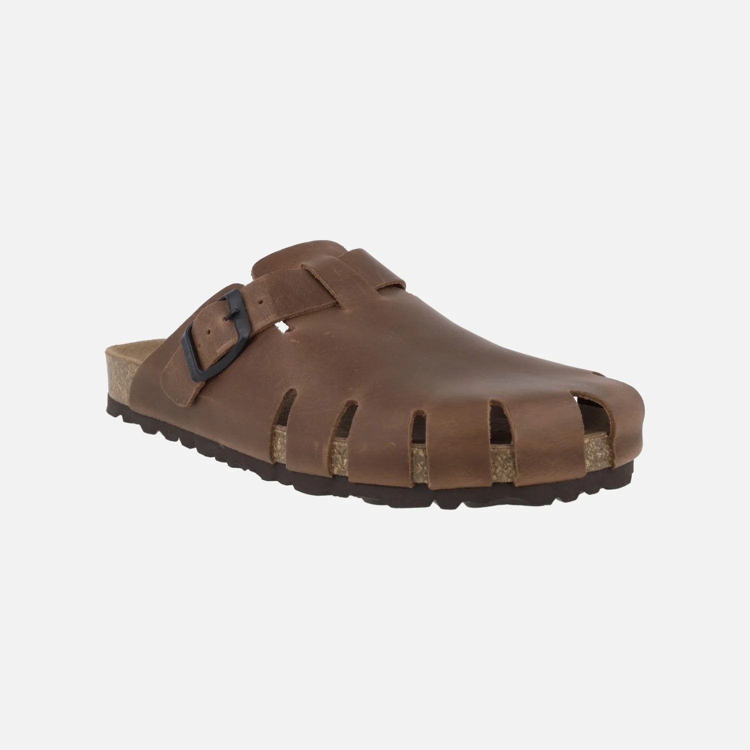 Zuecos para mujer de la marca Interbios modelo 7506, disponibles en Pardo (marrón oscuro) y en Ours (marrón cuero). Zuecos de piel engrasada (pueden presentar imperfecciones subsanables echando grasa) con una tira ajustable con hebilla. Interiores de piel. Planta bio. Suela de goma. Entre suela de corcho. Altura trasera 2,5 cm aproximadamente (2 cm parte delantera). Hechos en Elche, Spain.