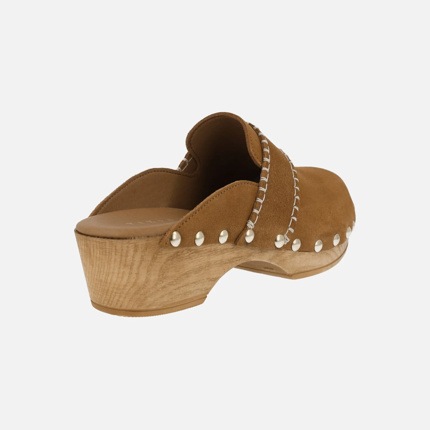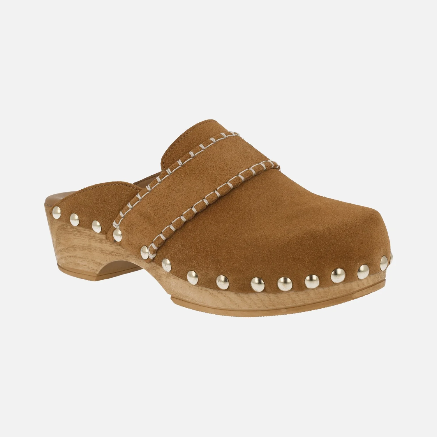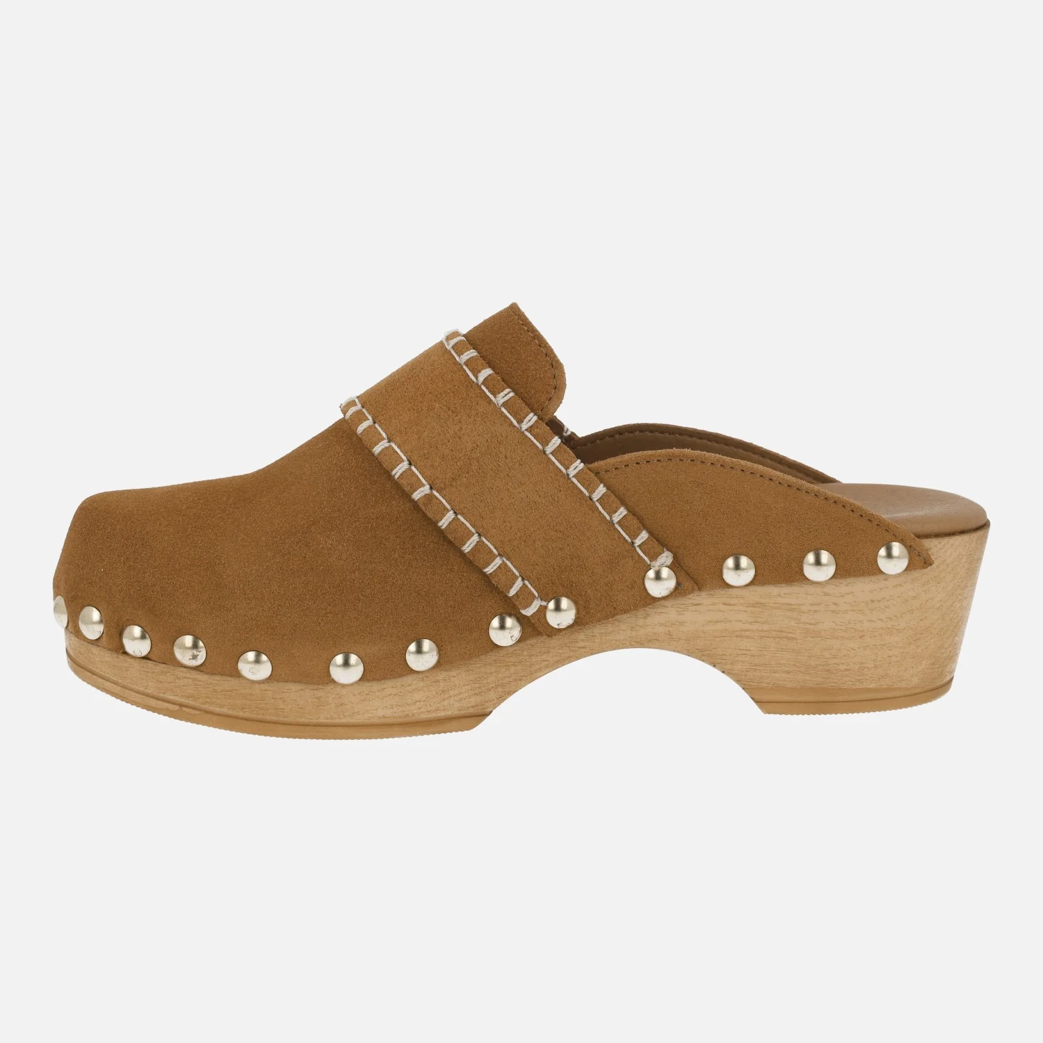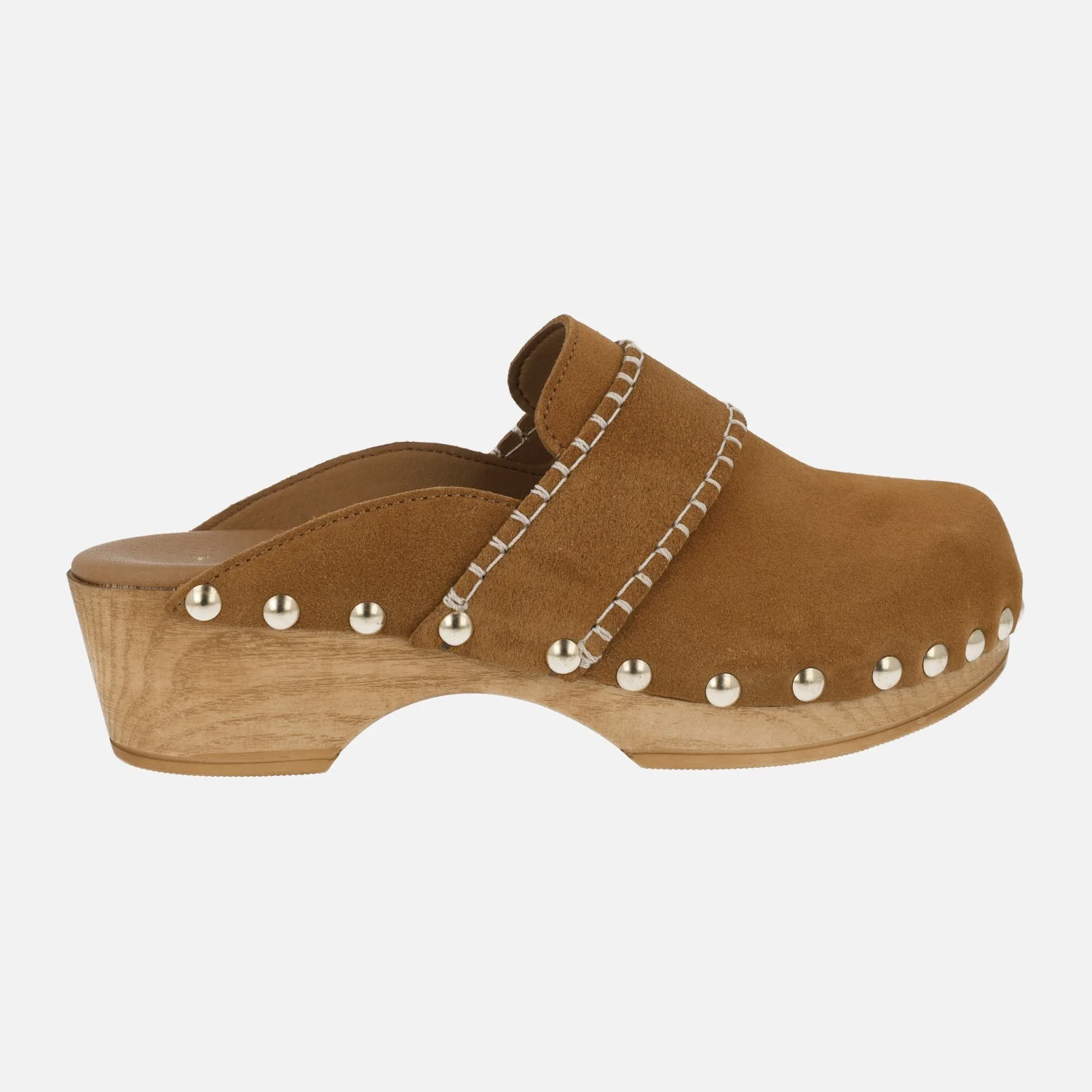 Elegantes zuecos de piel marca Tiziana modelo Zueco 10. Zuecos con exterior en piel serraje color cuero, con tira decorativa en el empeine pespunteada en beige clarito. Interior mixto de piel y otros materiales. Tachas metálicas doradas en la unión con el piso. Piso y plataforma imitando madera, con una altura trasera de 5 cms y delantera de 2,5 cms.